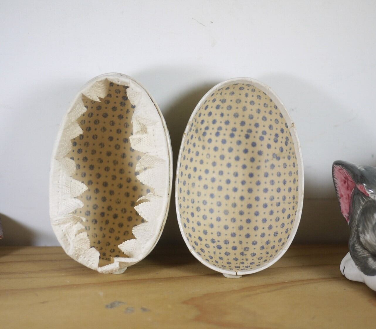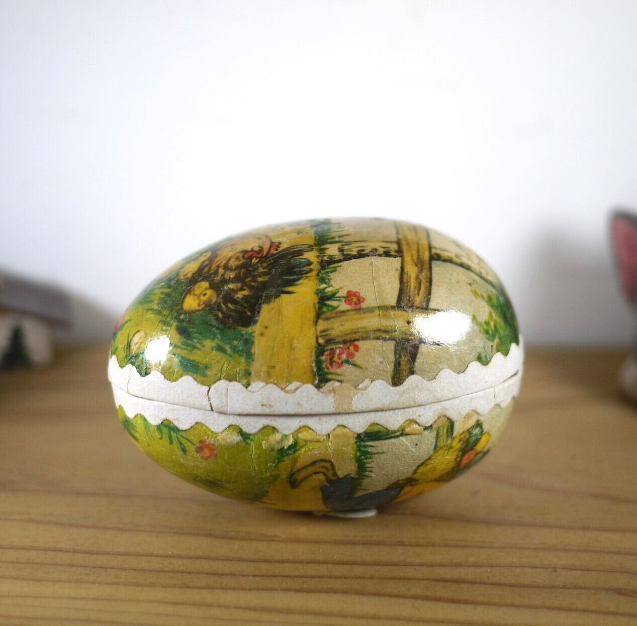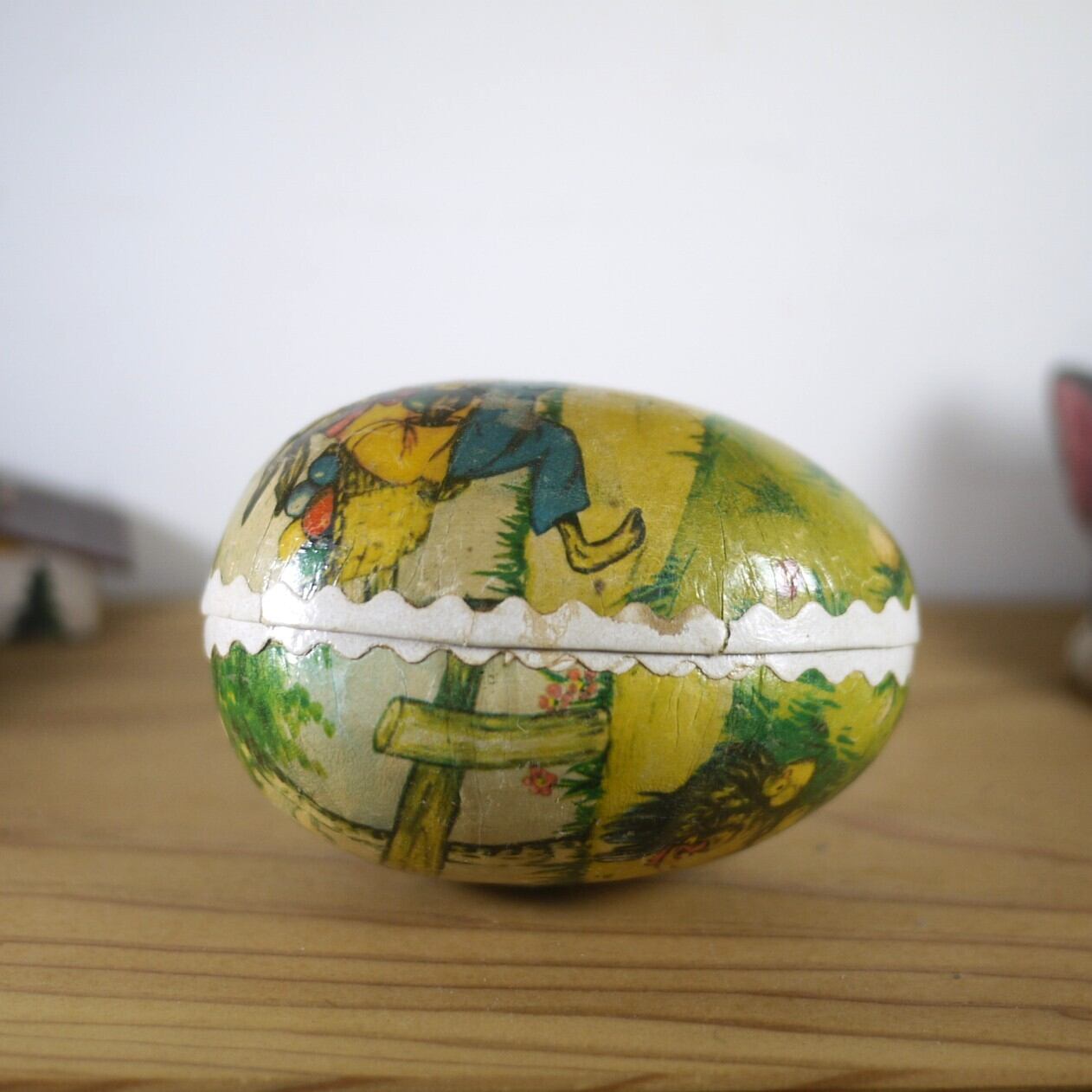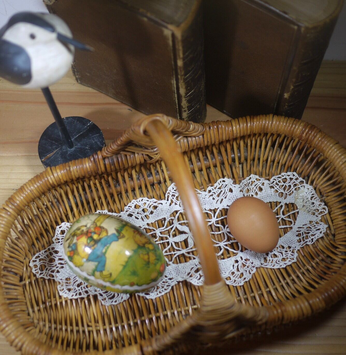 ニワトリとひよこの背後に置かれた赤い卵がみえています。
