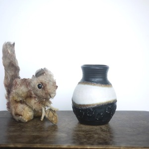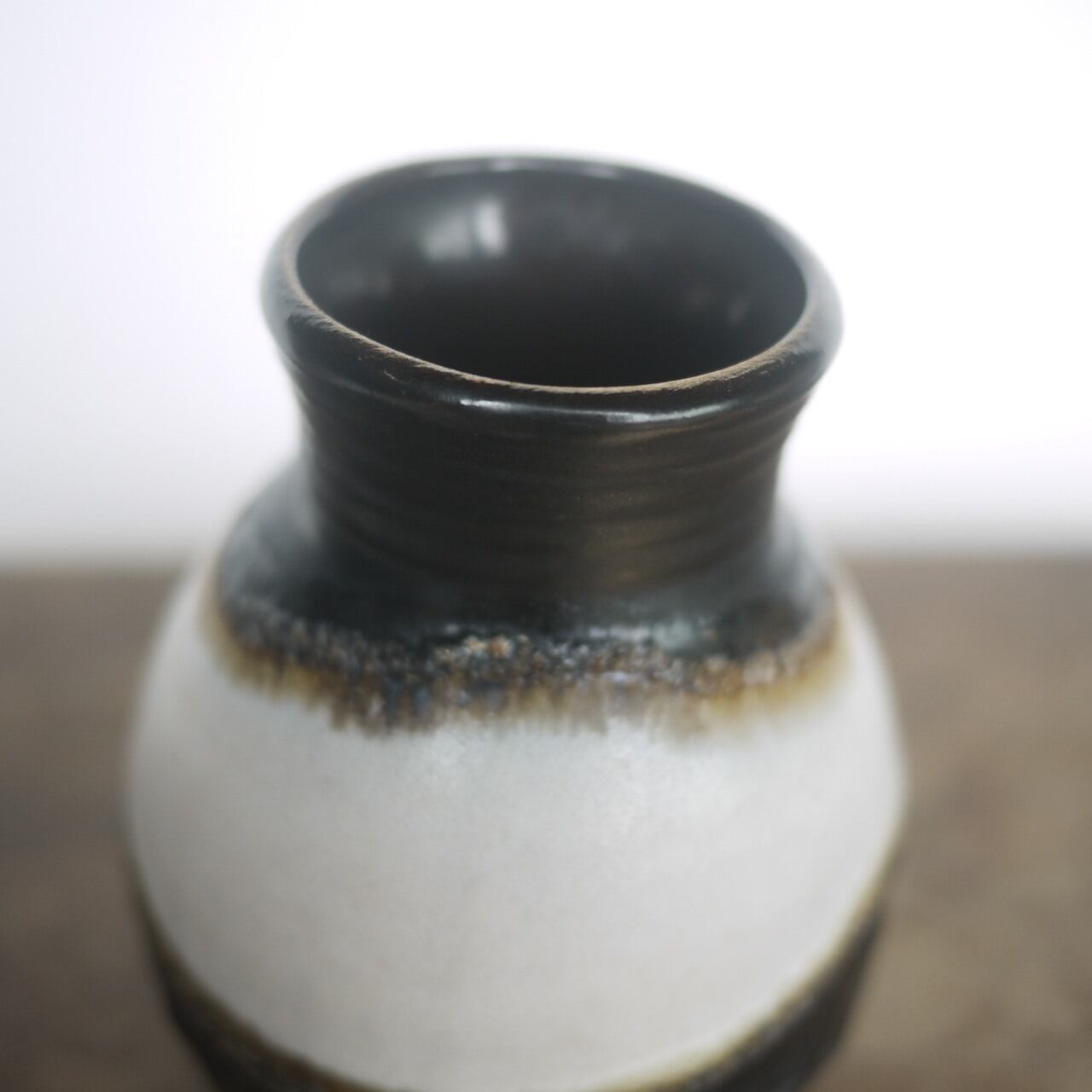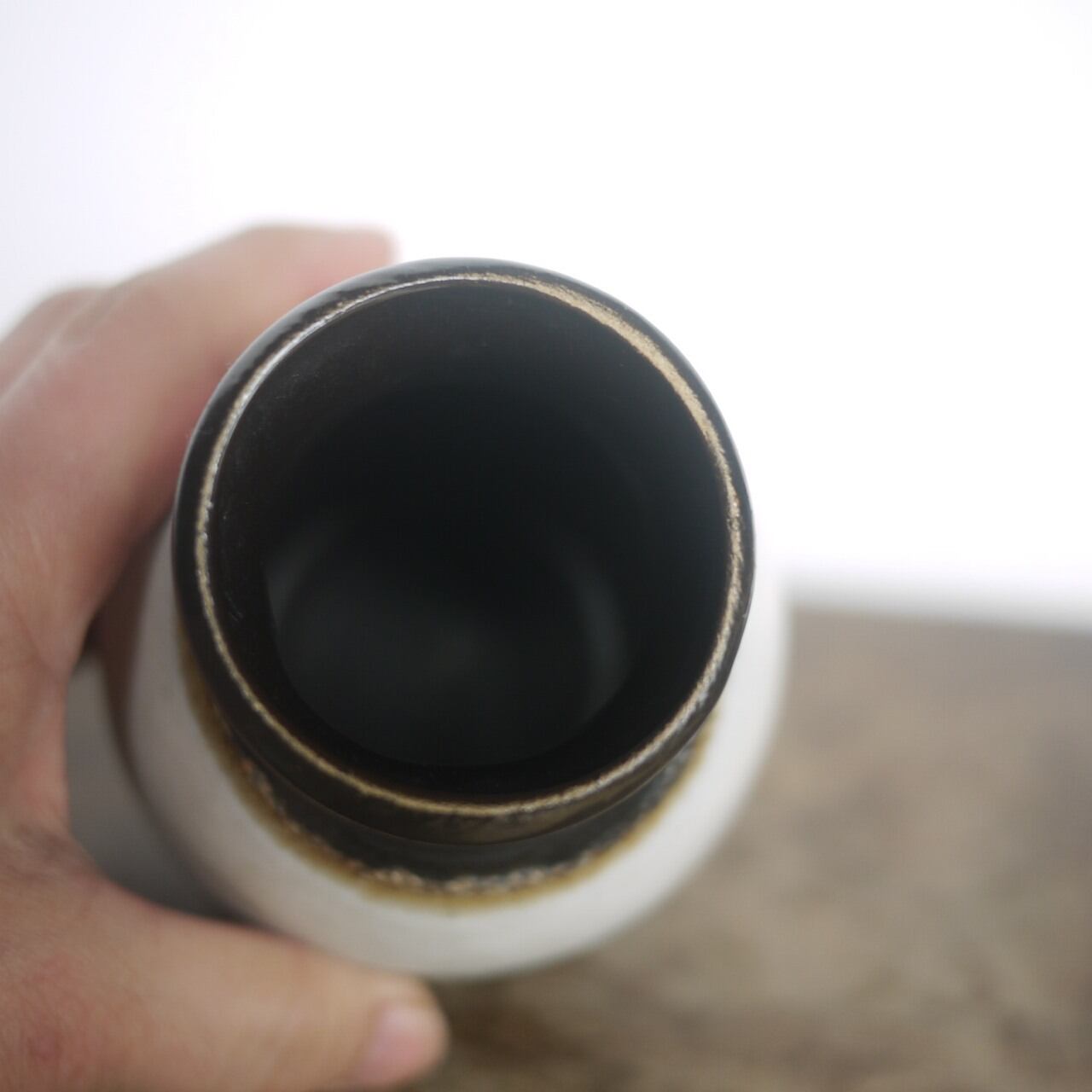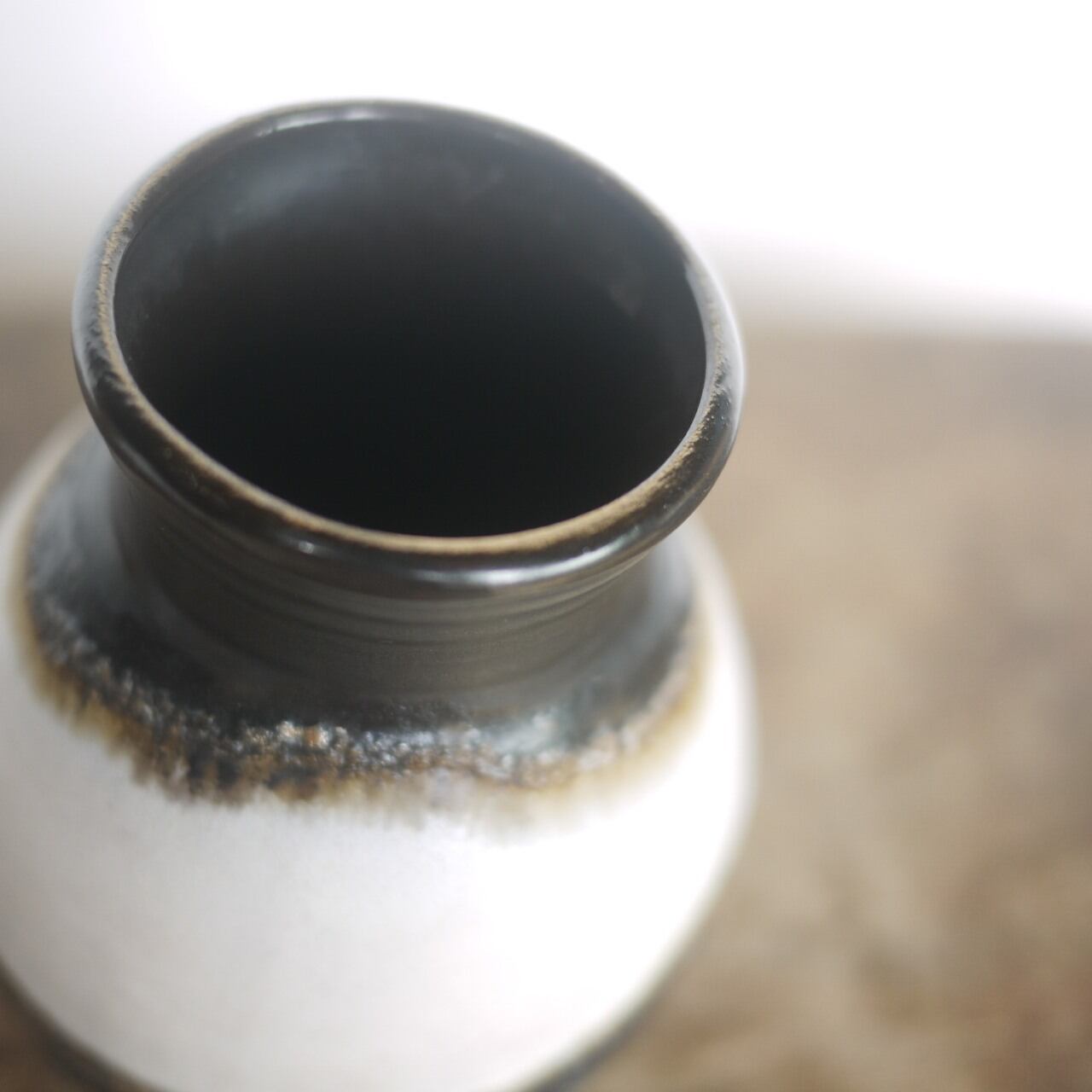 こげ茶と白のツートーンカラーでプックリした壺の形。