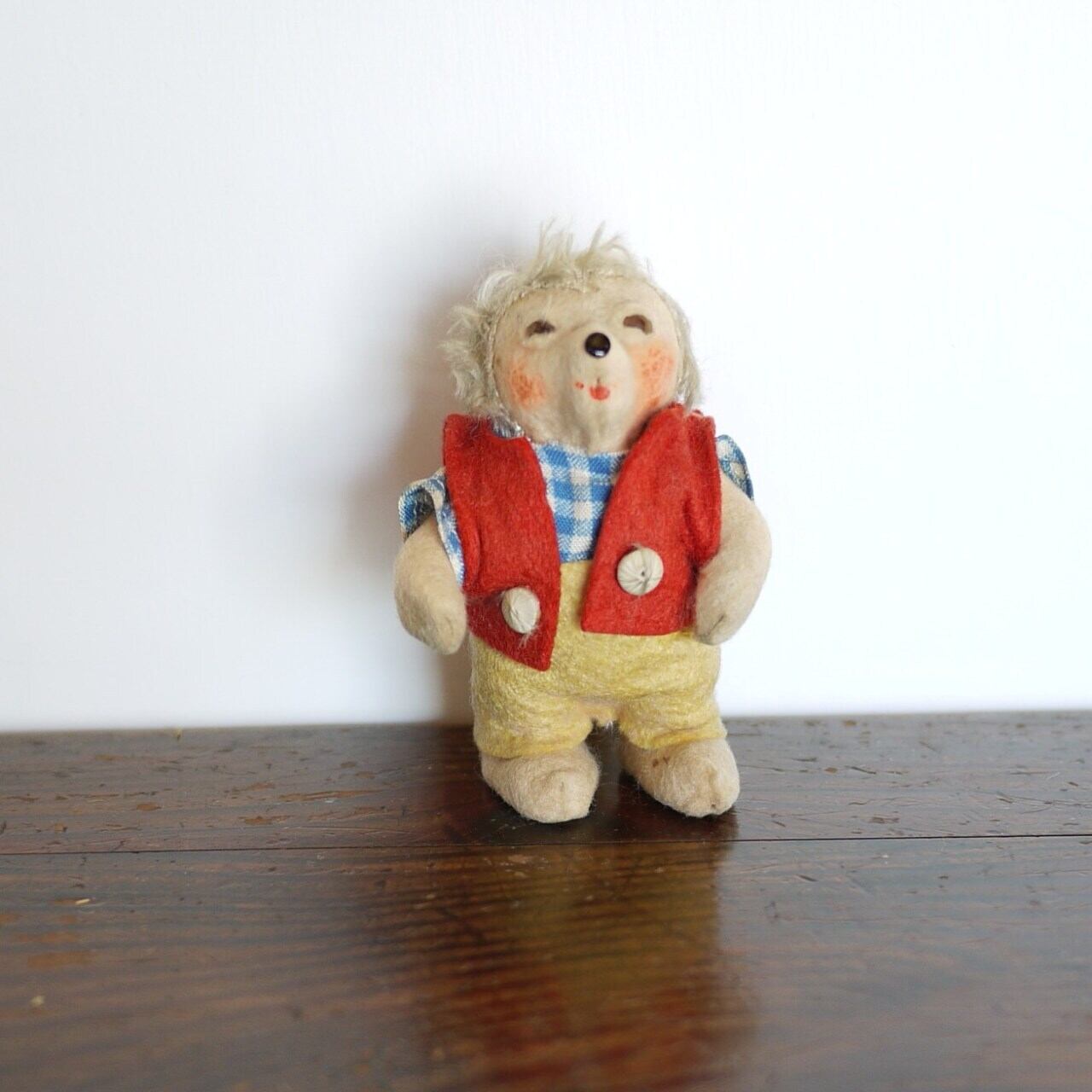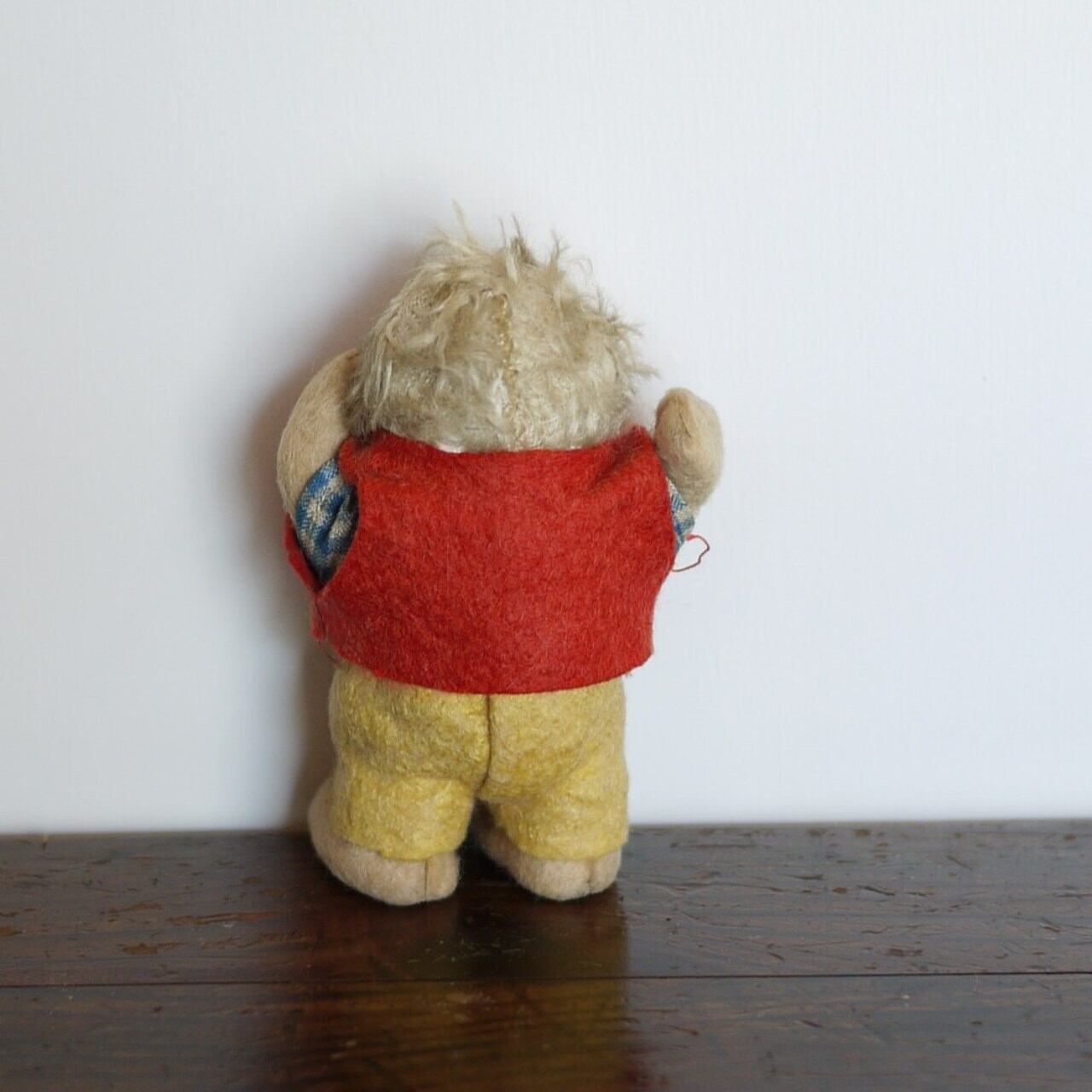 赤いベストにギンガムシャツ、黄色いパンツをはいています。