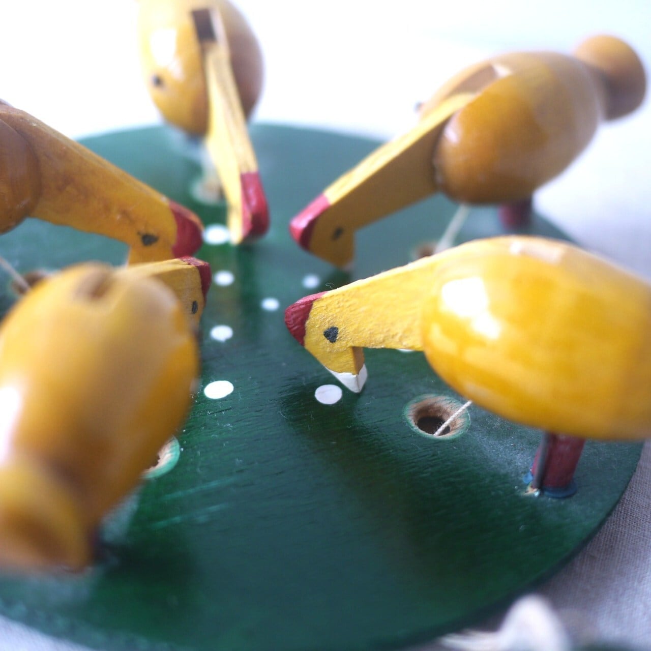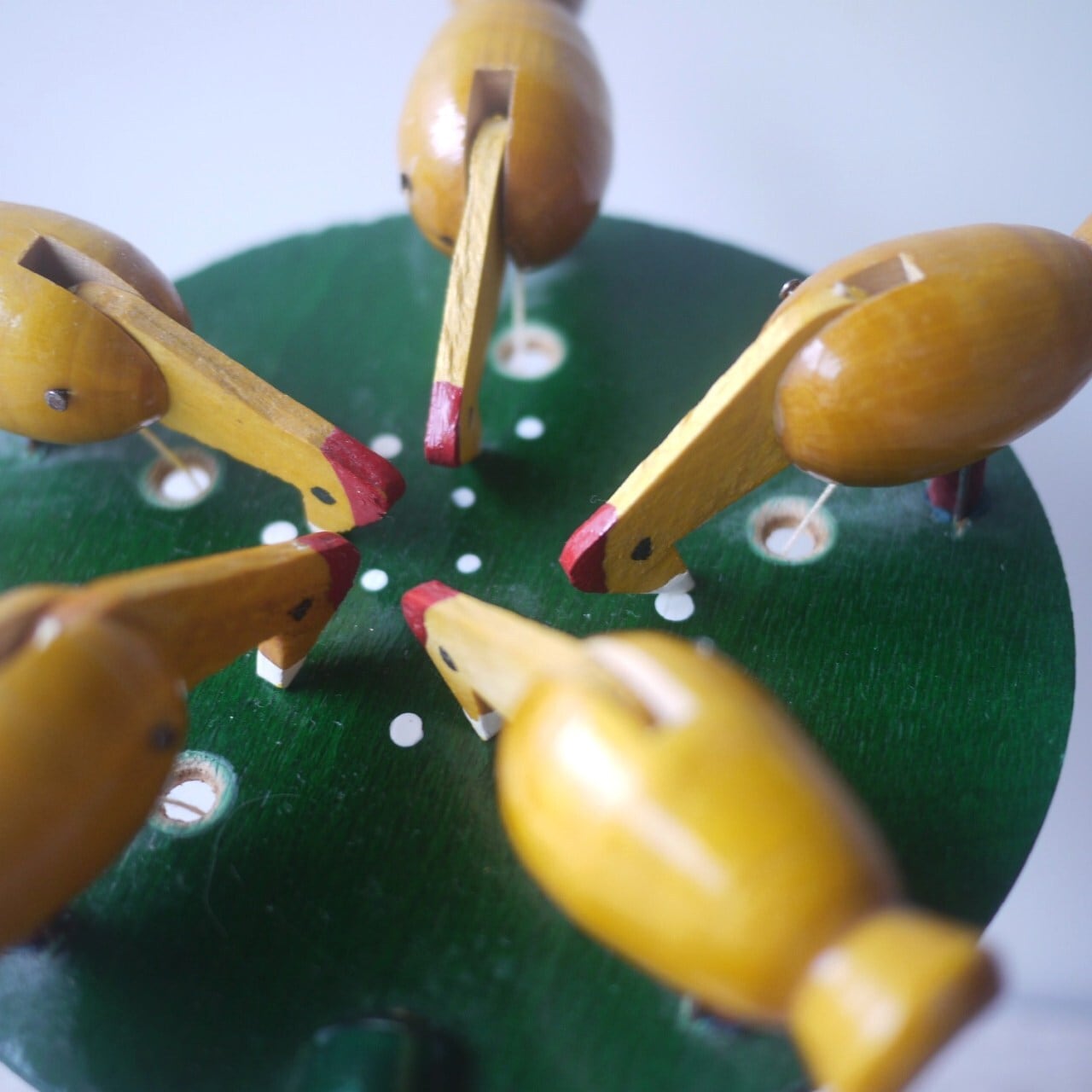 おもりの振れにあわせて、鳥がえさをついばみ