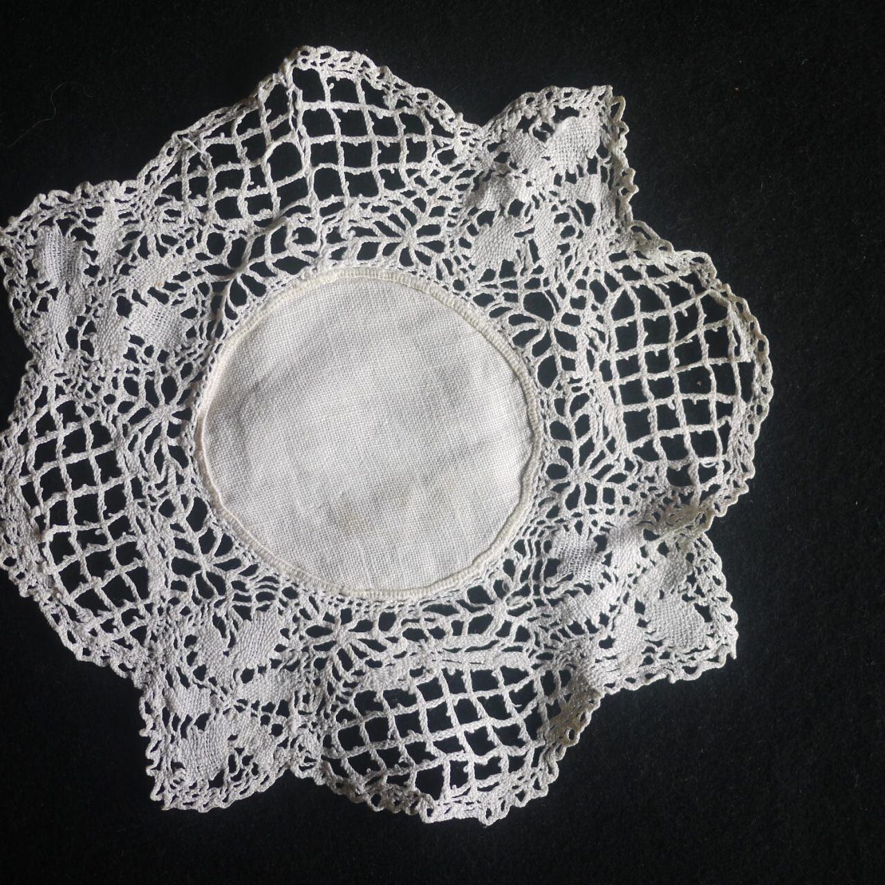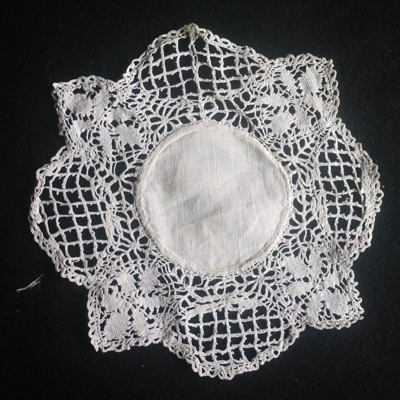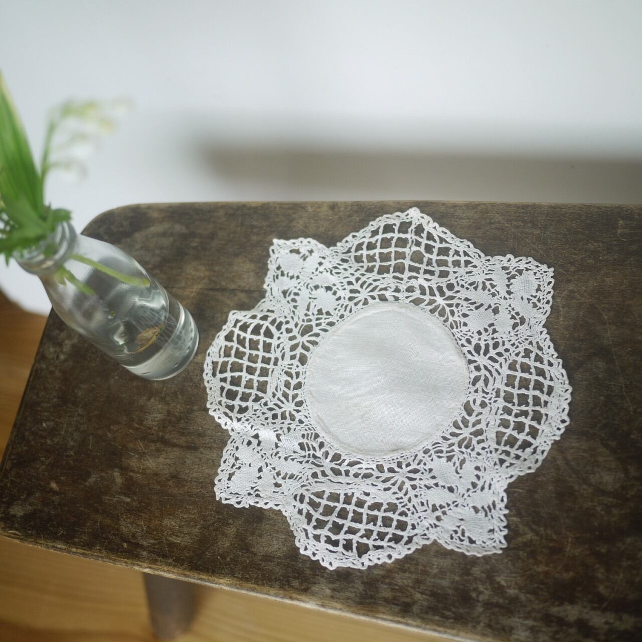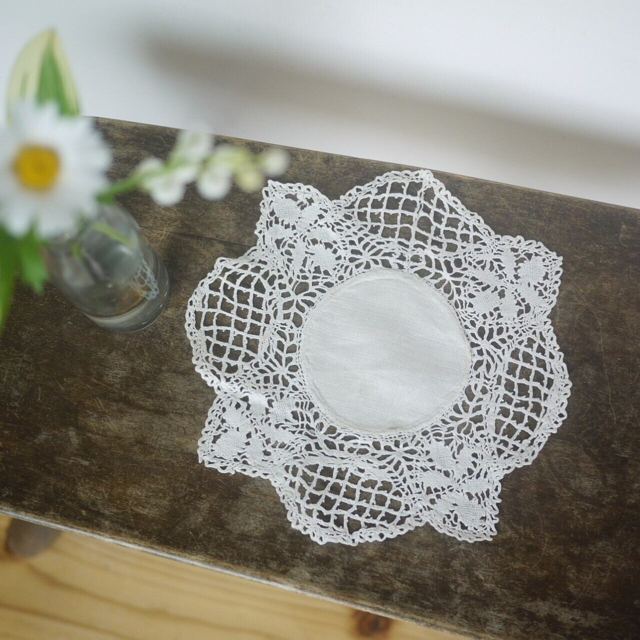 オフホワイトのボビンレースドイリー。
