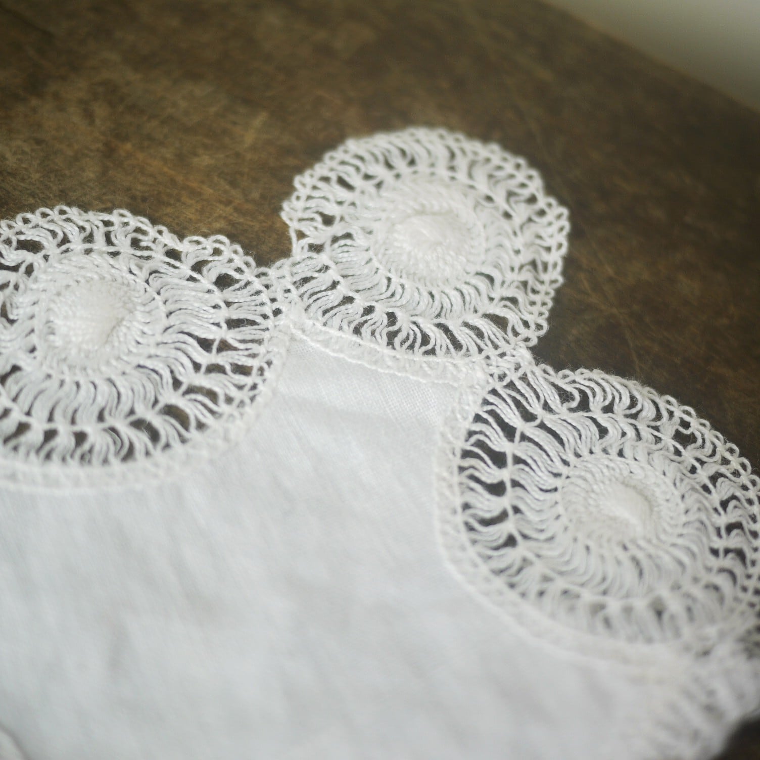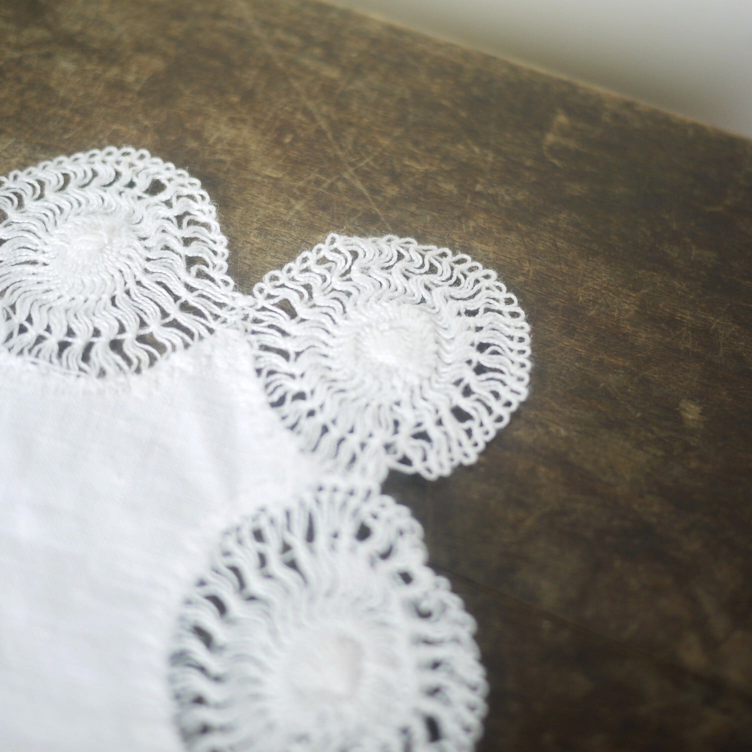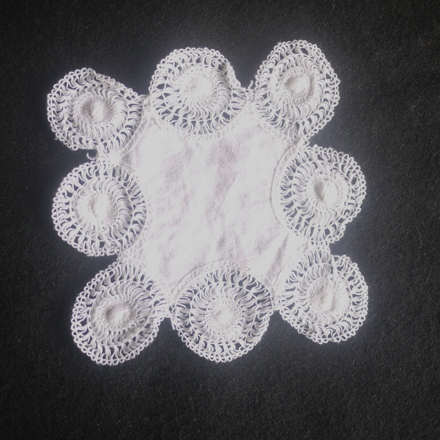 小さな8枚のモチーフを白布の周りに配したかわいらしいドイリー。