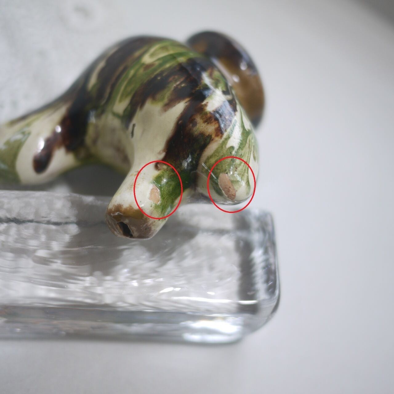 吹き口や尻尾、台座裏などに釉薬のハガレがあります。