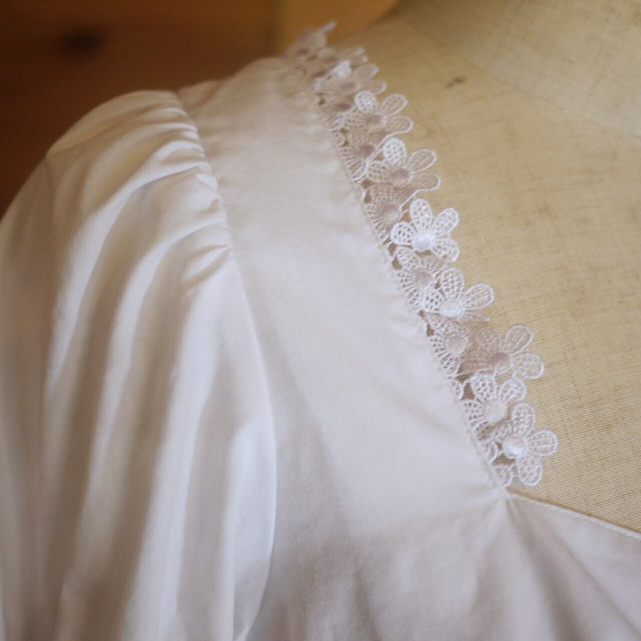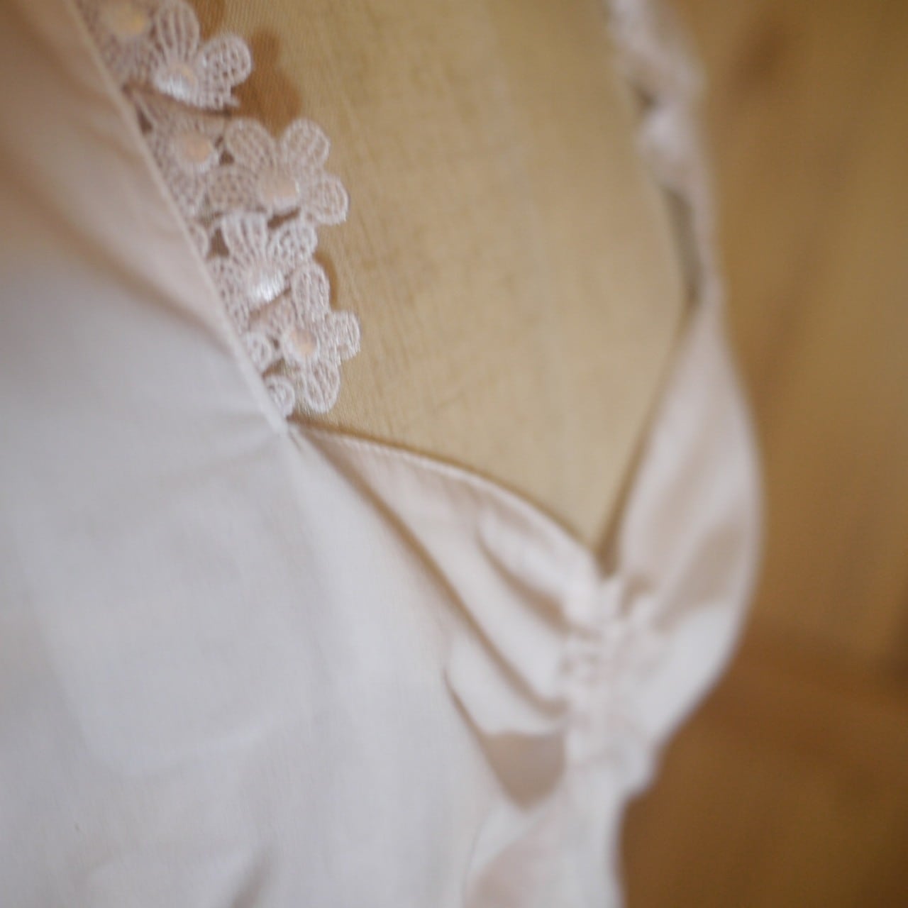 胸元と袖口に花のレースがあしらわれた、かぶるタイプのブラウス。