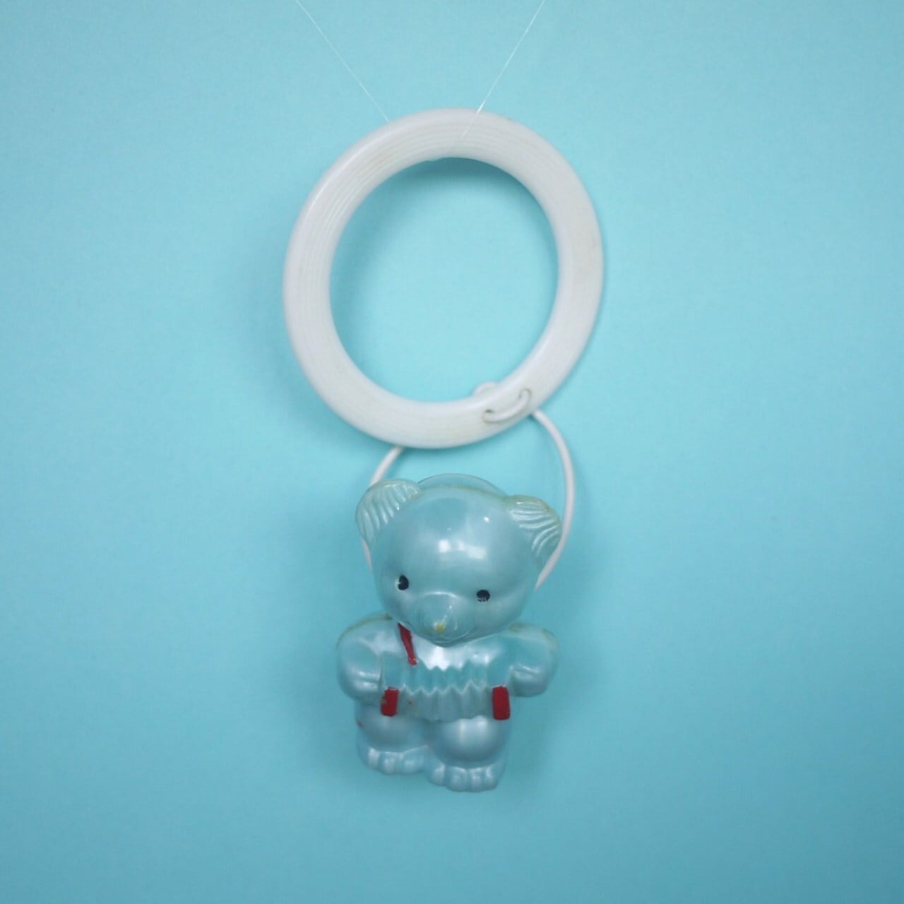 持ち手の輪っかがついた、ベビーのガラガラ玩具。