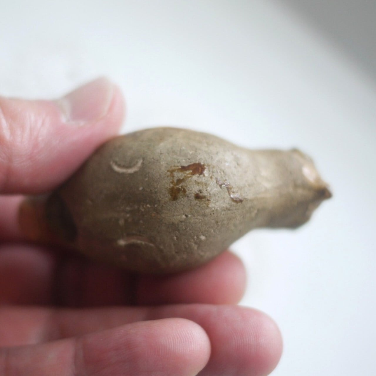 粘土を片面ずつ型で起こして貼り合わせ褐色や緑、