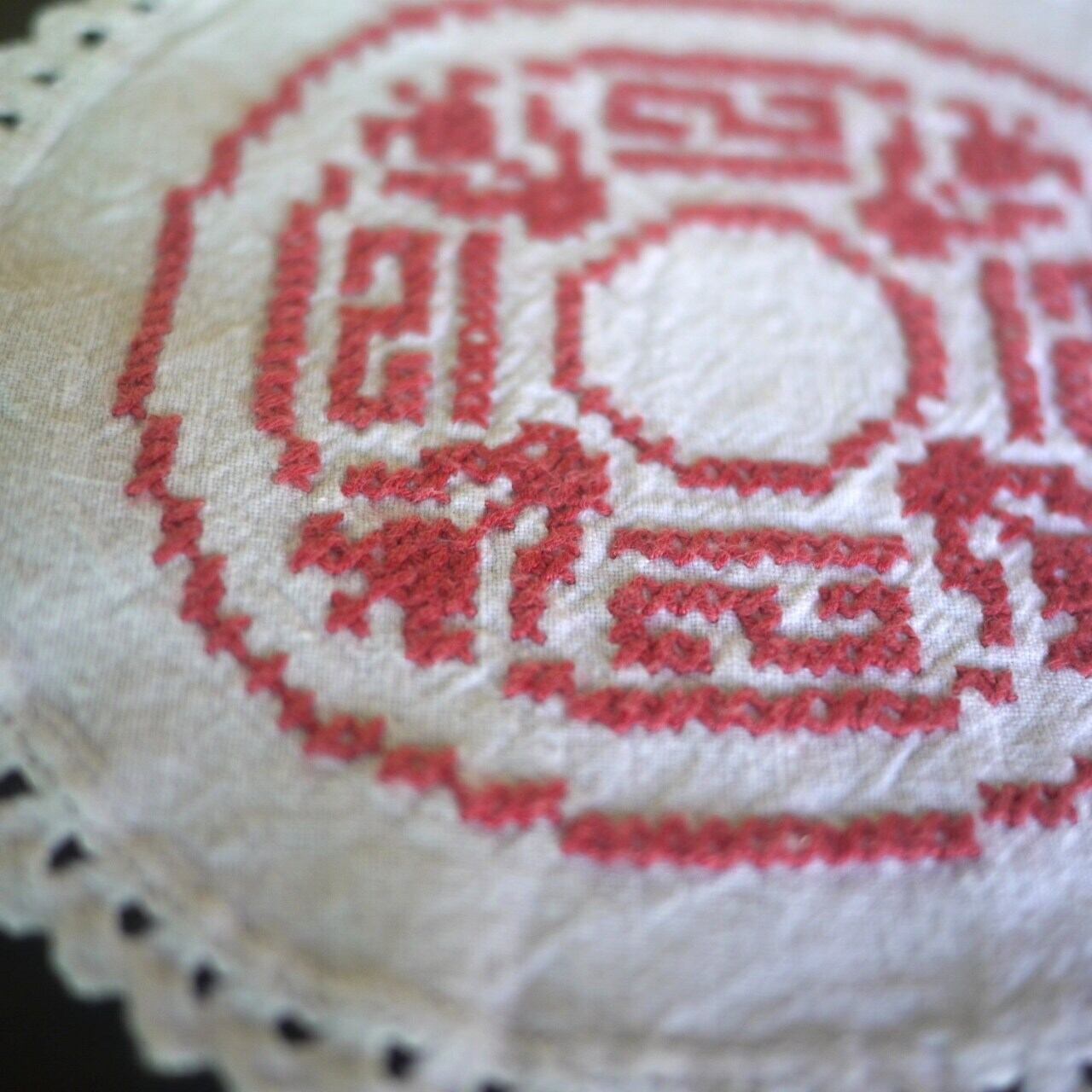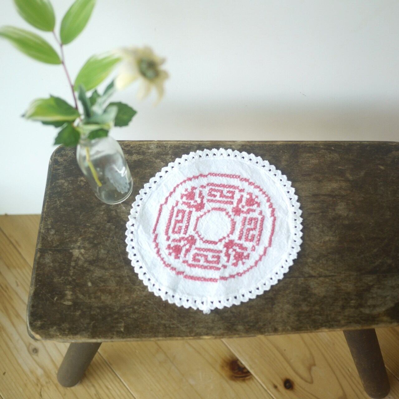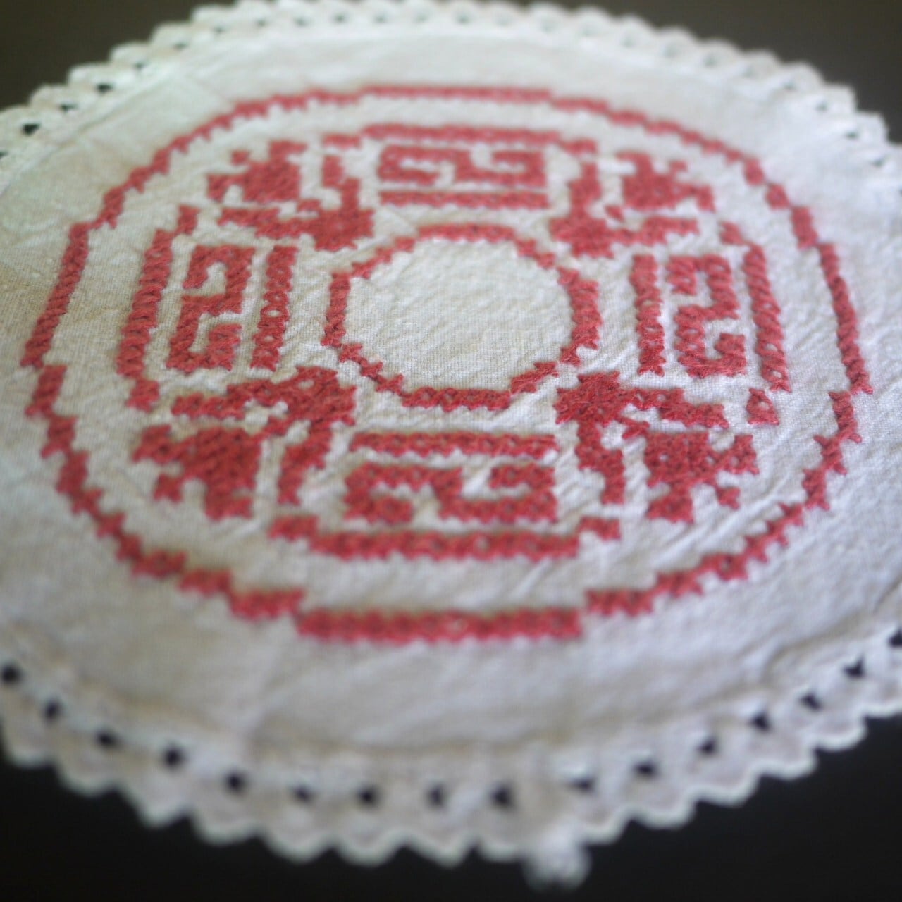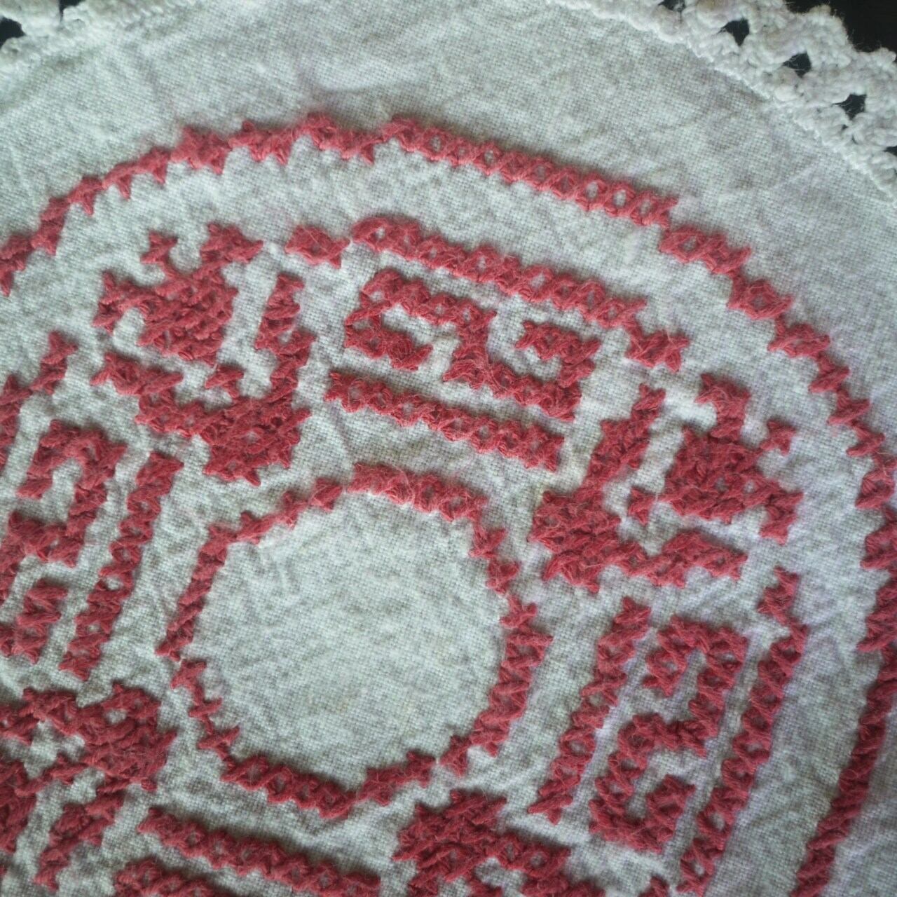 白地に赤のクロスステッチがかわいいドイリー。