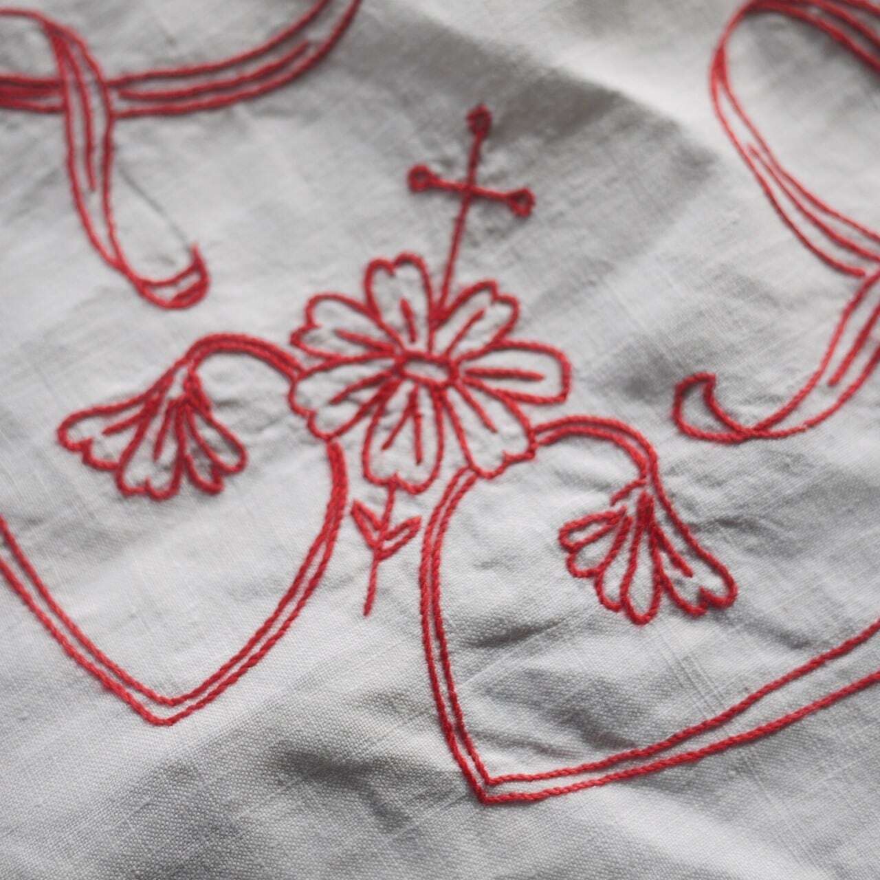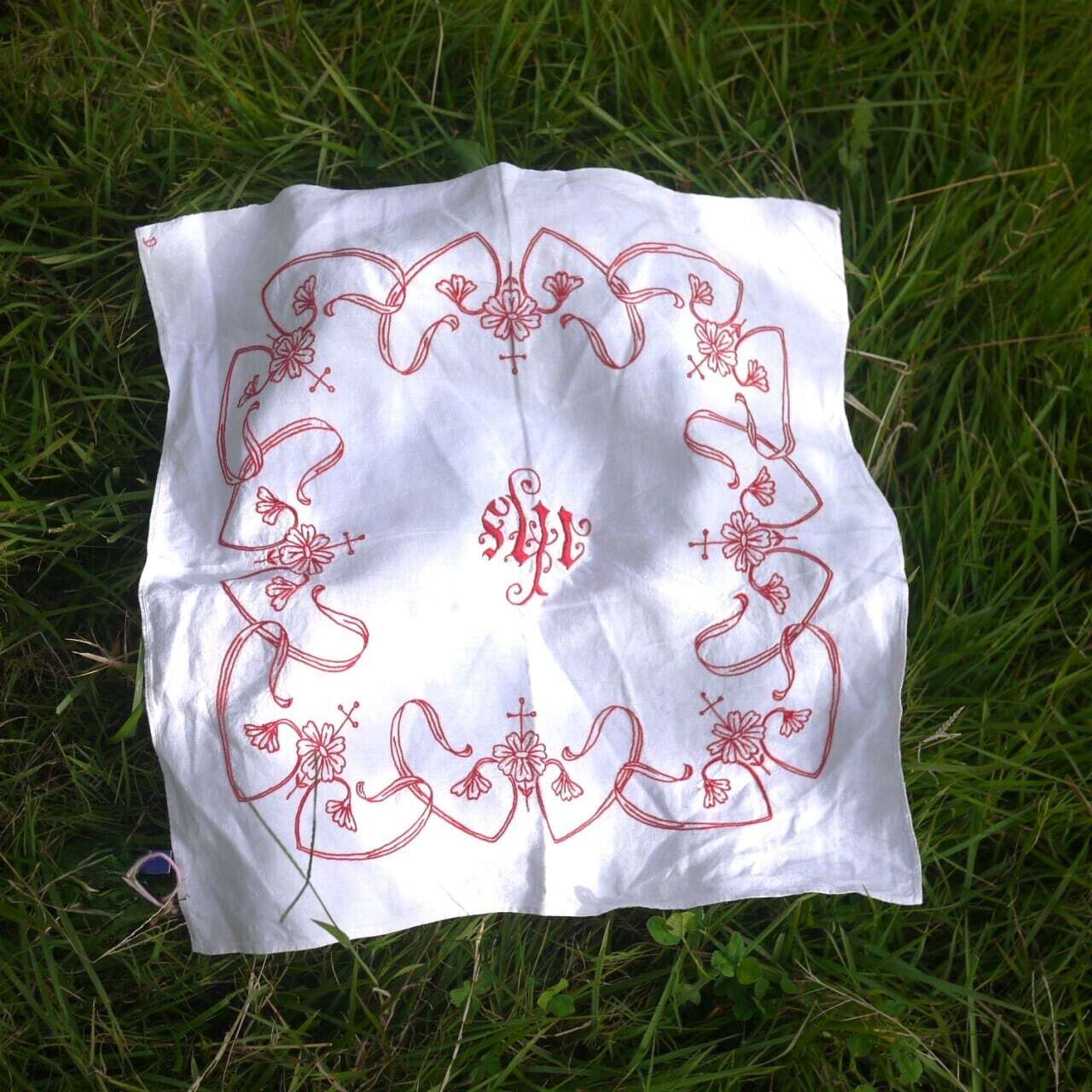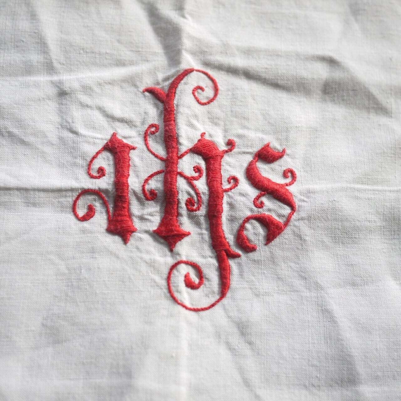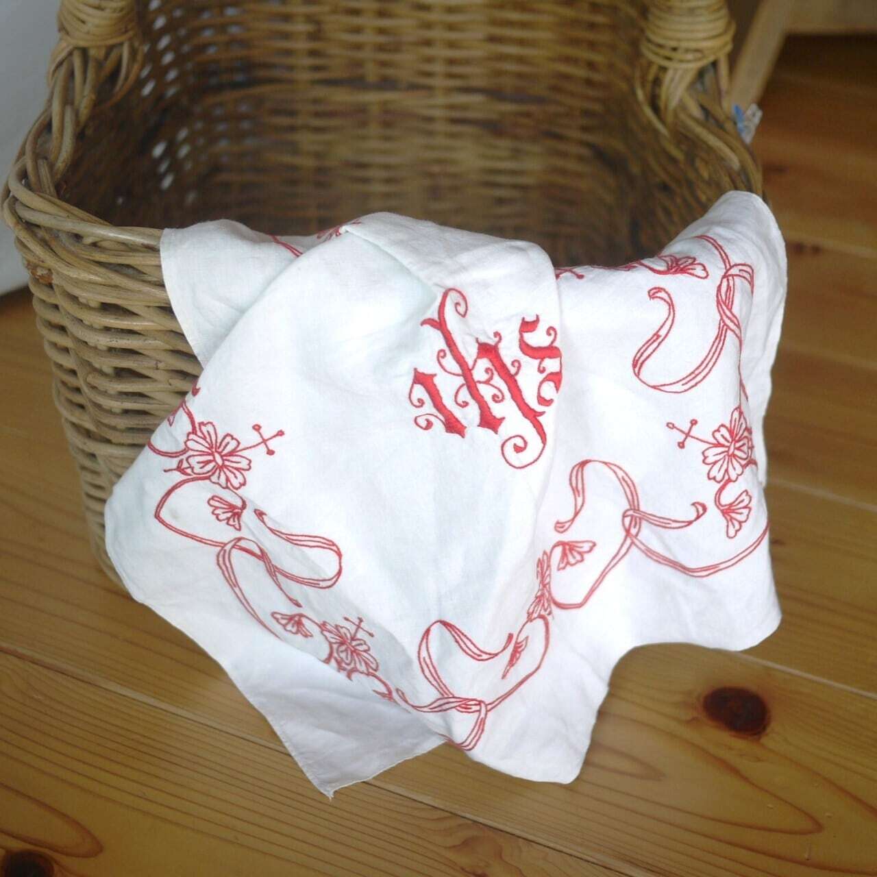 教会堂の卓布 レッドワーク刺繍 IHSと花 ドイツ