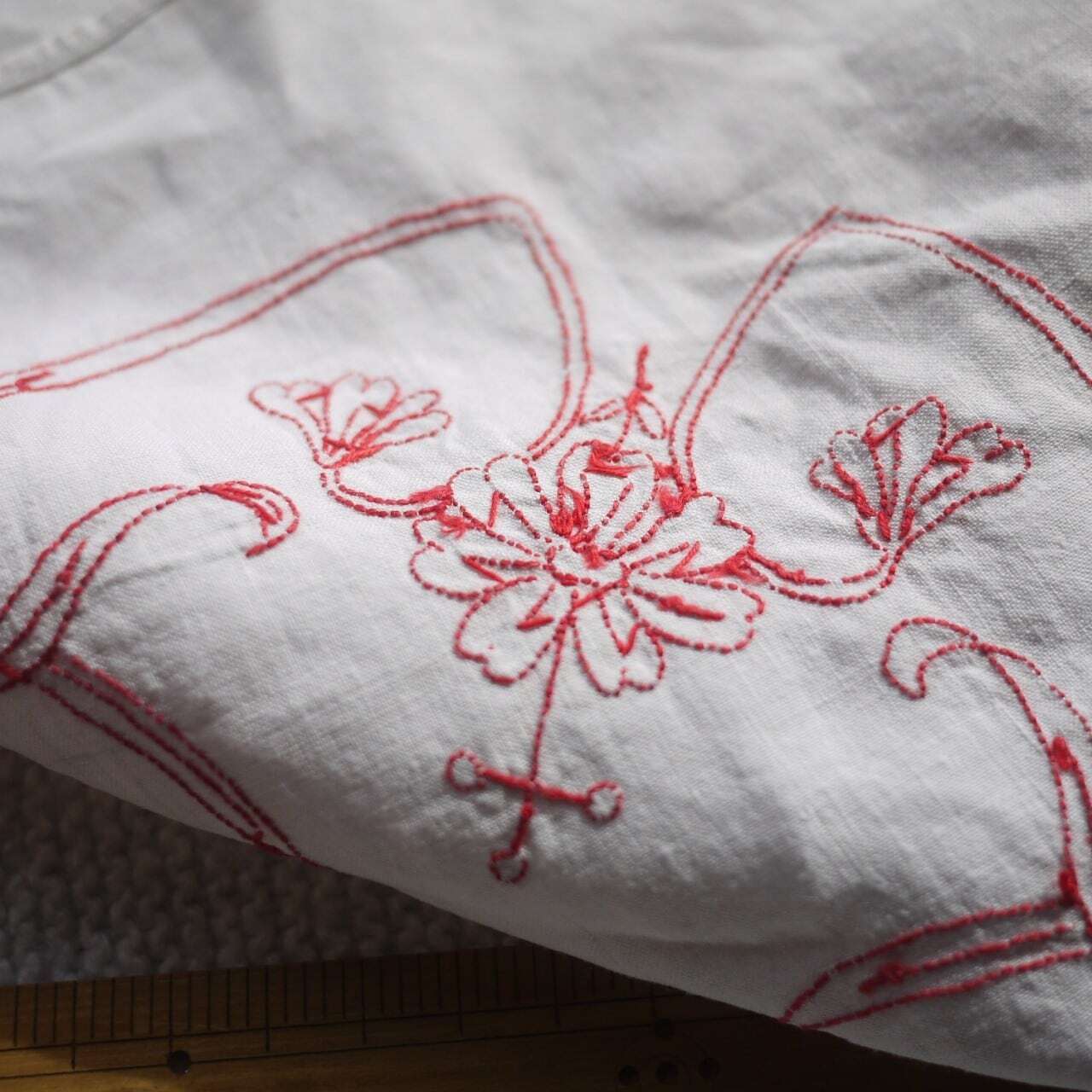 リネン混素材に赤の刺繍糸で繊細で細かな刺繍が施されています。