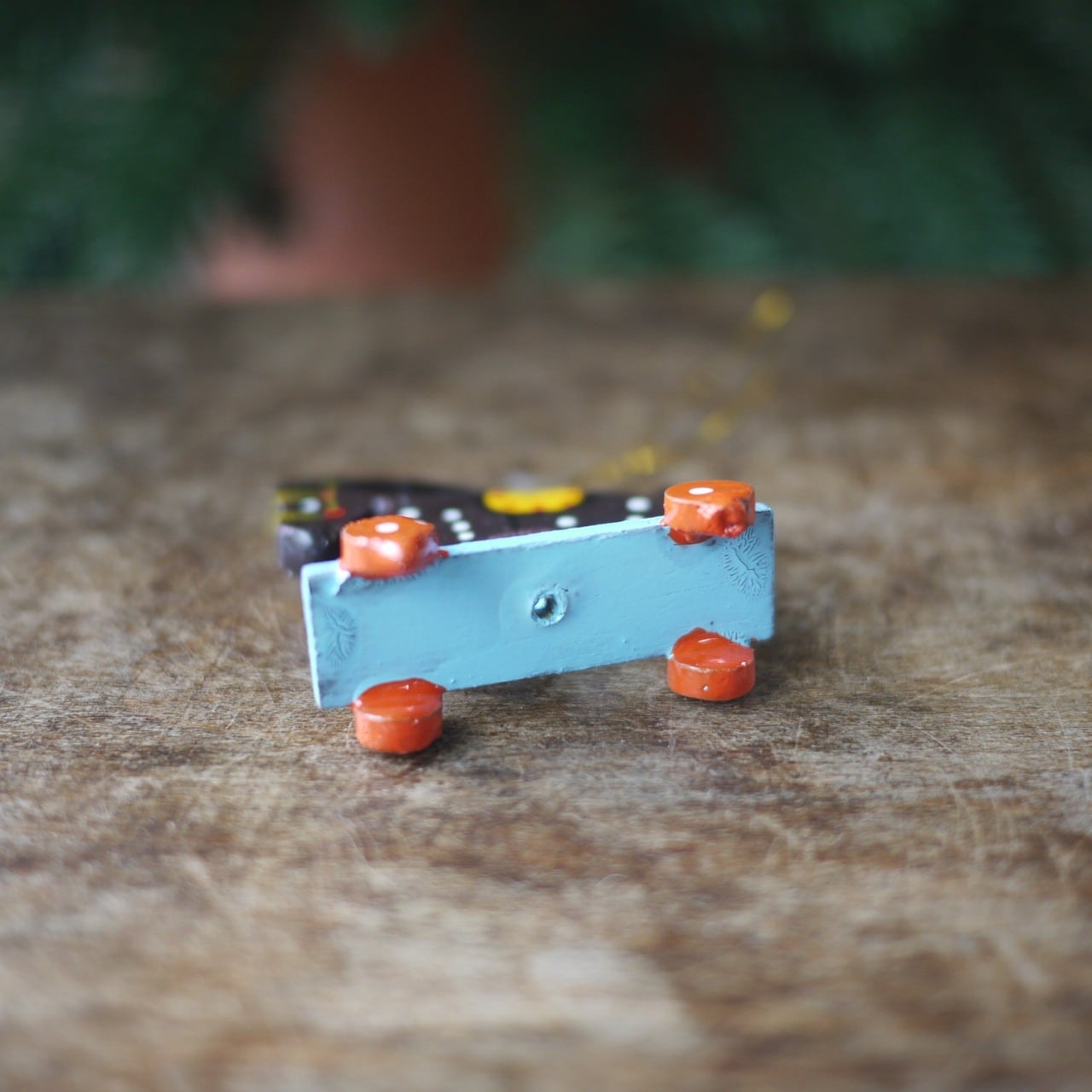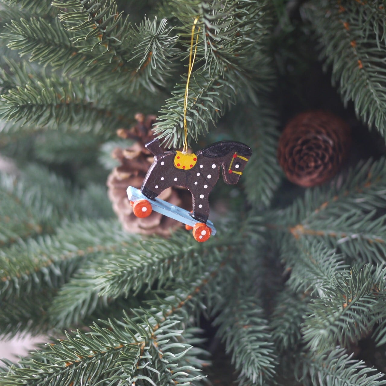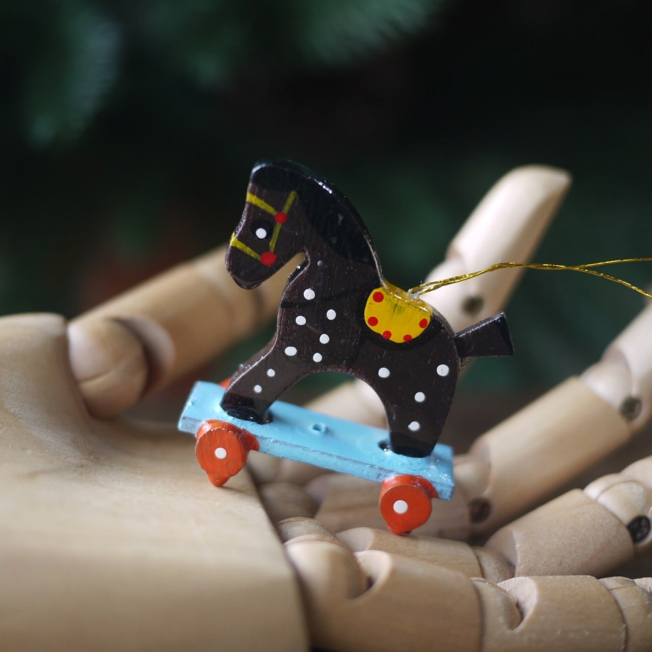 引っ張って遊ぶ木馬玩具を模したハンギングオーナメントです。