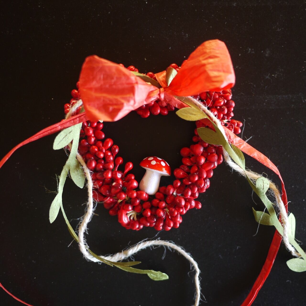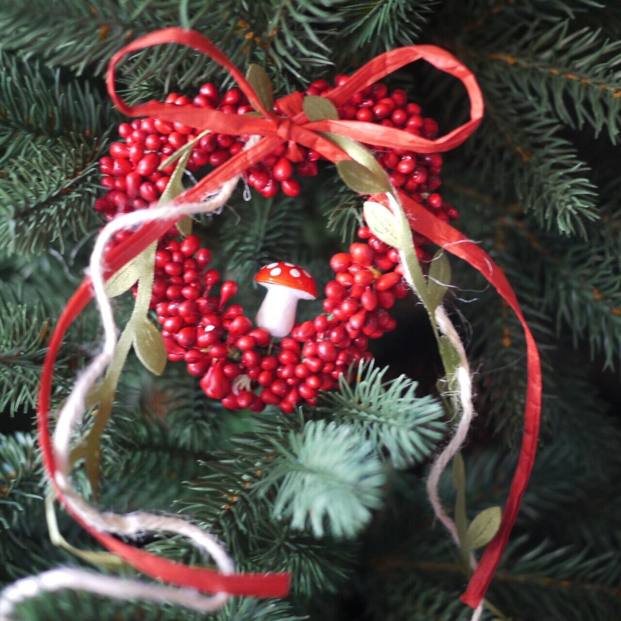 リボン飾りときのこをつけたクリスマス飾りにしました。