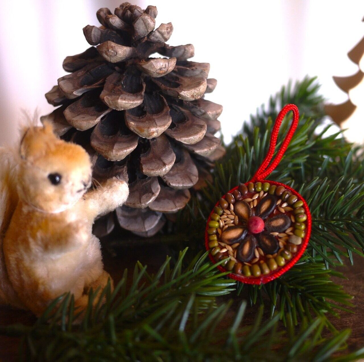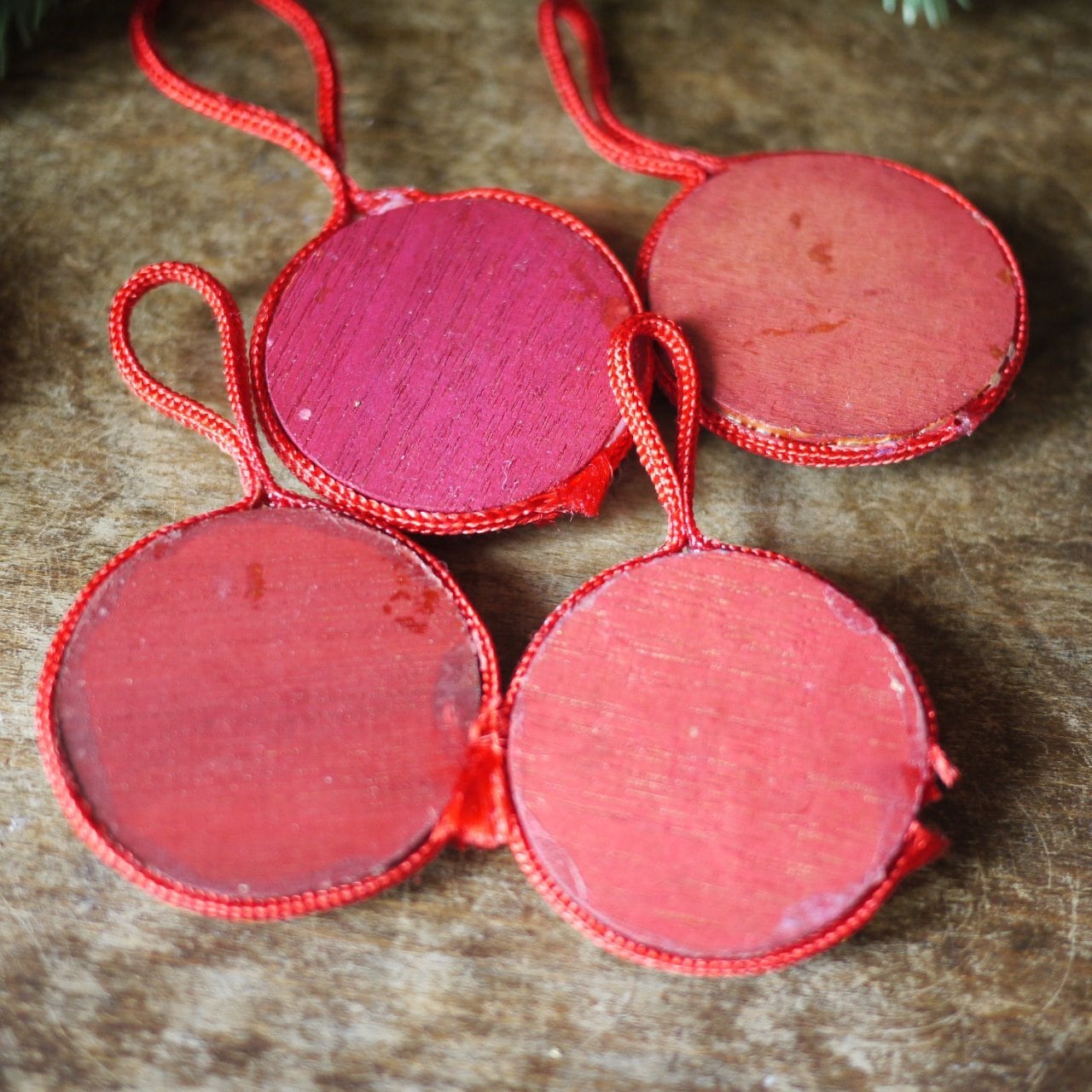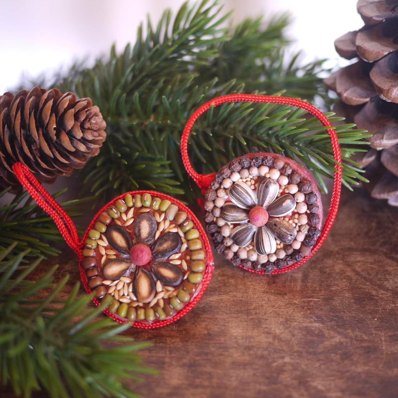 乾燥させた天然の素材を張り付けたオーナメント4つ。