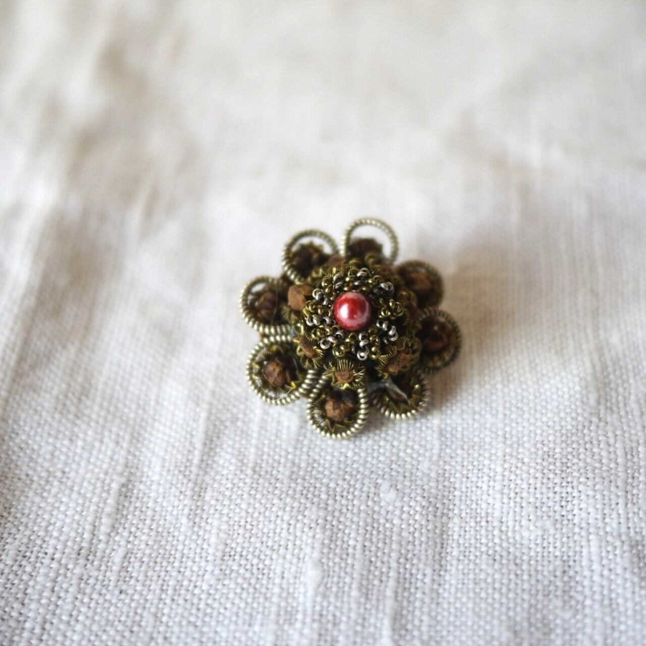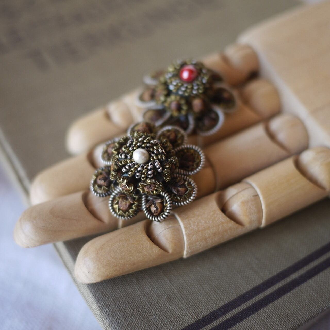 中央を飾る赤と白のパールビーズ。