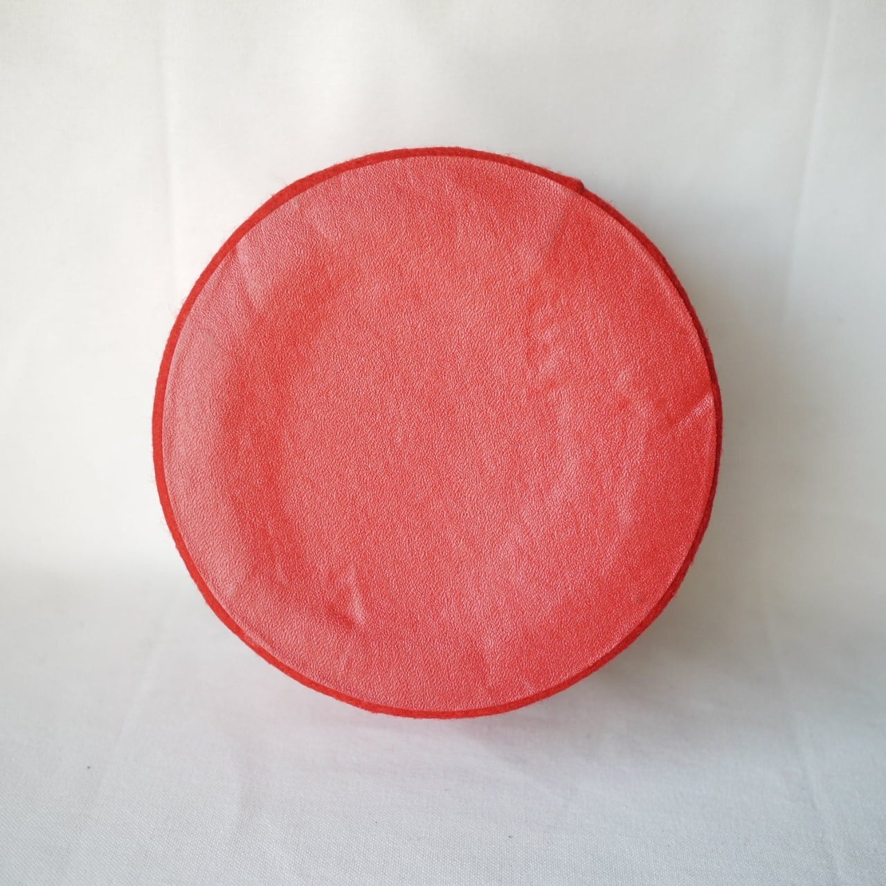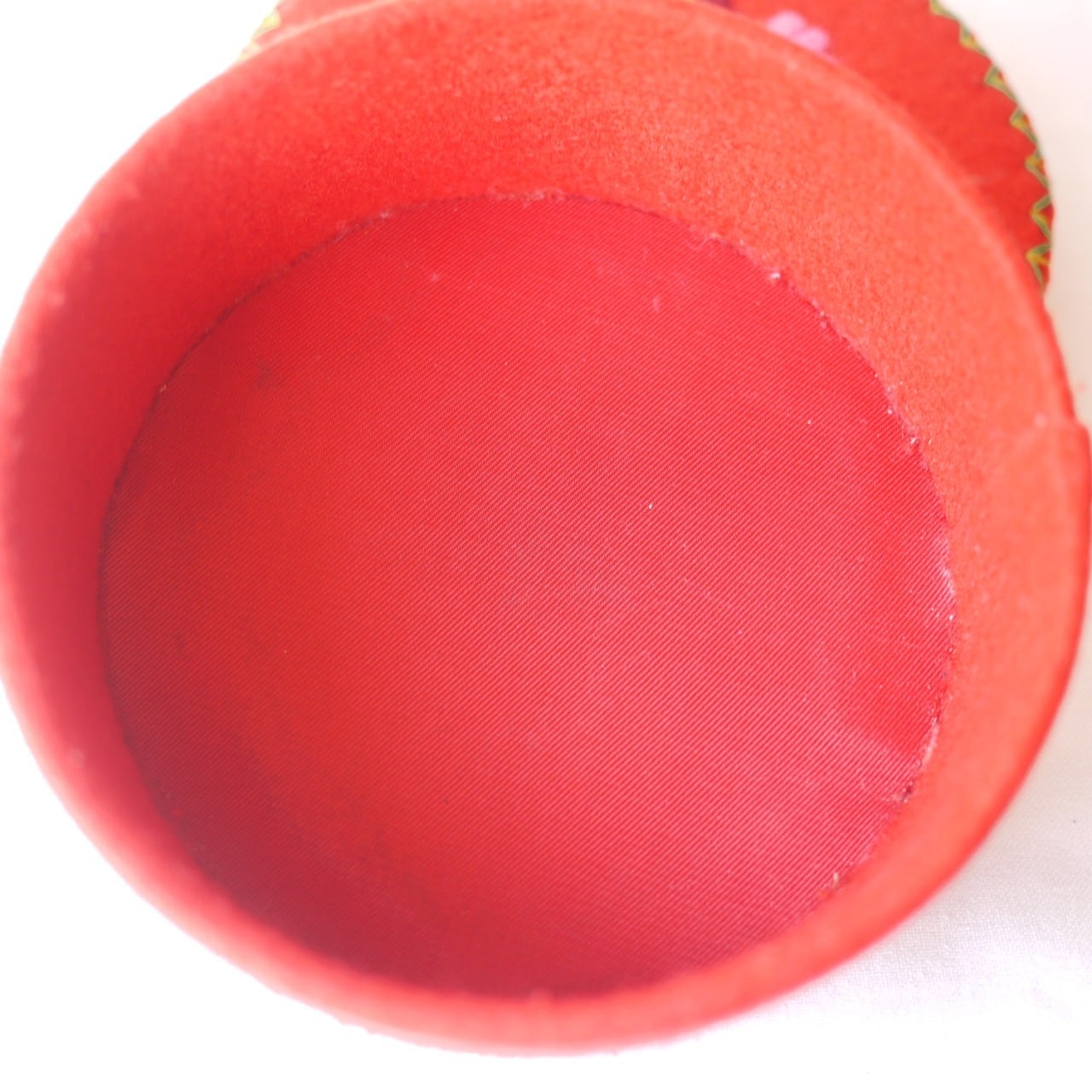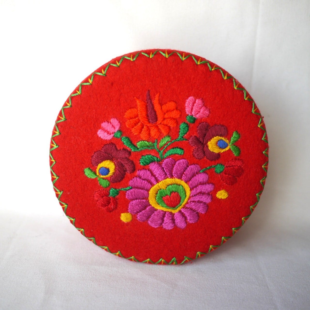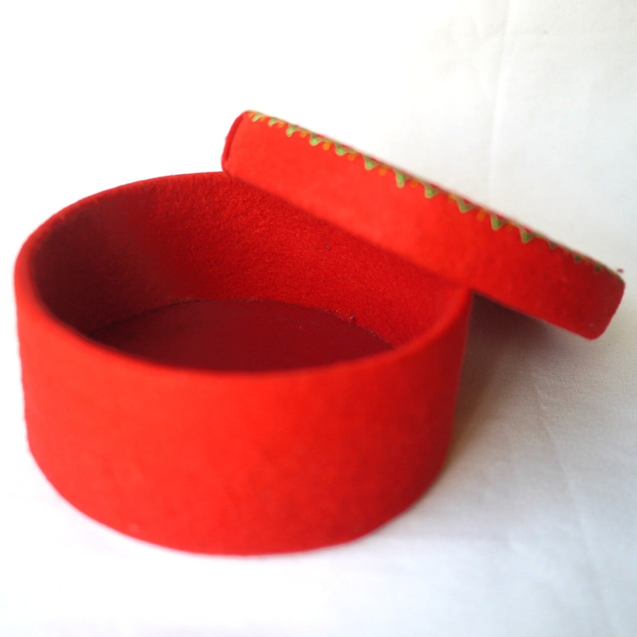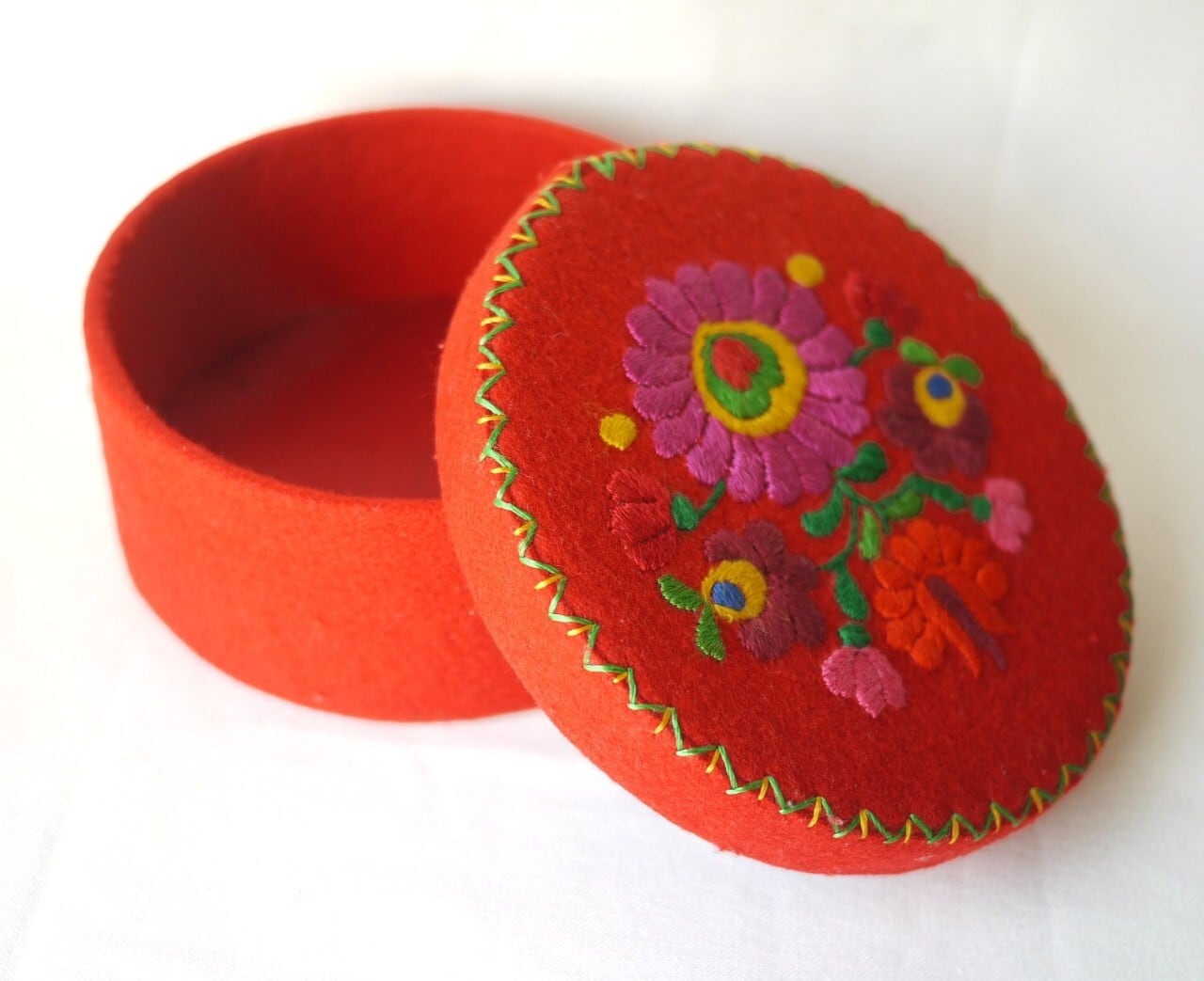 カラフルな刺繍が印象的な円形の箱です。