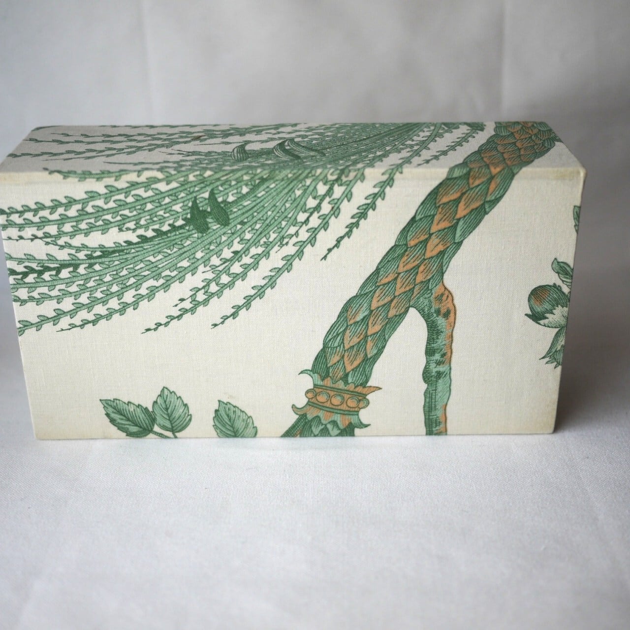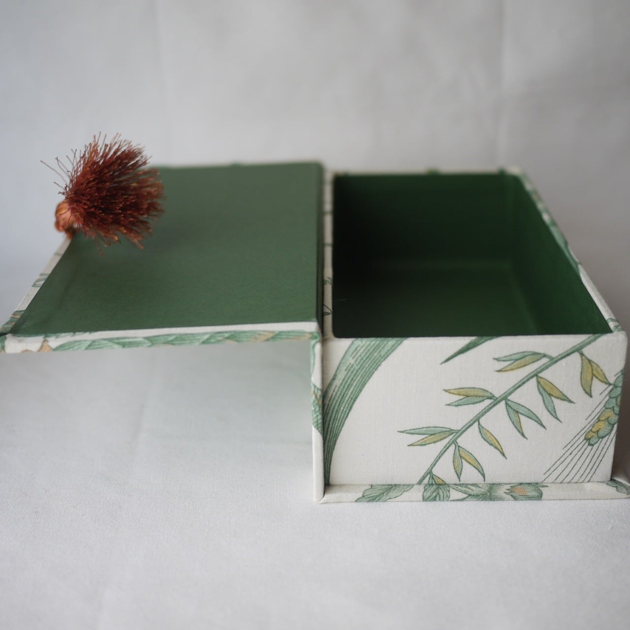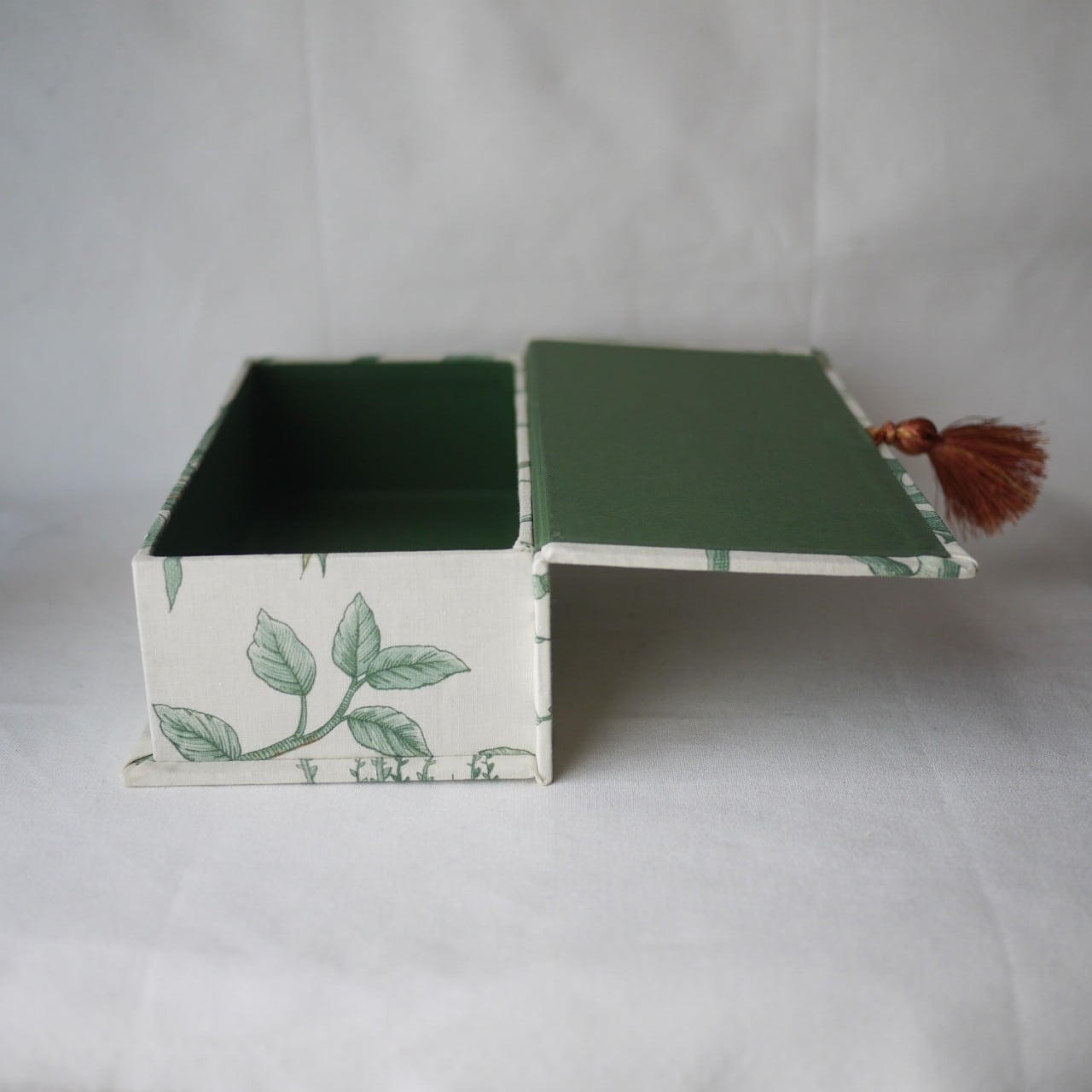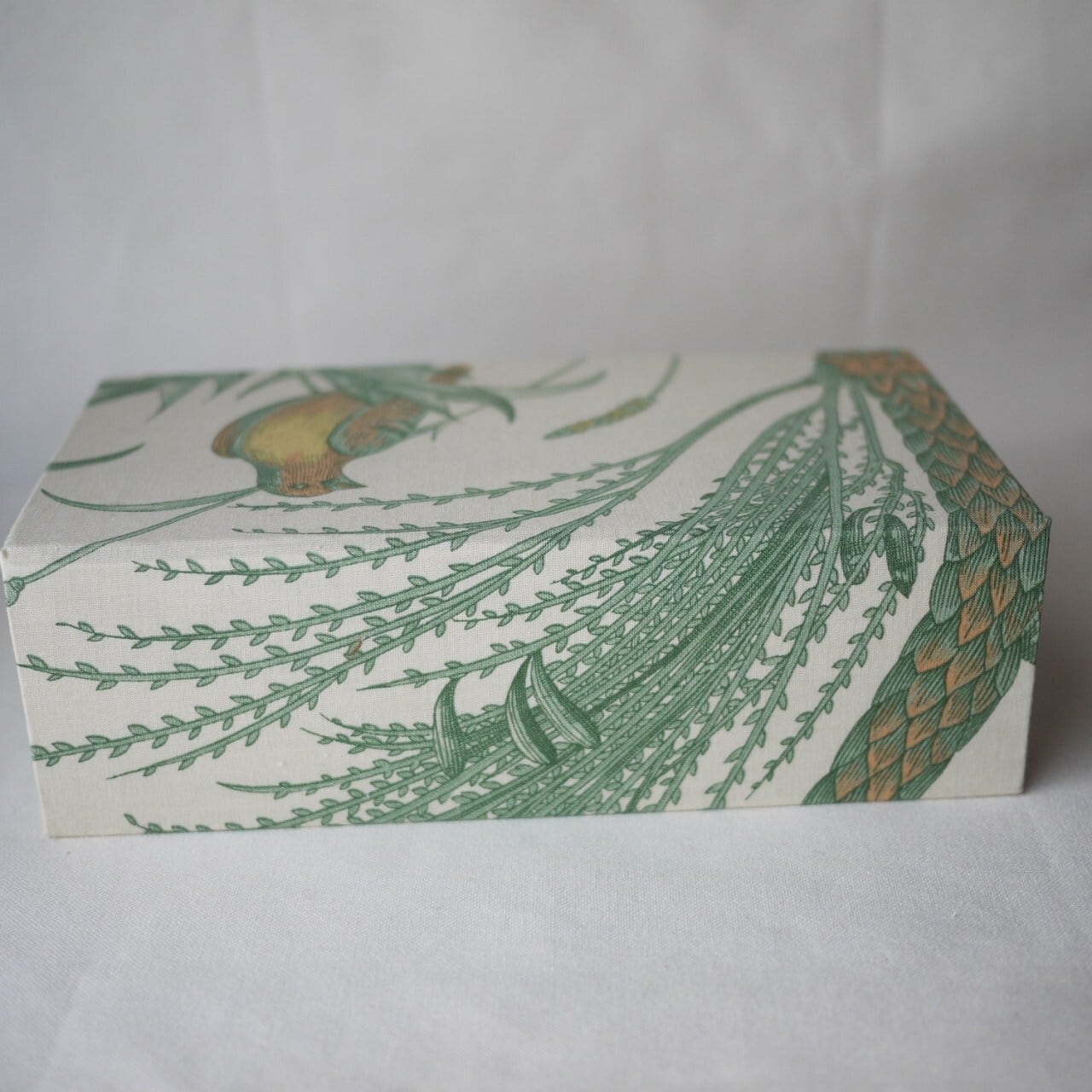 落ち着いた配色のクロス、カルトナージュボックス。