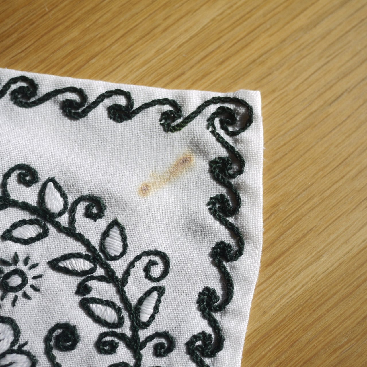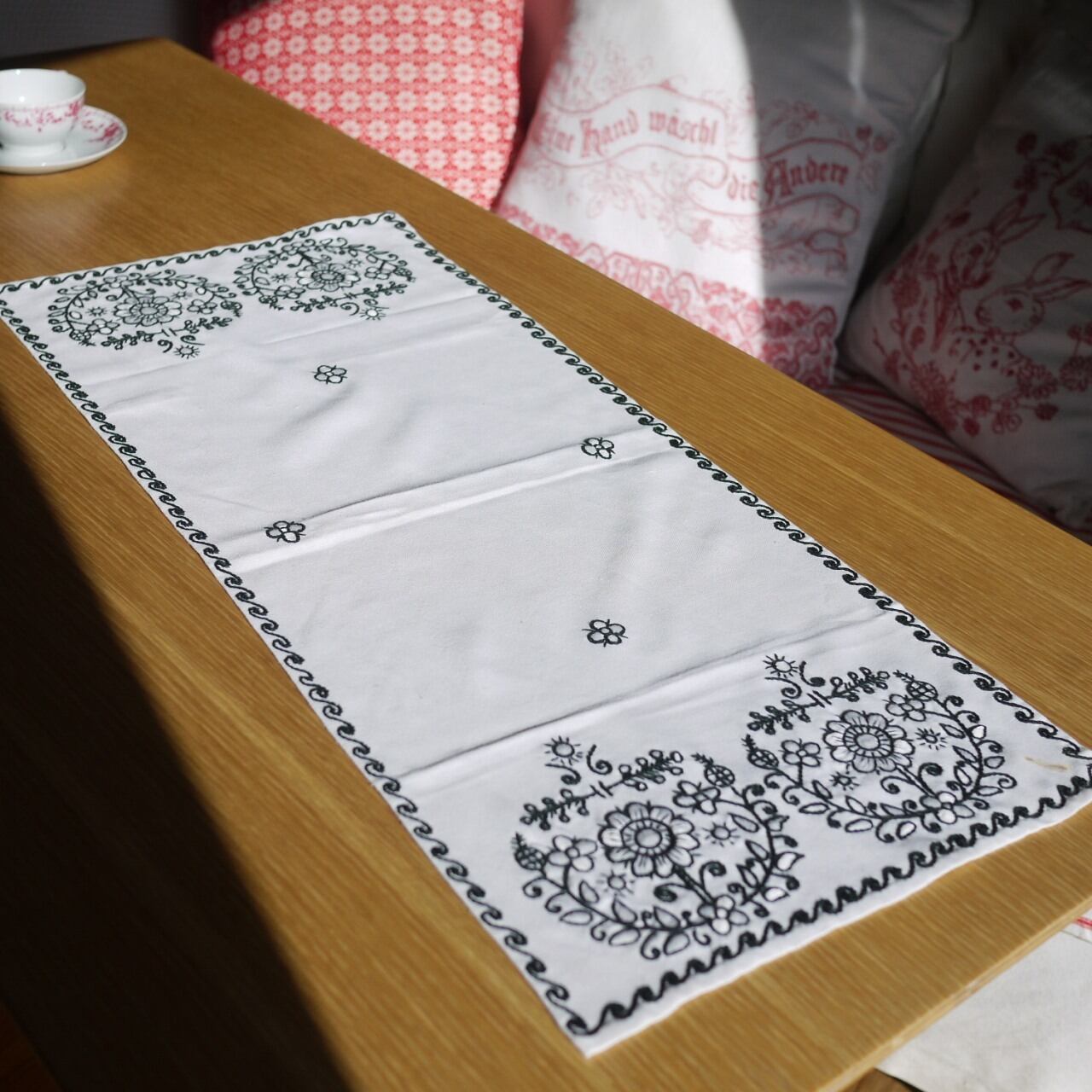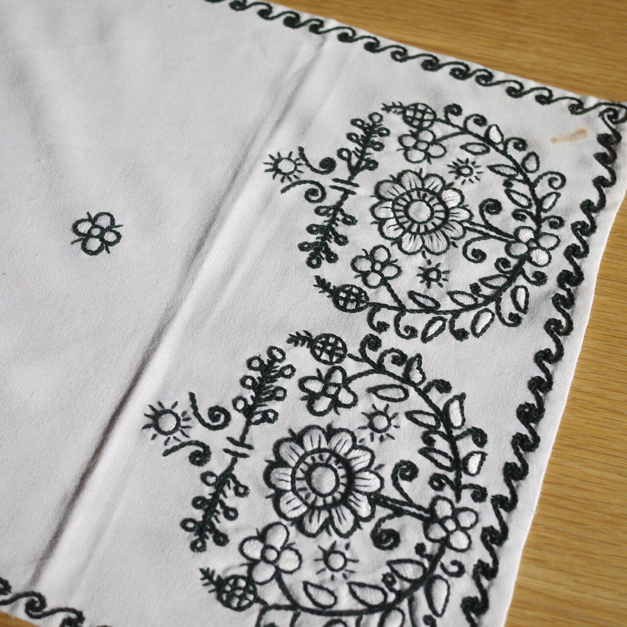 アウトラインステッチで描かれ花が印象的なクロス。