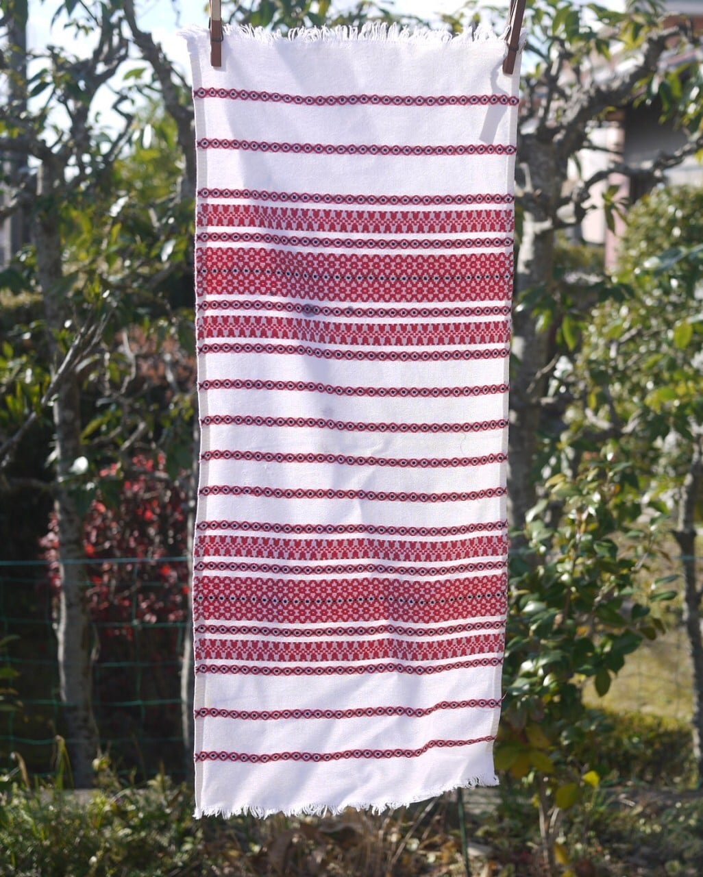 オフホワイトのコットン地。両端はフリンジ