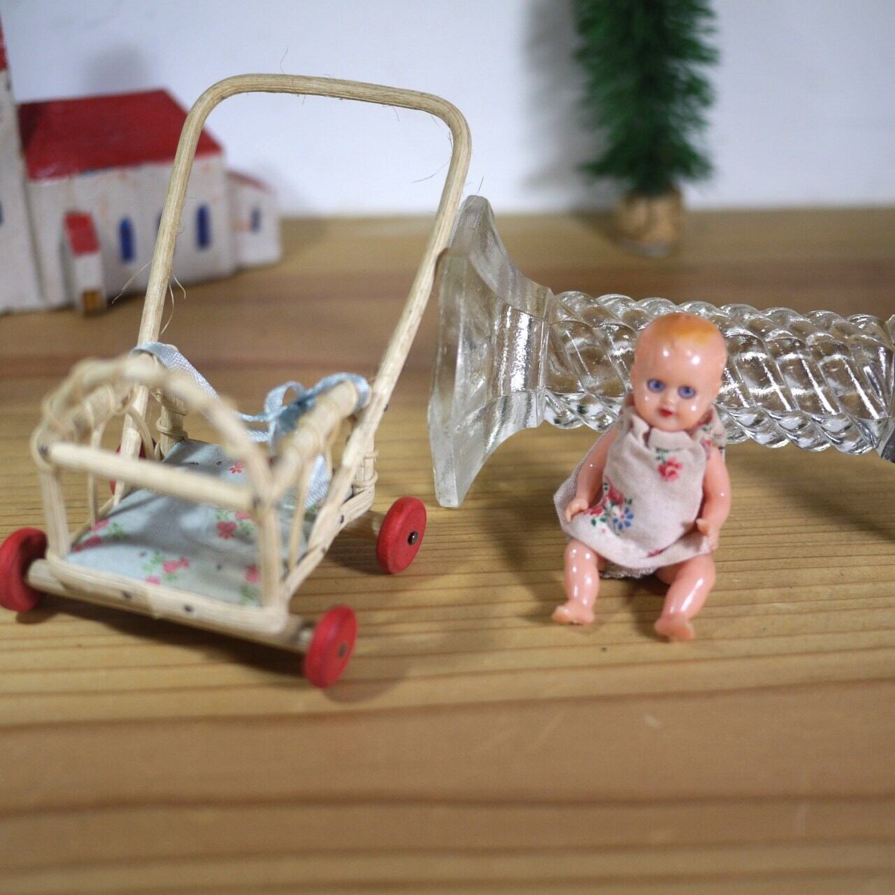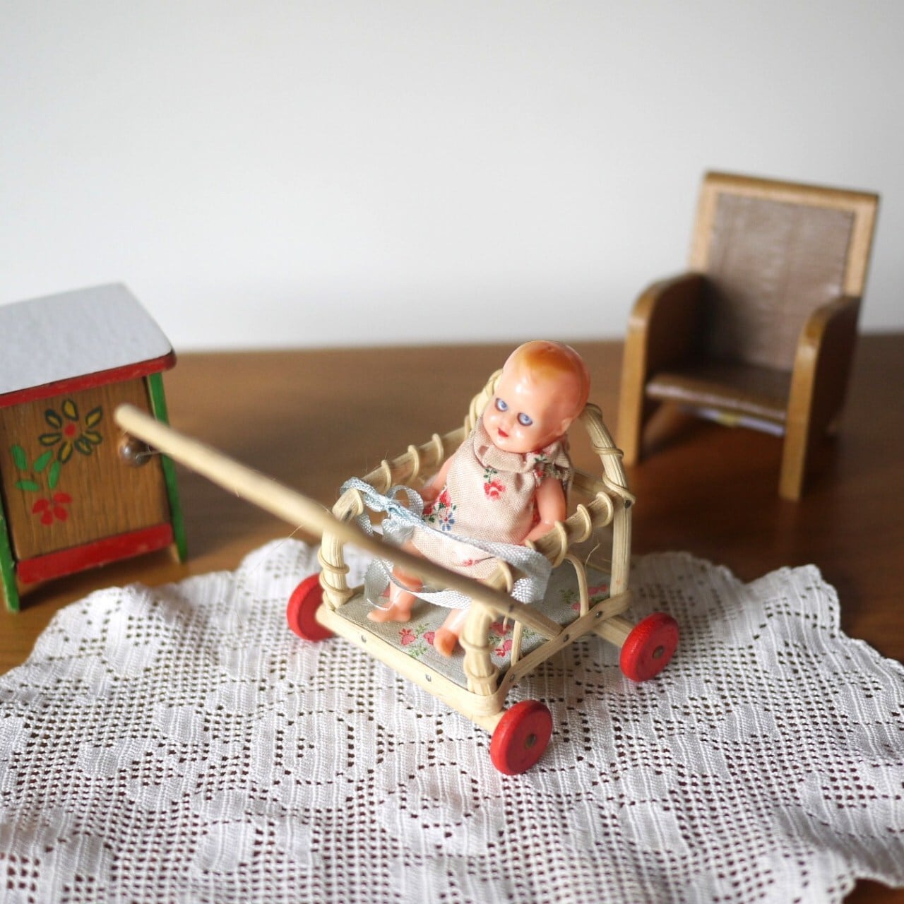 赤い車輪のラタンベビーカーとミニチュアベビー ドイツ