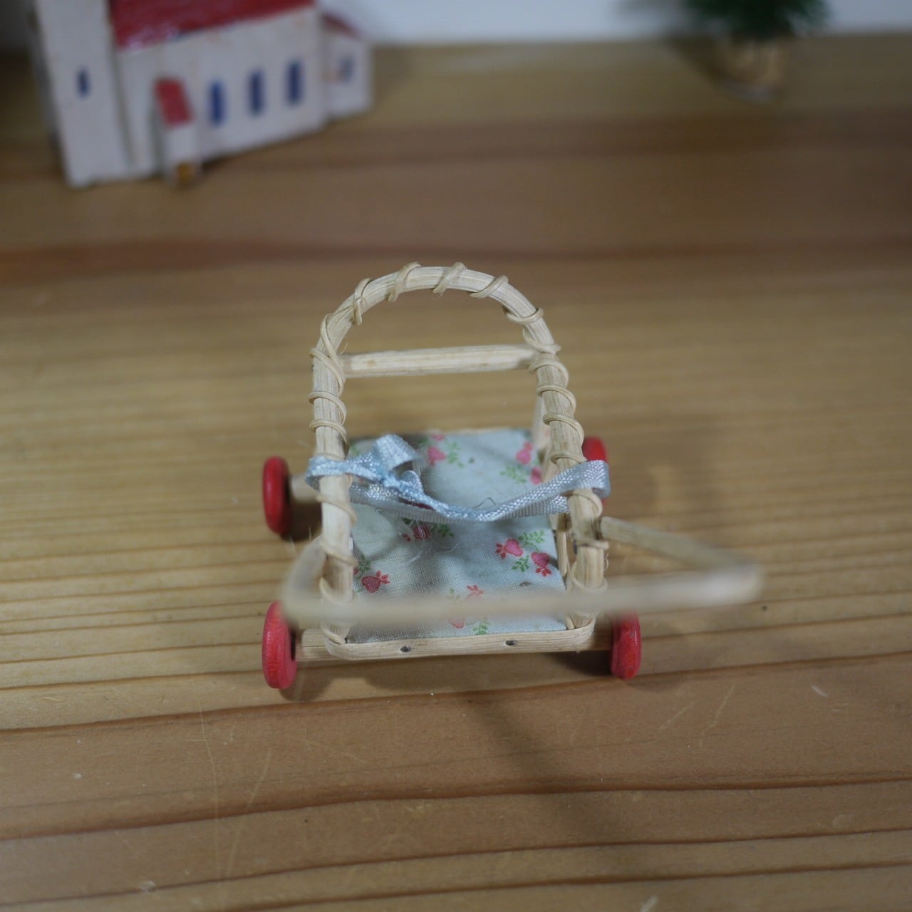 木製の赤い車輪が付いた人形用ベビーカー。