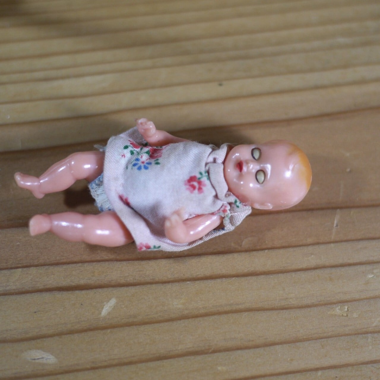 ピンクの小花柄ドレスを着たベビー人形が乗っています。
