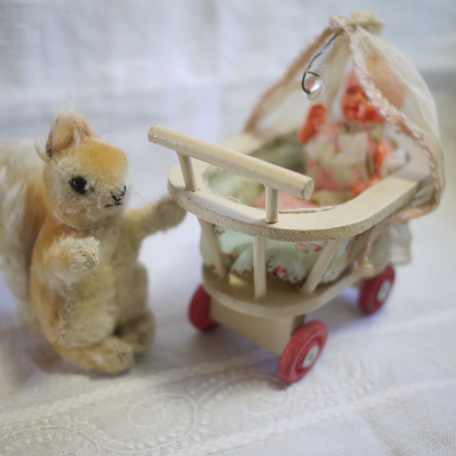 ホロ付き木製ベビーカーと花柄ベビー服