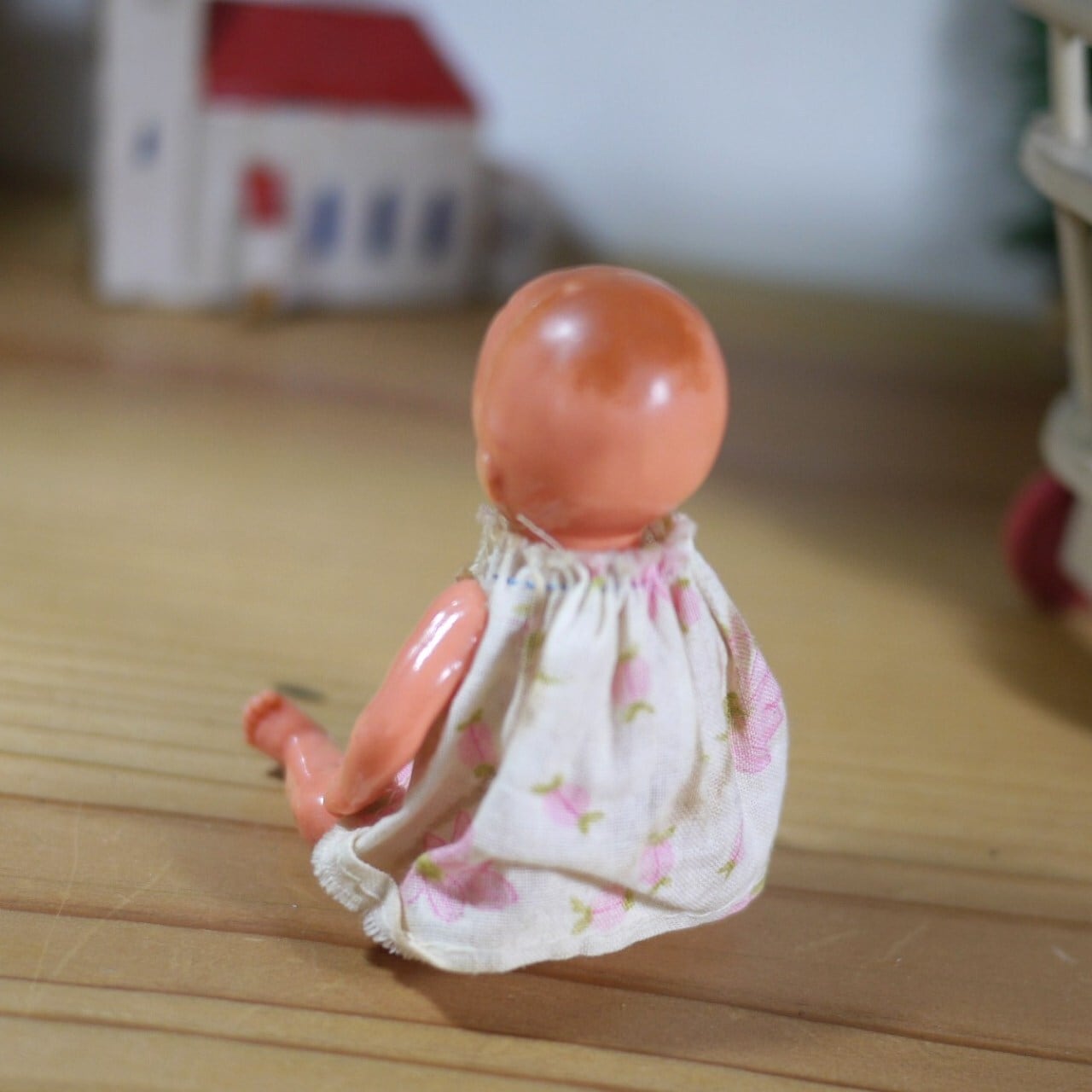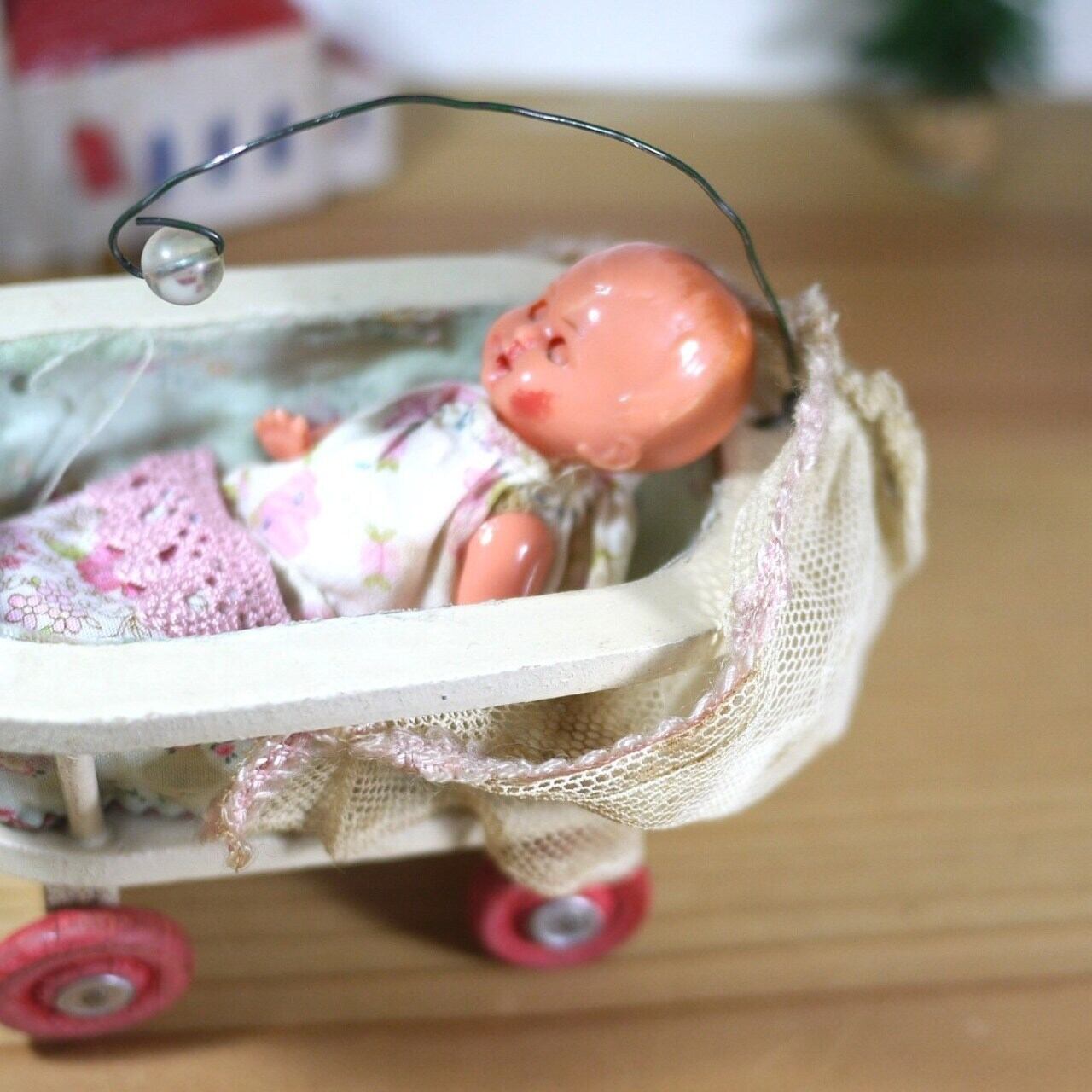 [ホロ付き木製ベビーカーと花柄ベビー服]