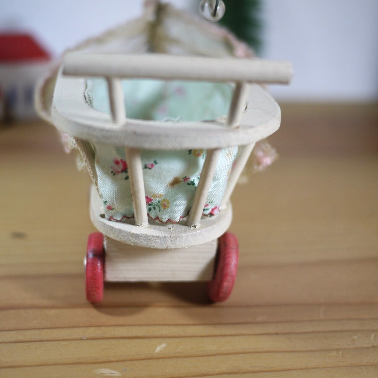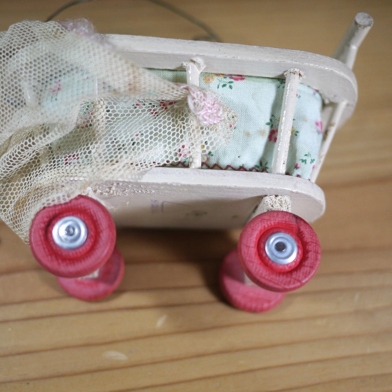 赤い木製の車輪が付いた人形用ベビーカー。
