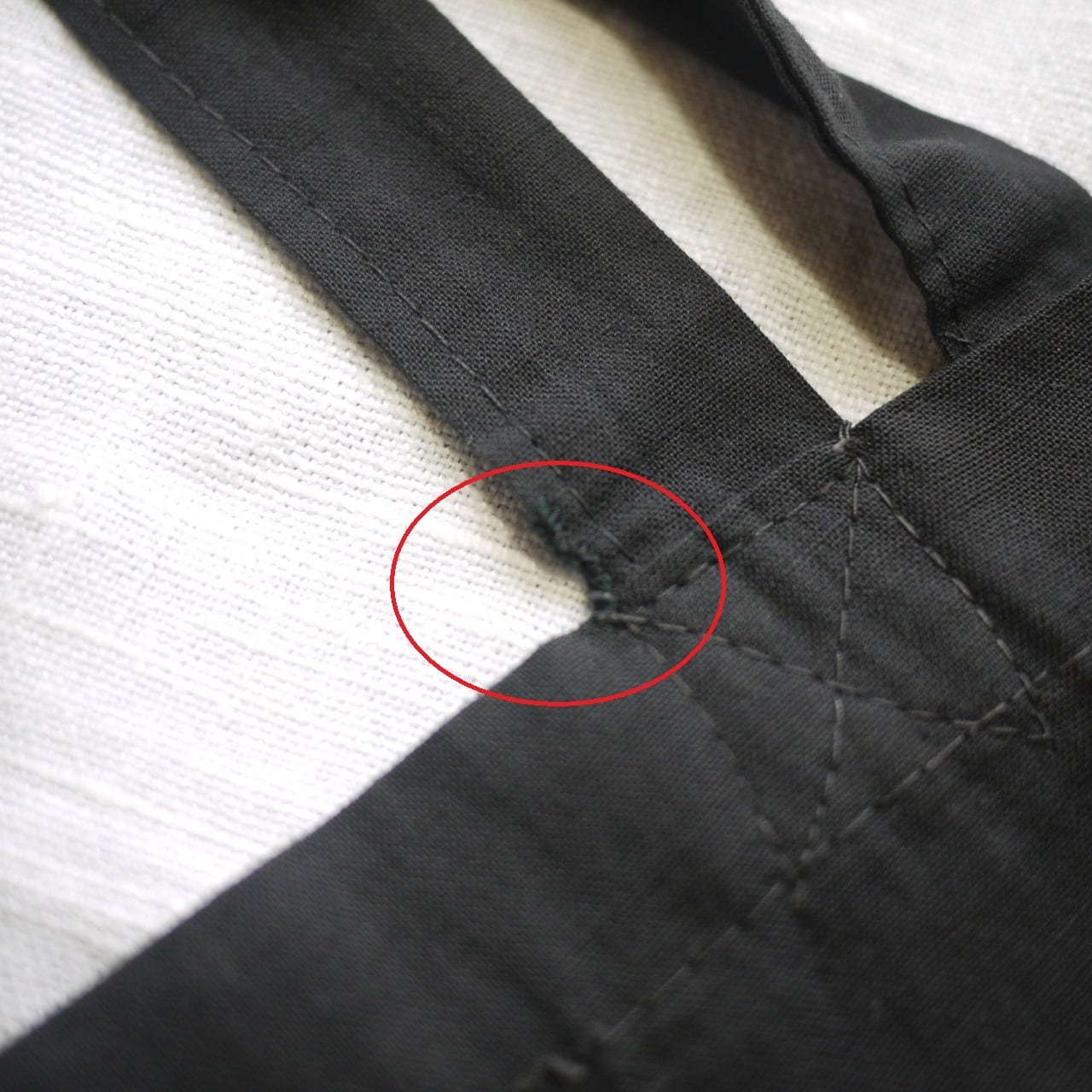 表面入れ口にミシン糸の破損、持ち手の補修跡が見られます。