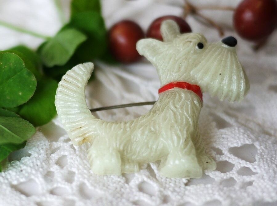 白いテリアのブローチ 古いプラスチック製 ヴィンテージ フランス