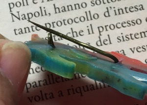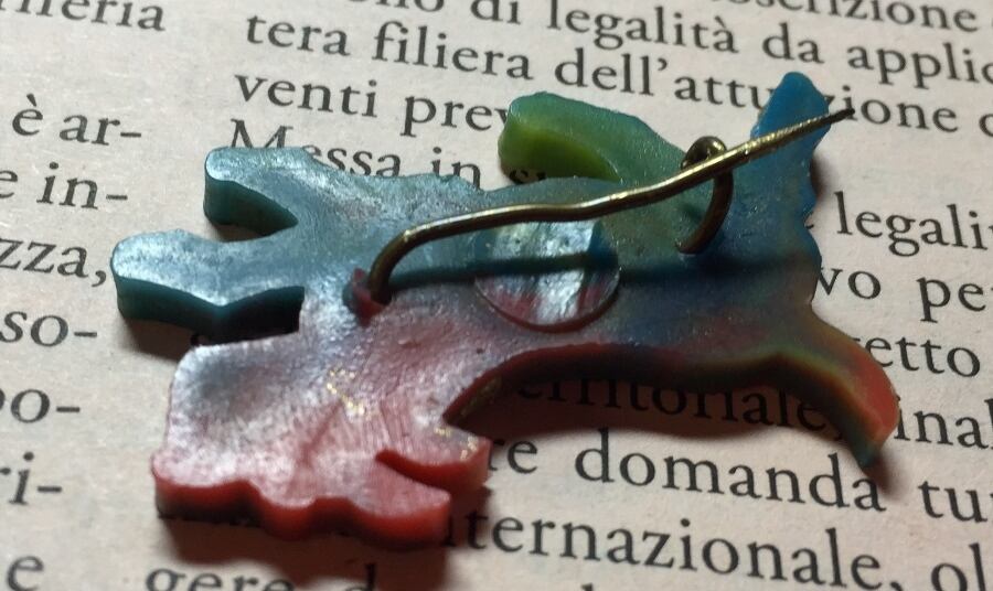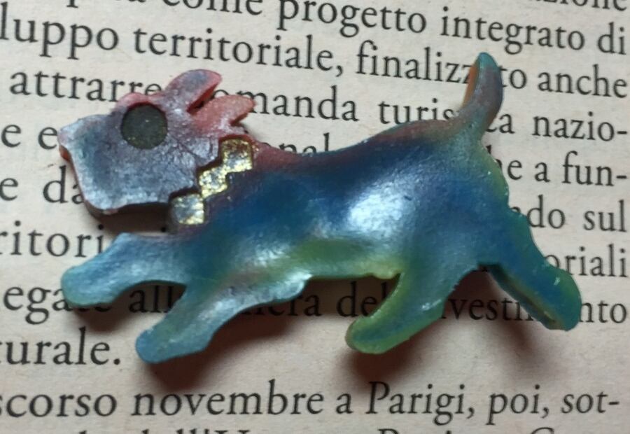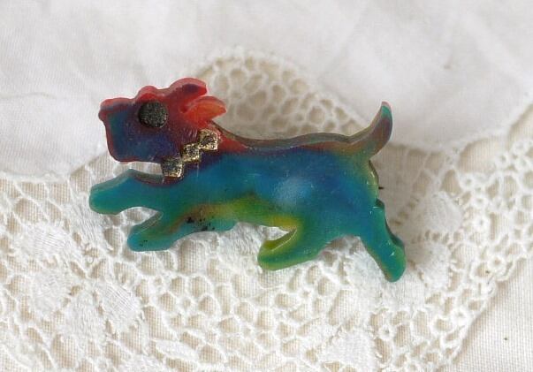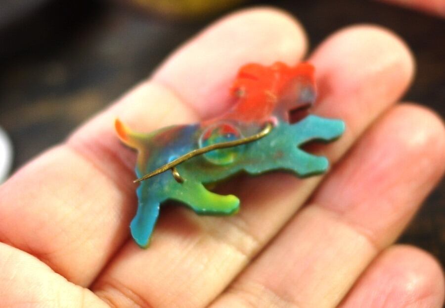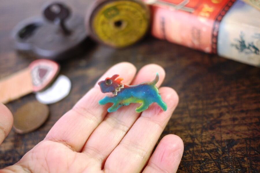 不思議な虹色のベークライト、首輪と目に金色の彩色跡が残っています。