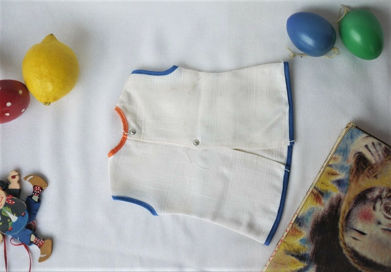 オフホワイト織地に青とオレンジのパイピングが効いています。