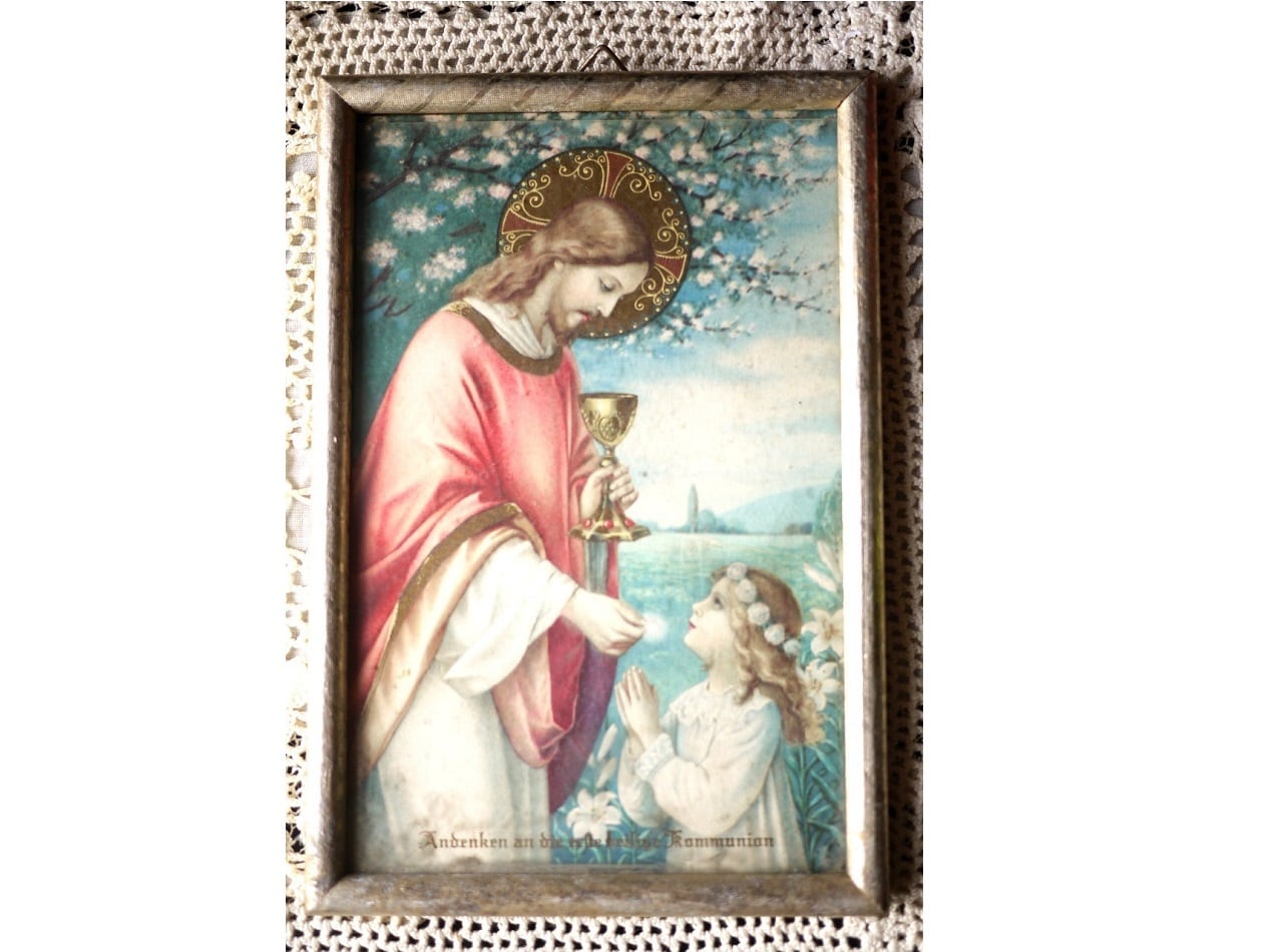 宗教画 イエス様と少女 壁掛け額絵 キリスト教 祝福聖餐記念儀式 初聖体拝領