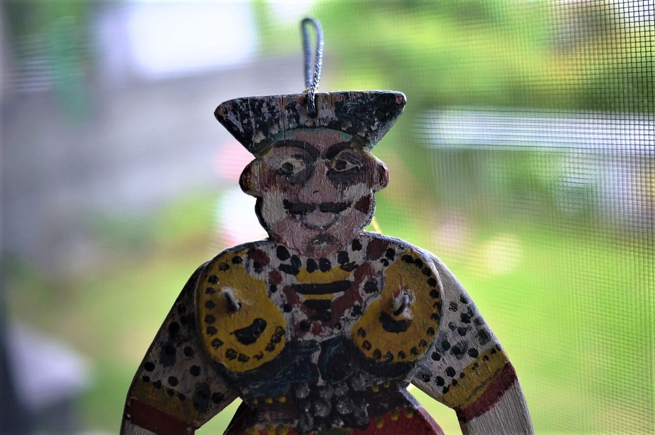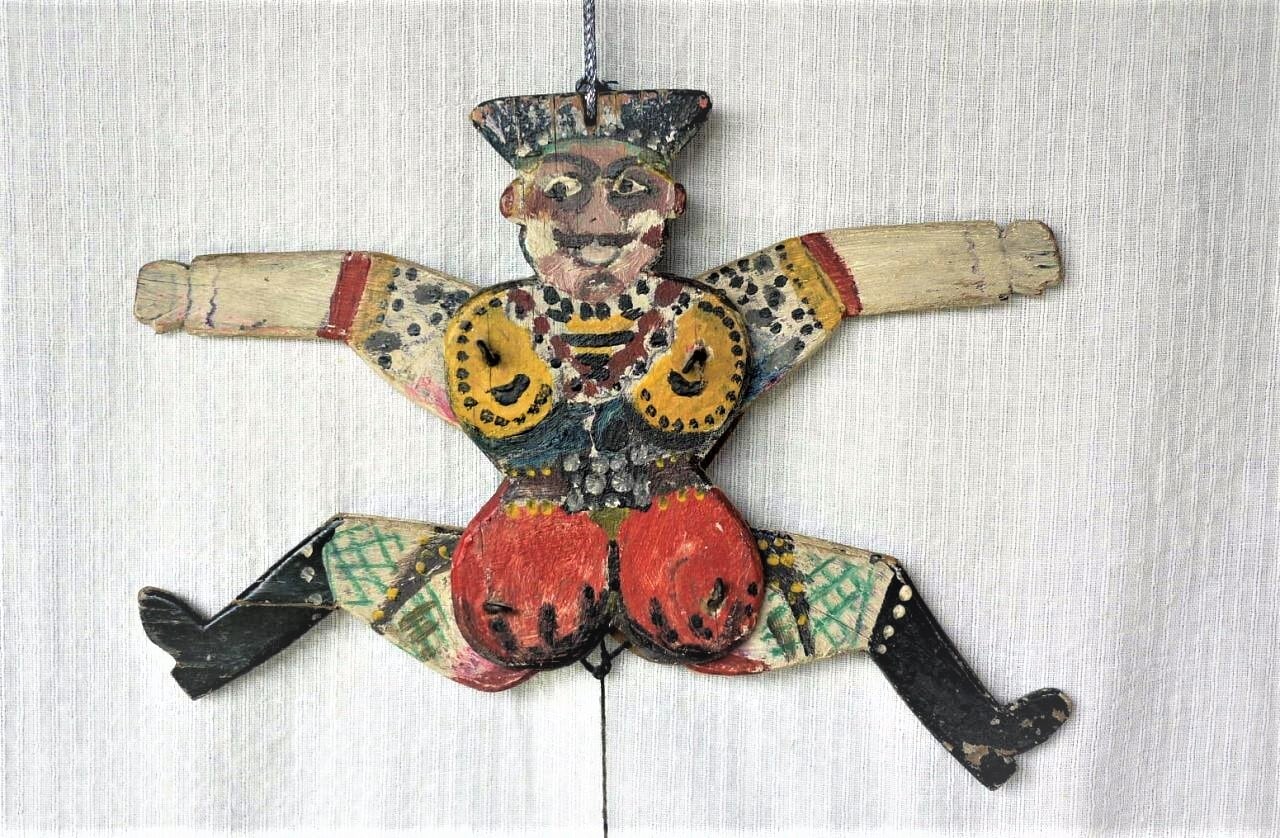 紐を引くと手足が吊り上がる仕掛け人形です。