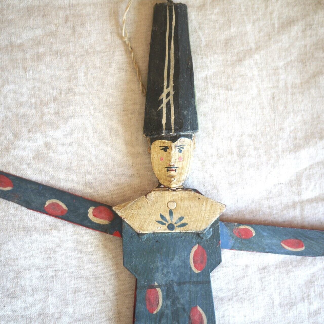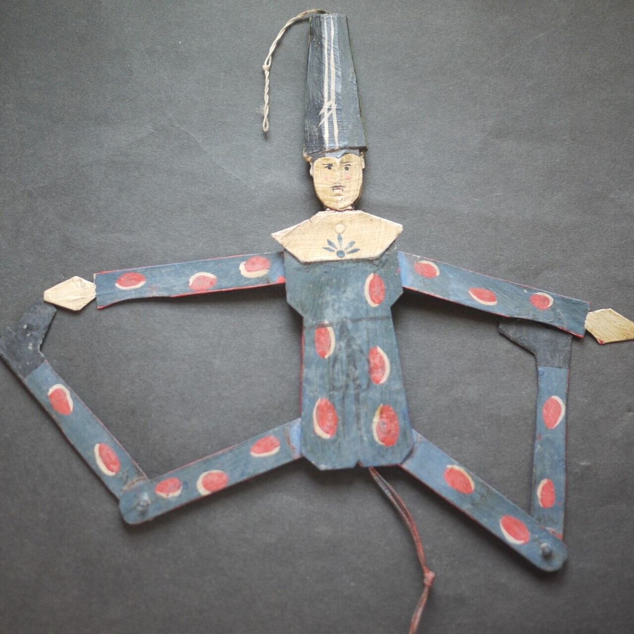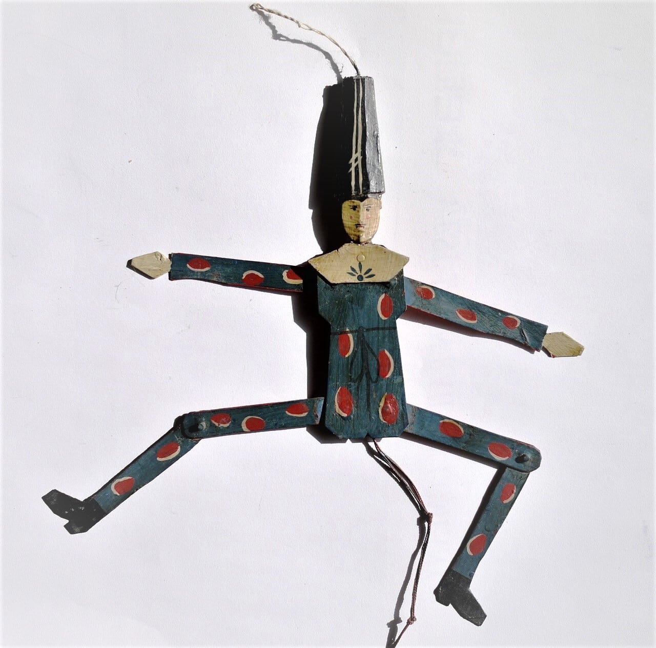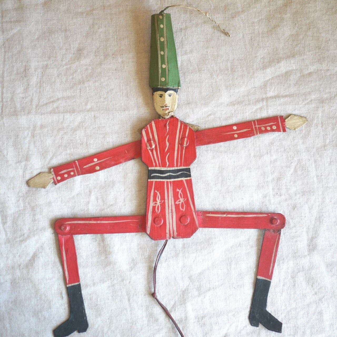 紐を引くと手足が持ち上がる仕掛け人形です。
