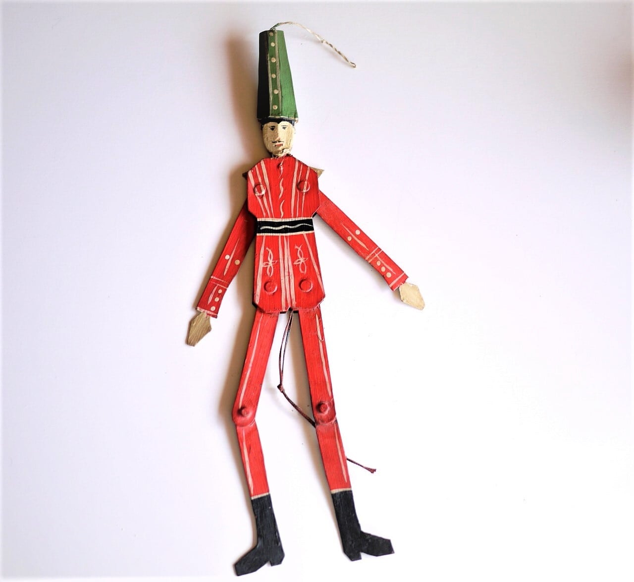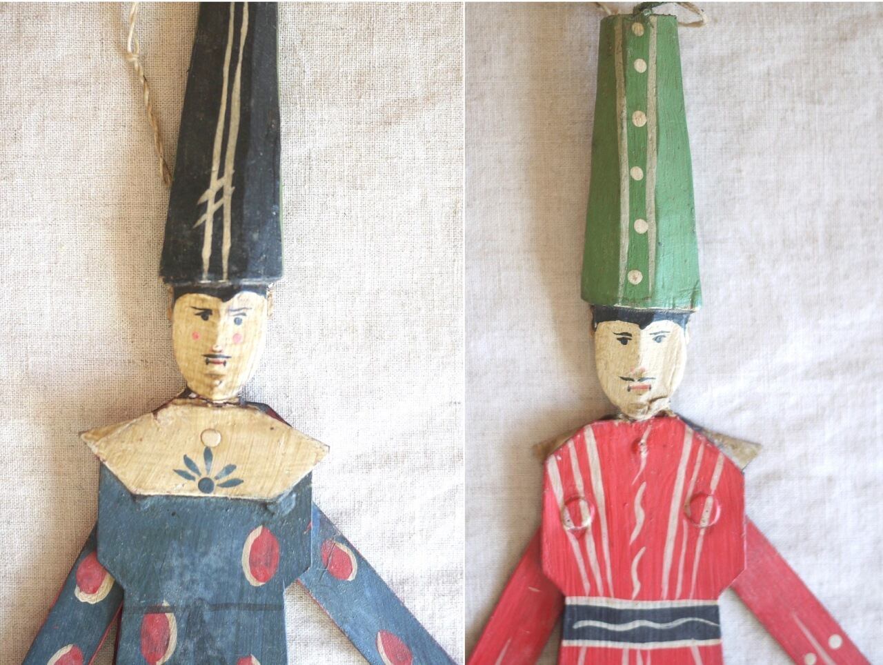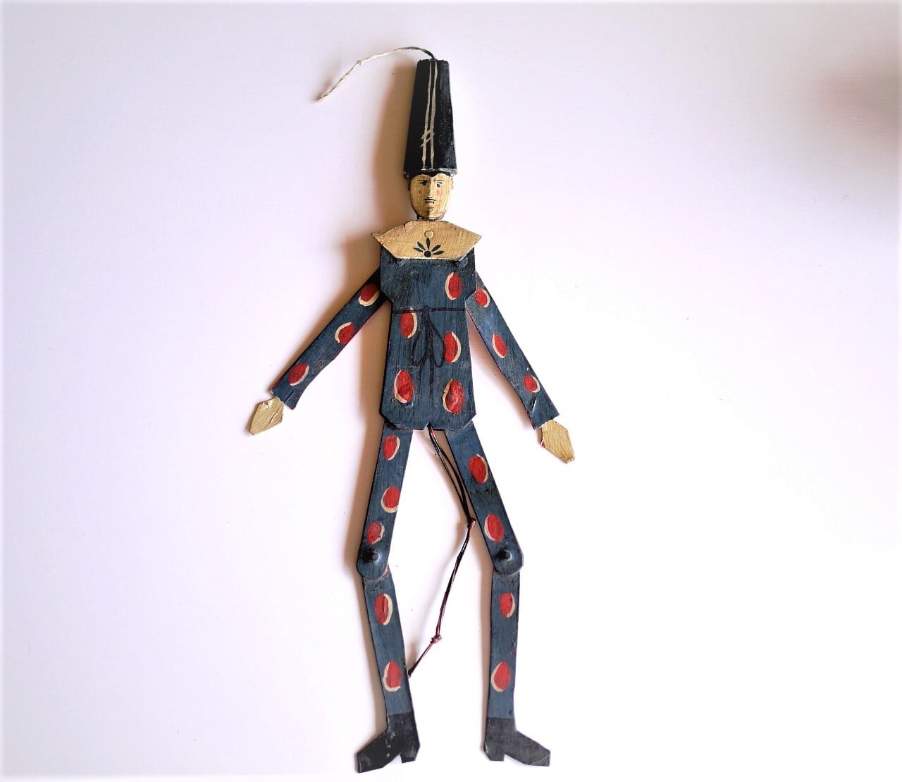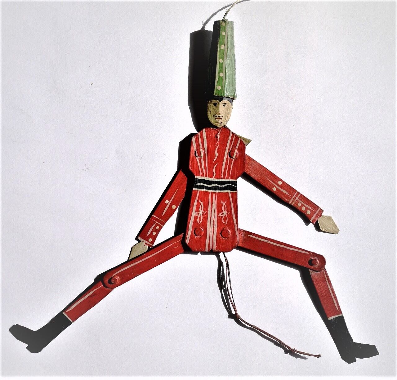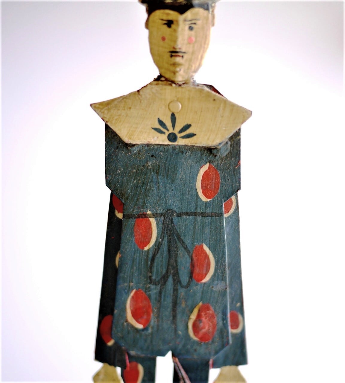 紐を引くと手足が持ち上がる仕掛け人形です。