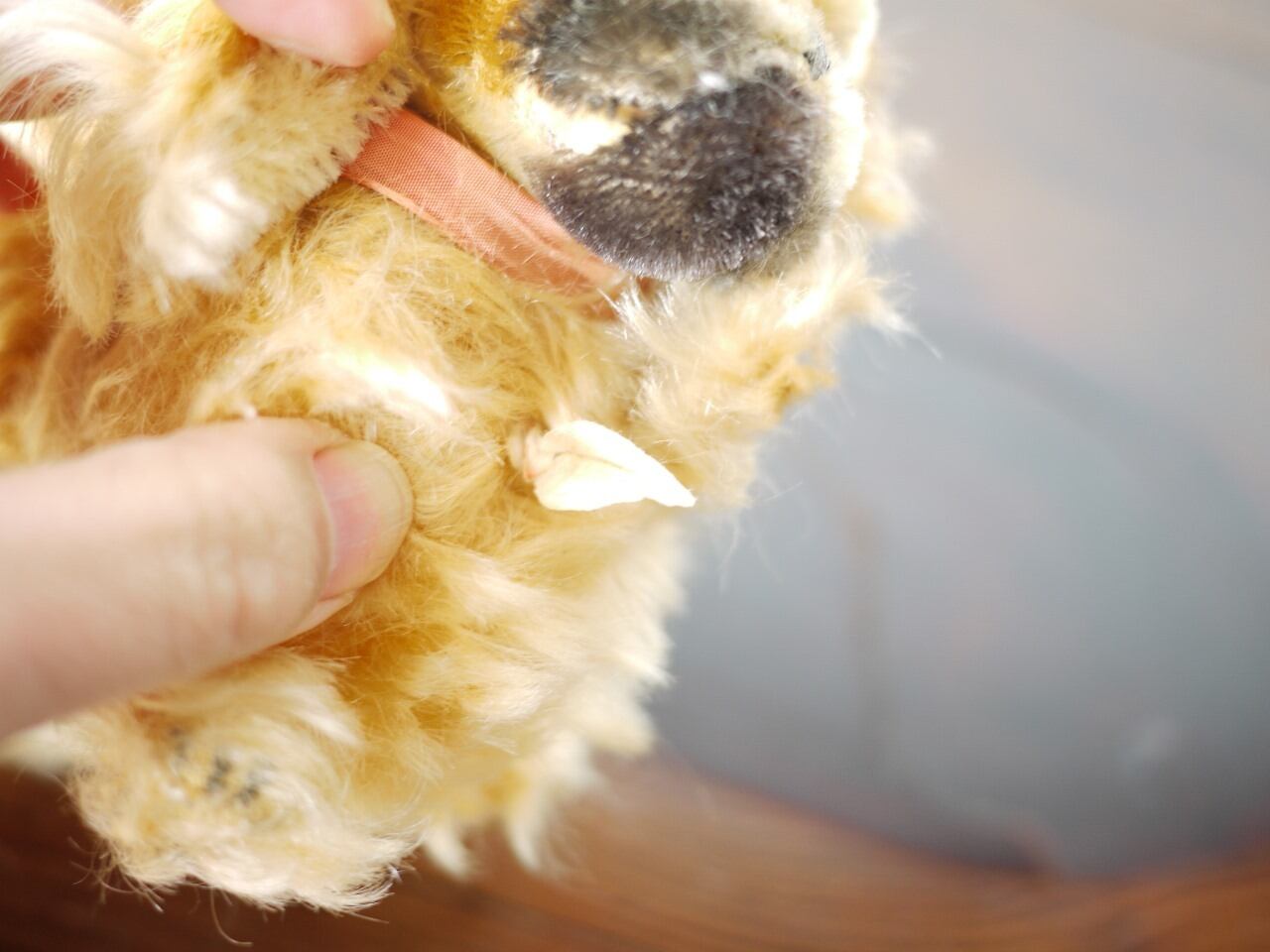 耳にボタンとタグ、胸元に紙タグの残りがあります。