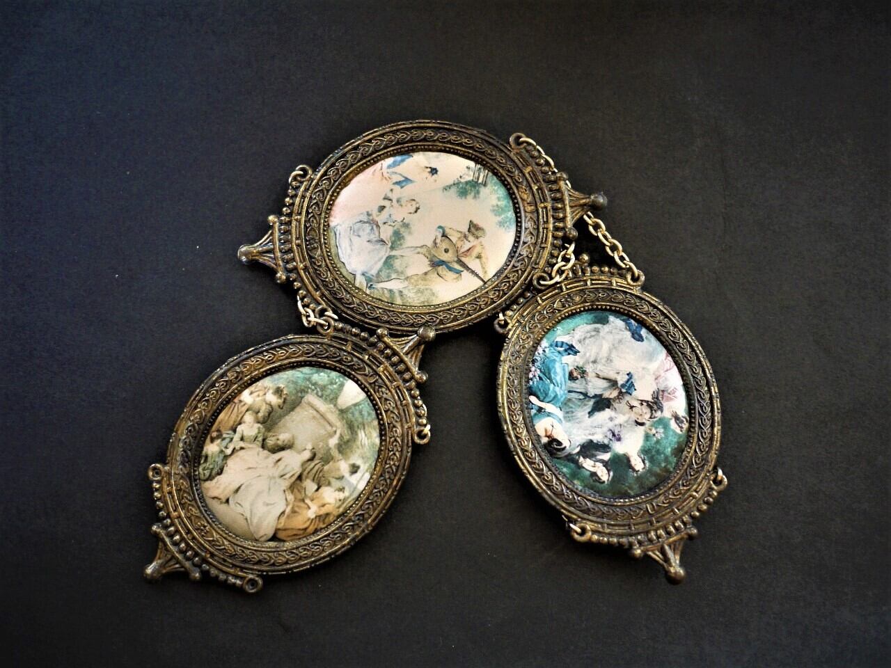 ヴィンテージ イタリア 3連真鍮額 ロココ絵画 オーバルミニフレーム シルク絵