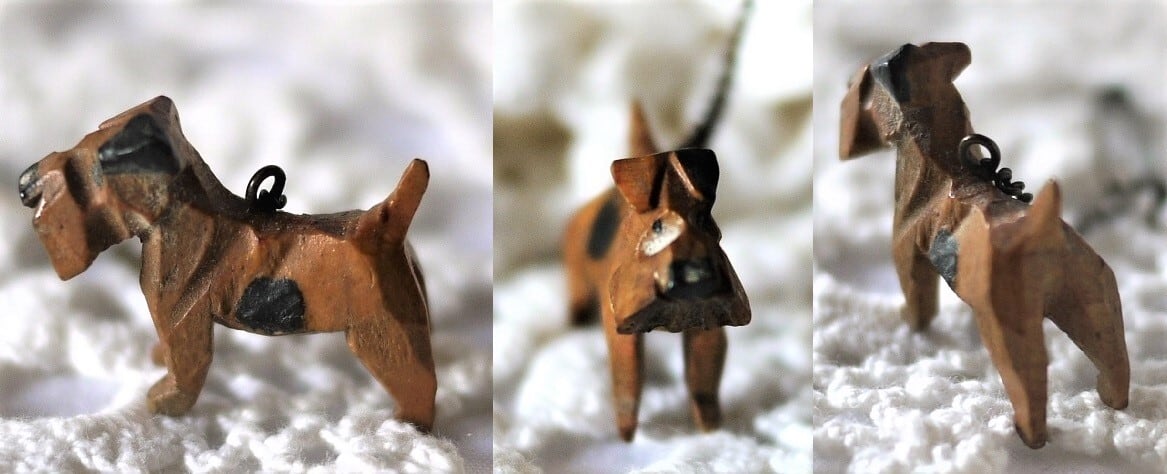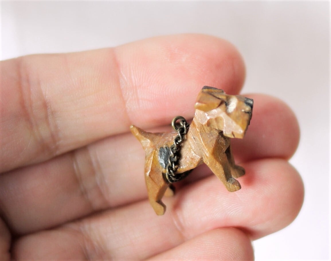 木彫りの小さな犬、細いチェーンでぶら下がるタイプです。