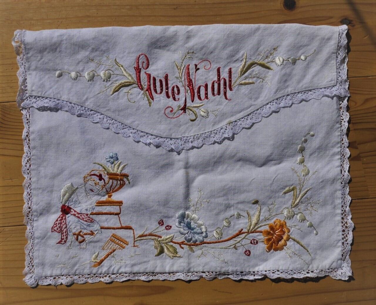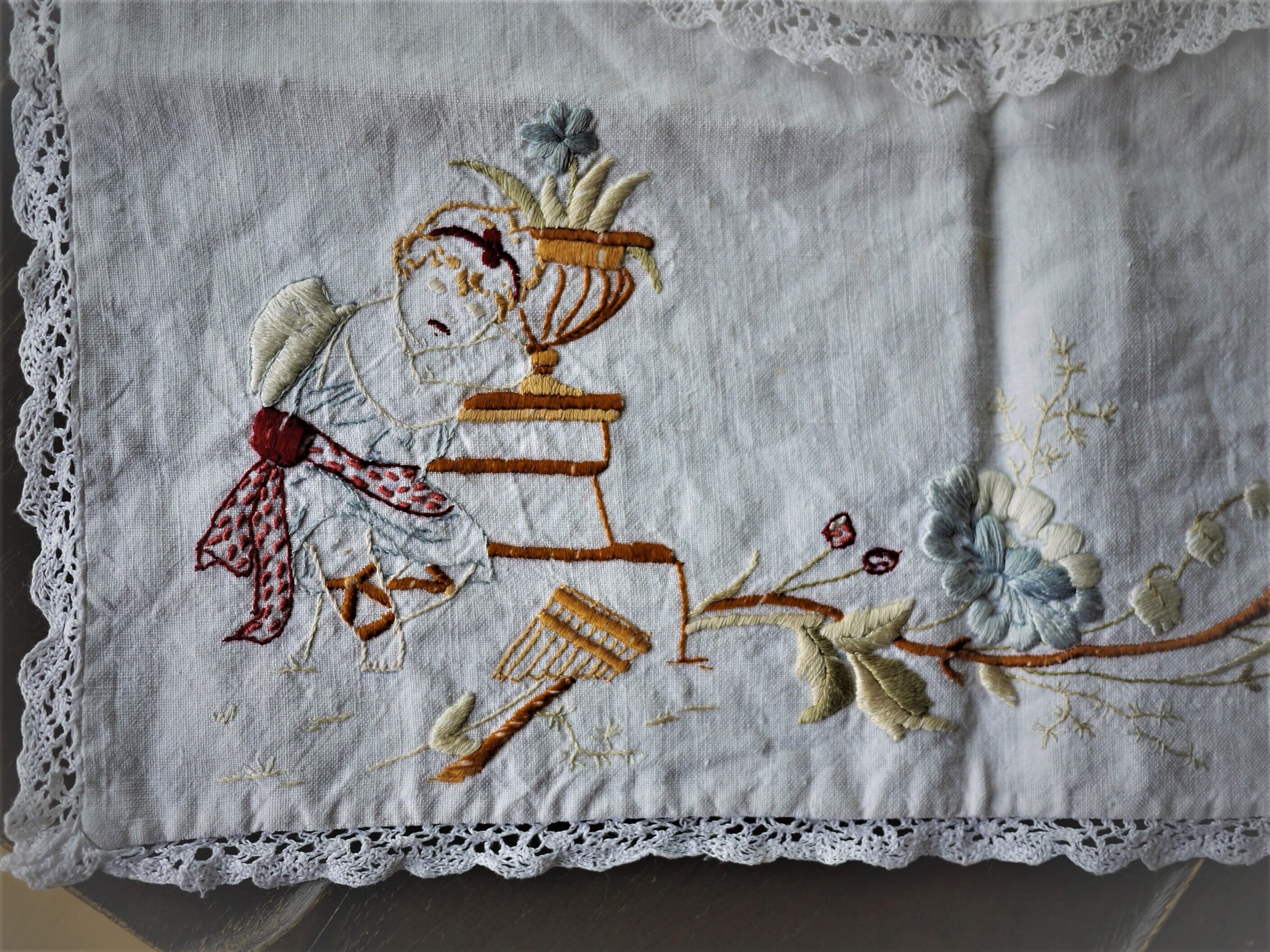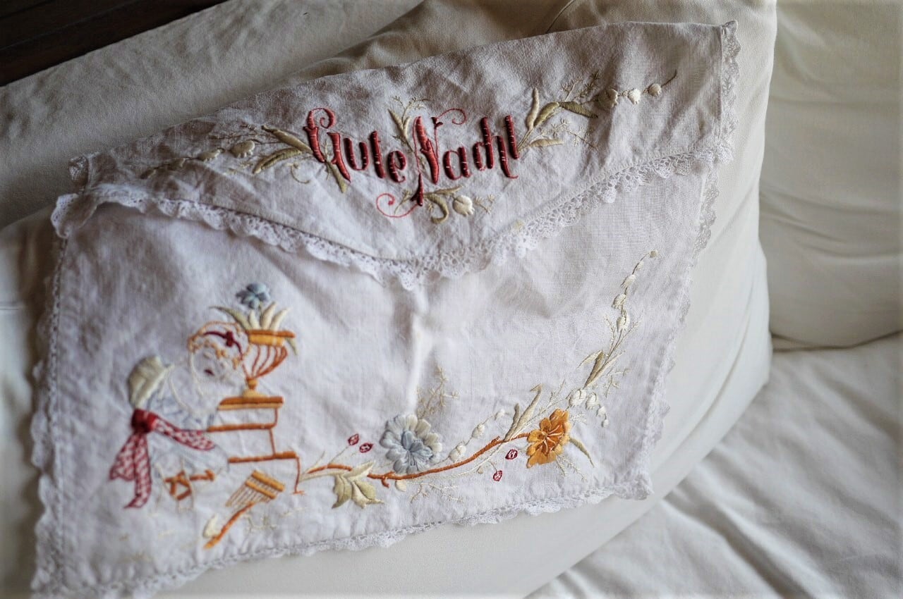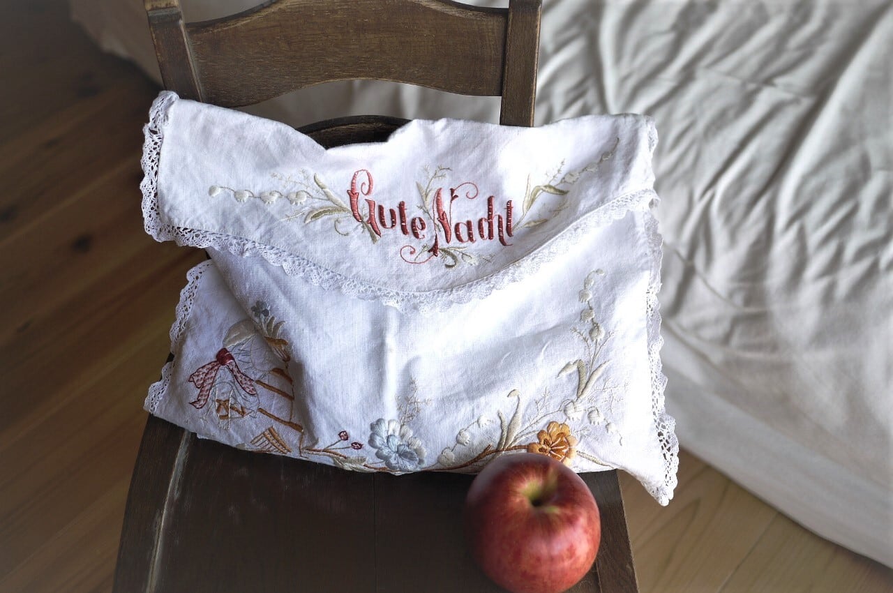 サテンステッチの花と少女 ナイティケース リネンとレース