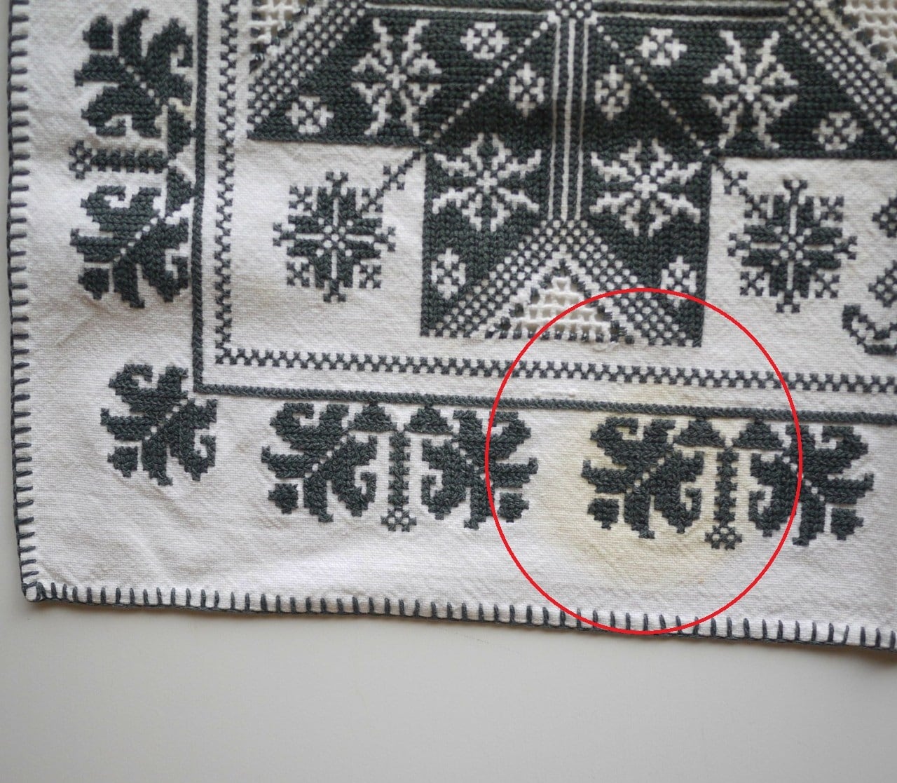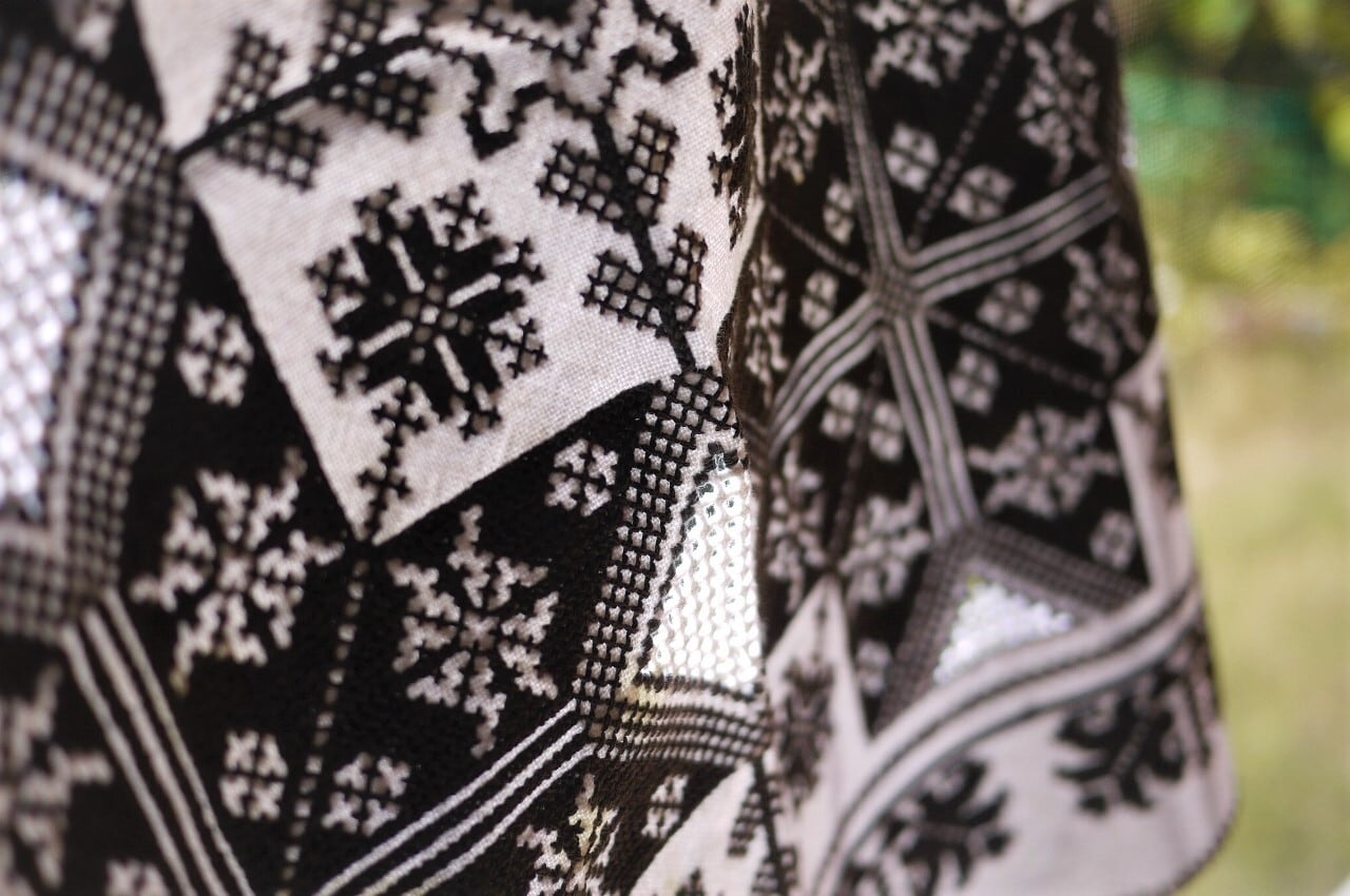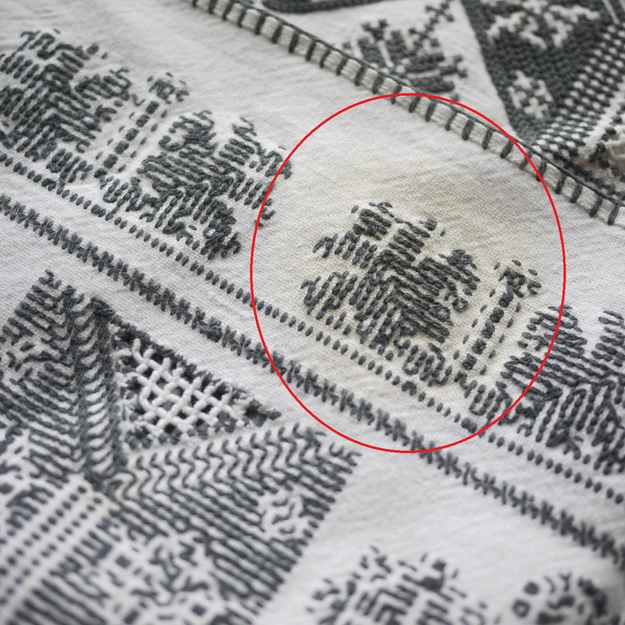 オフホワイト地に黒もしくはダークグリーンの糸で刺されており、