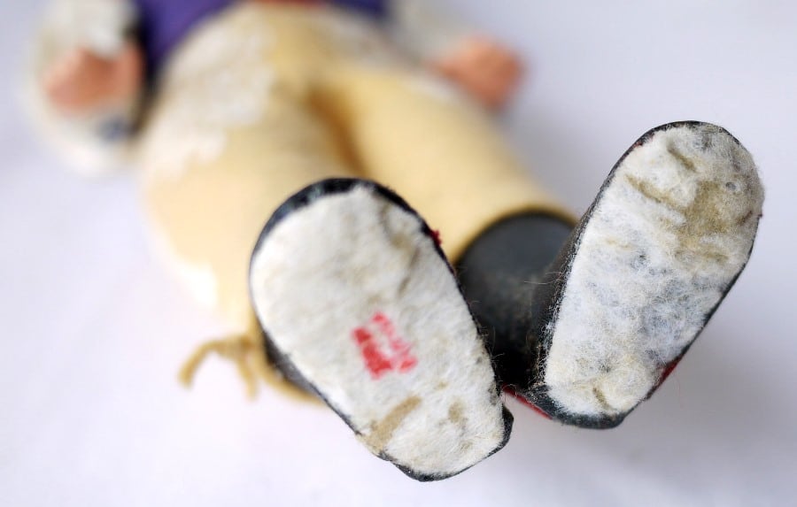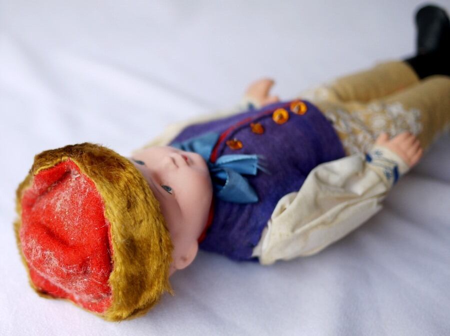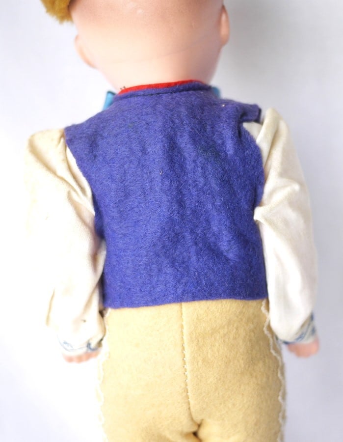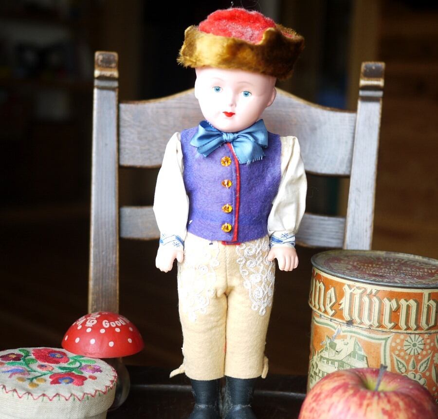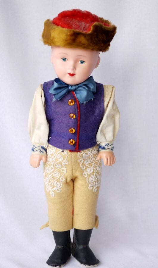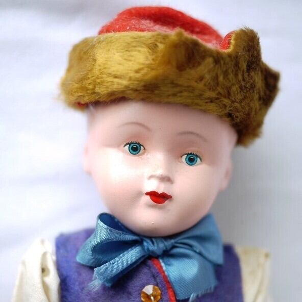 頭に毛皮を模した帽子の男の子、民族衣装人形です。