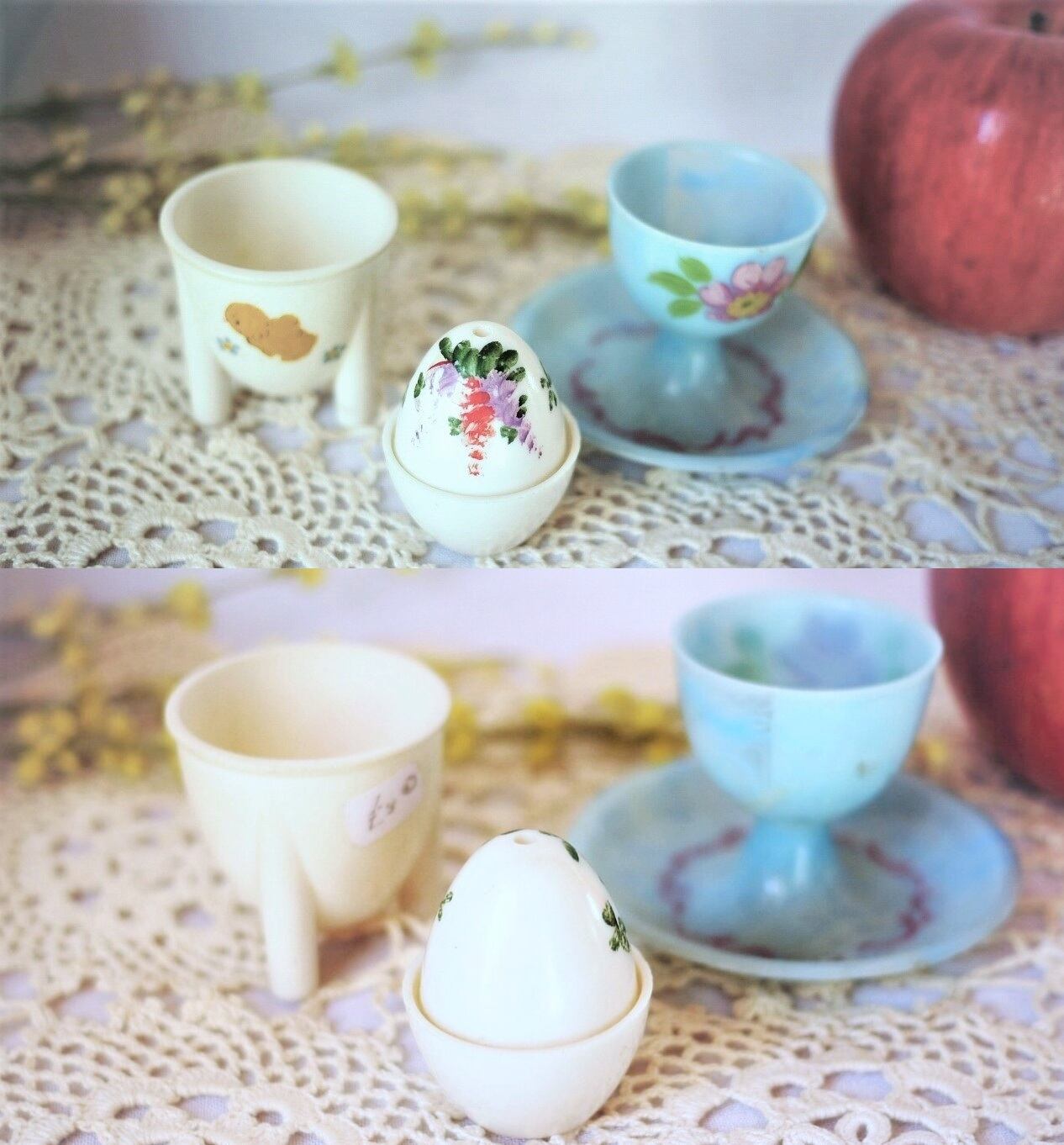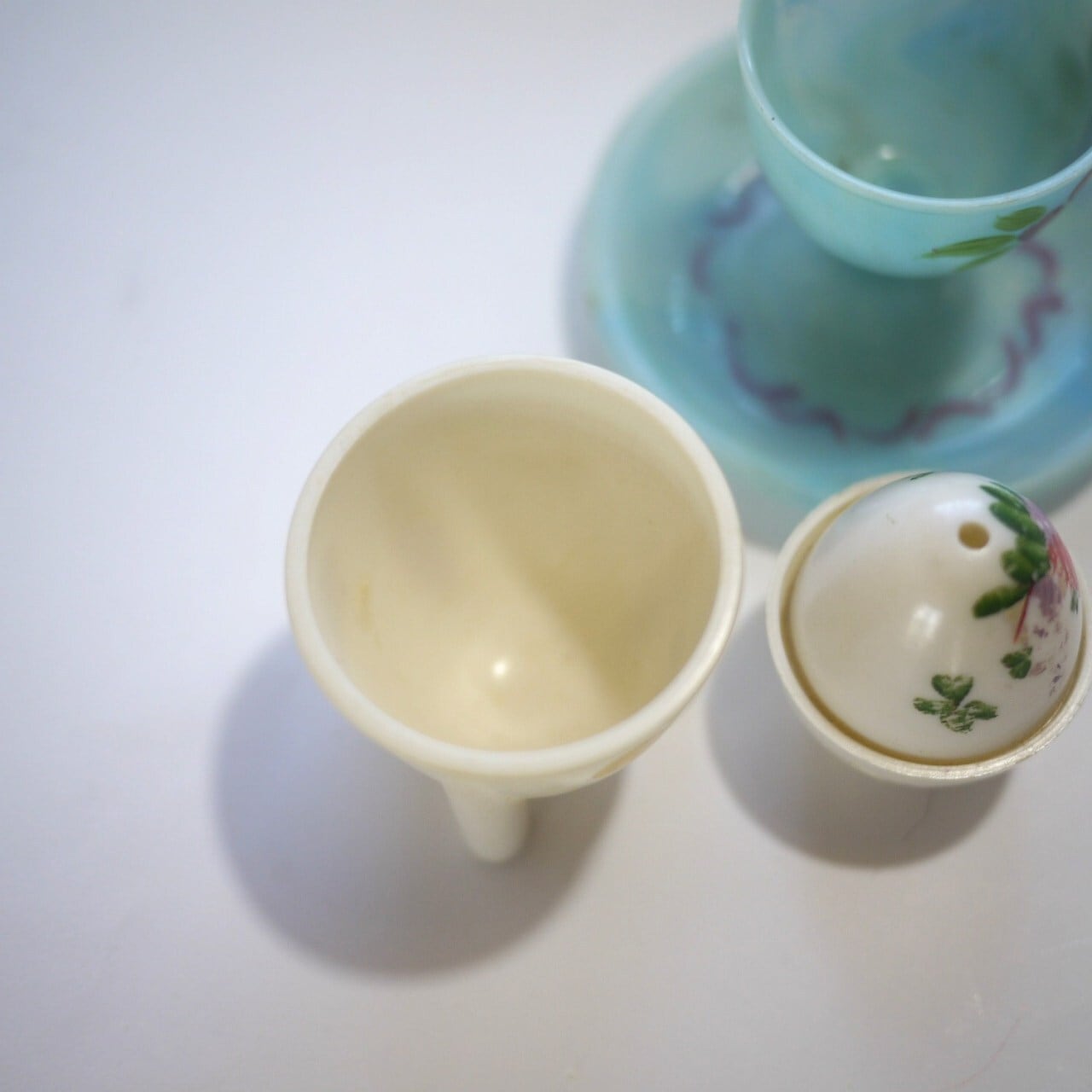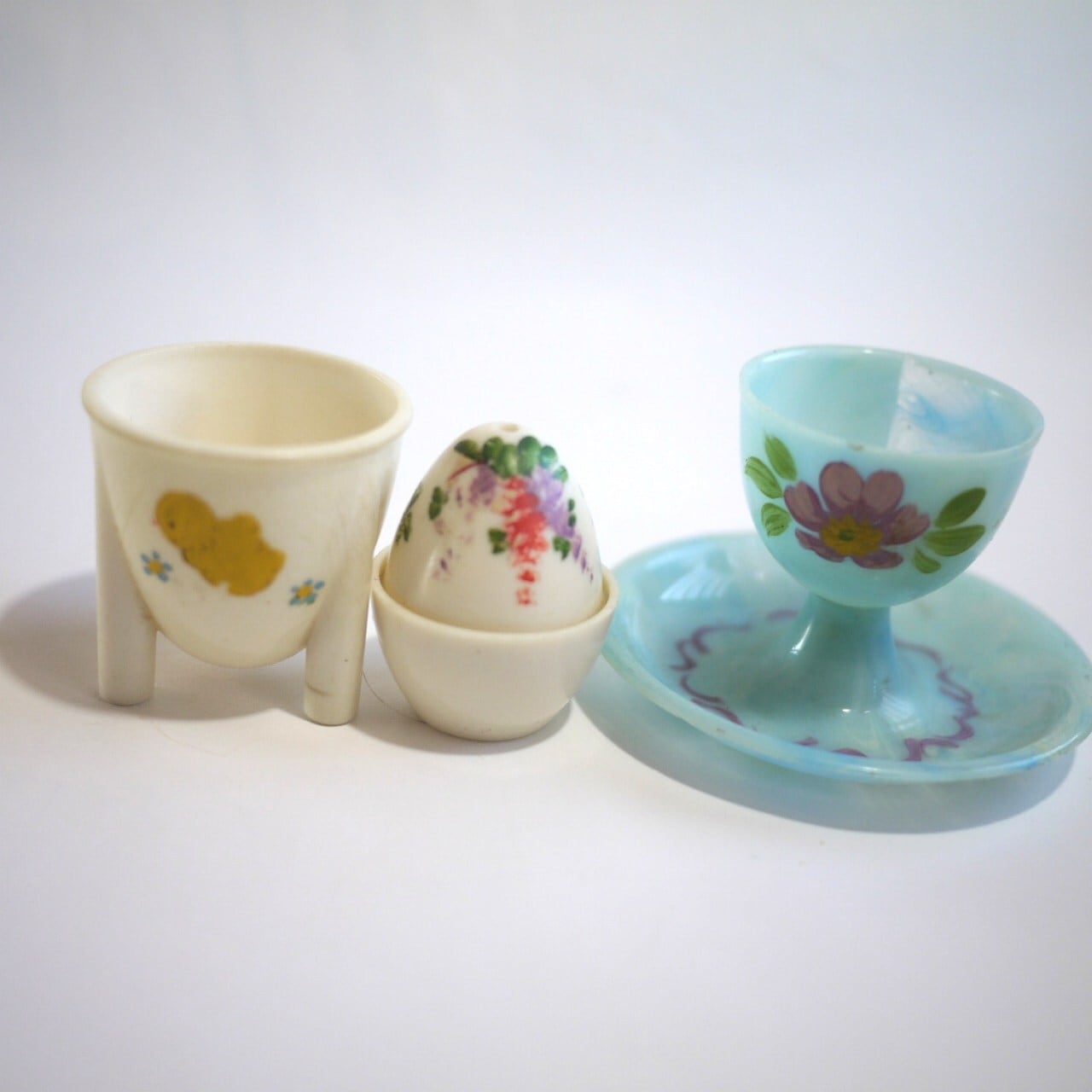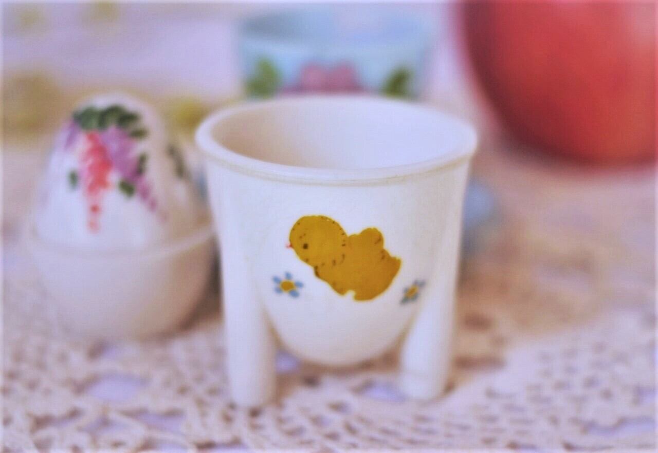 古いプラスチック製のエッグスタンド2個と塩入れ。