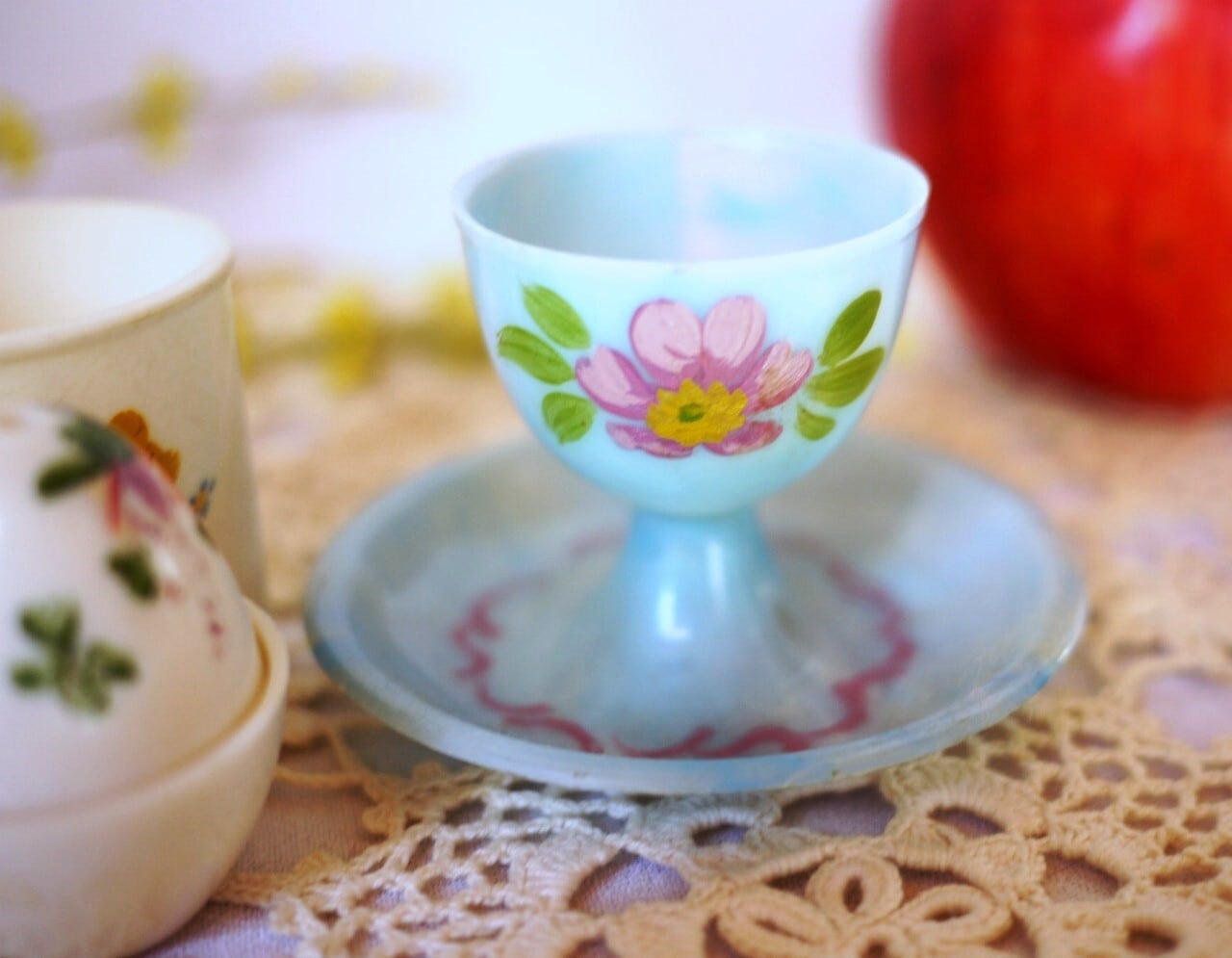 水色の、花模様のエッグスタンド