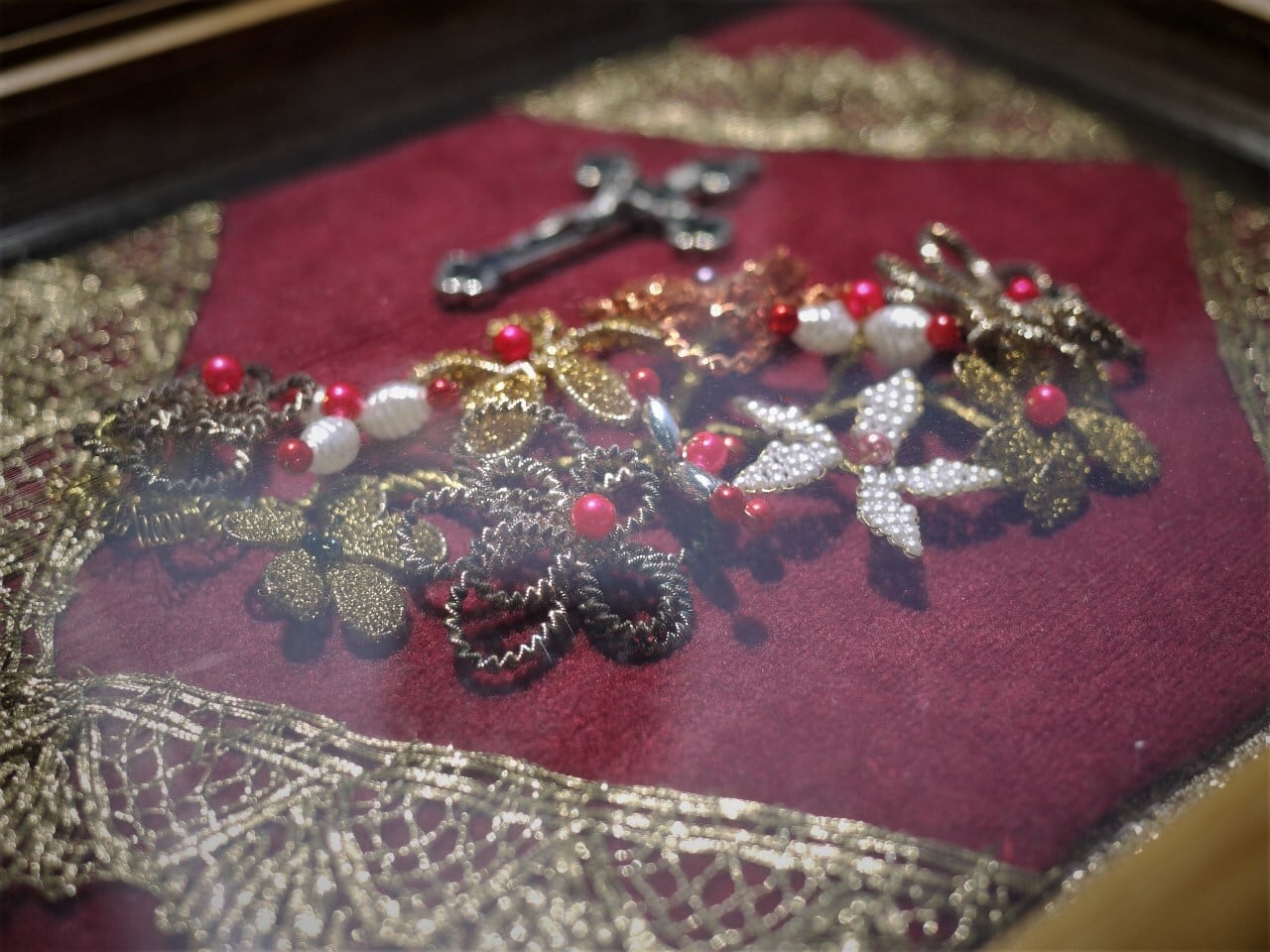 宗教的なモチーフを金色のレースやリボンで飾る、