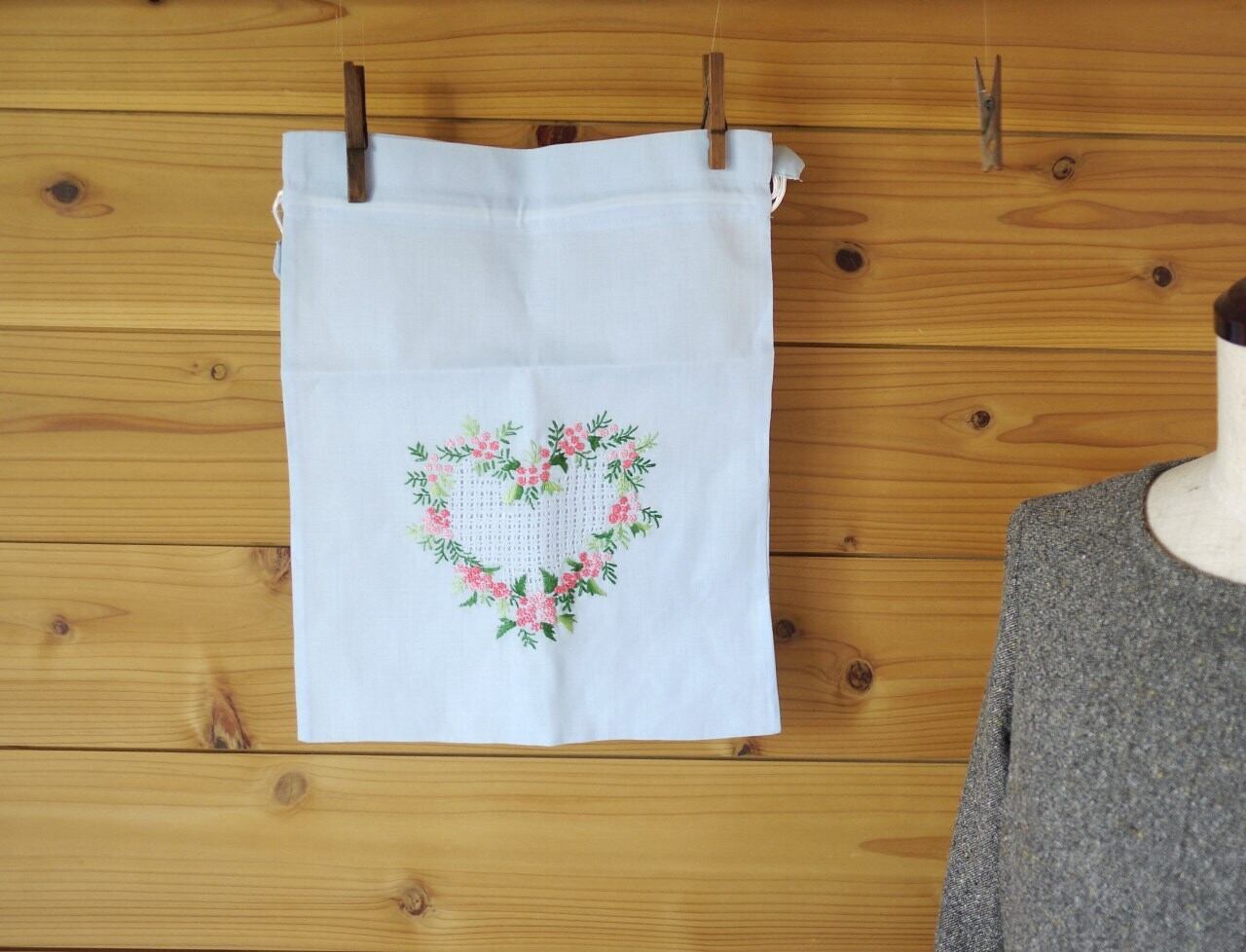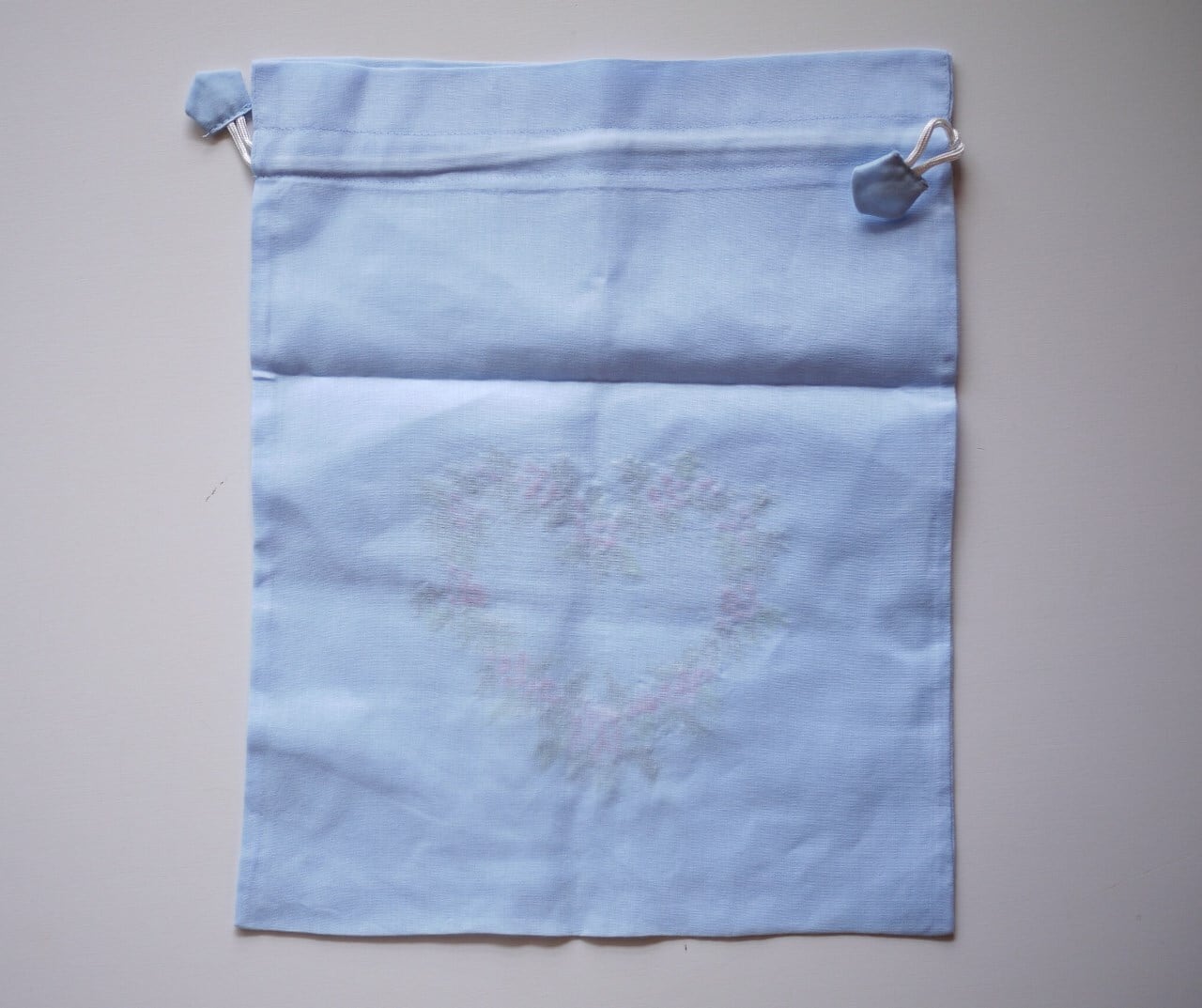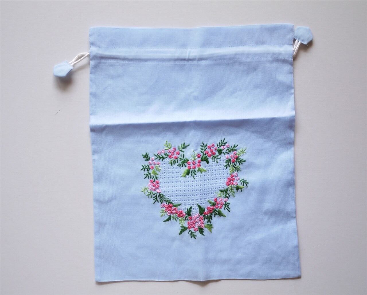 花刺繍の巾着袋 ハートのリース刺繍 水色コットン