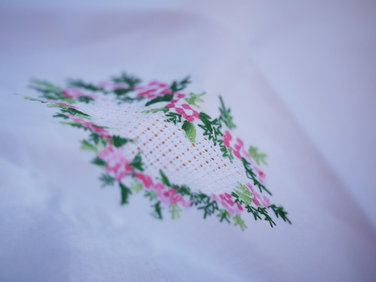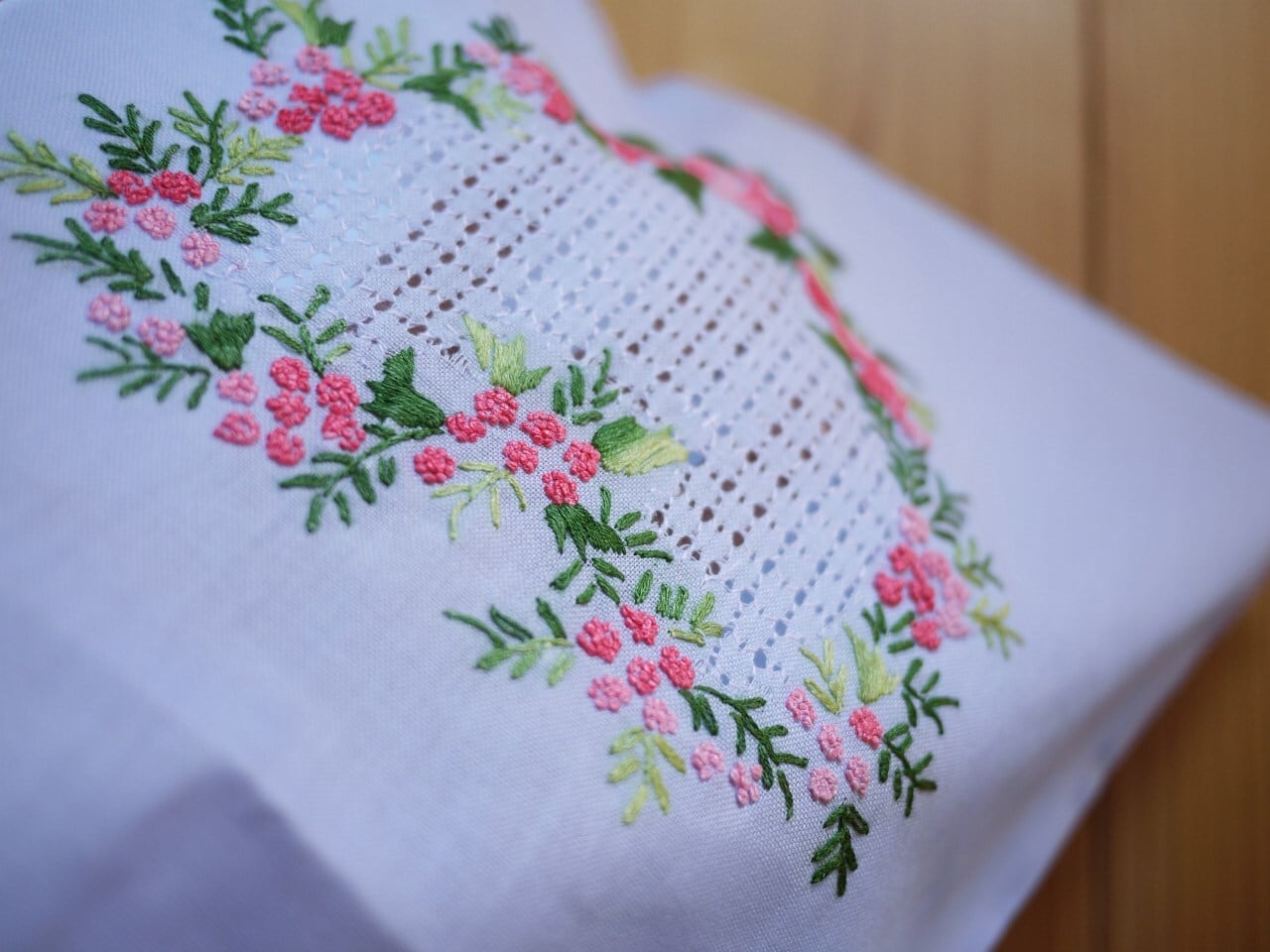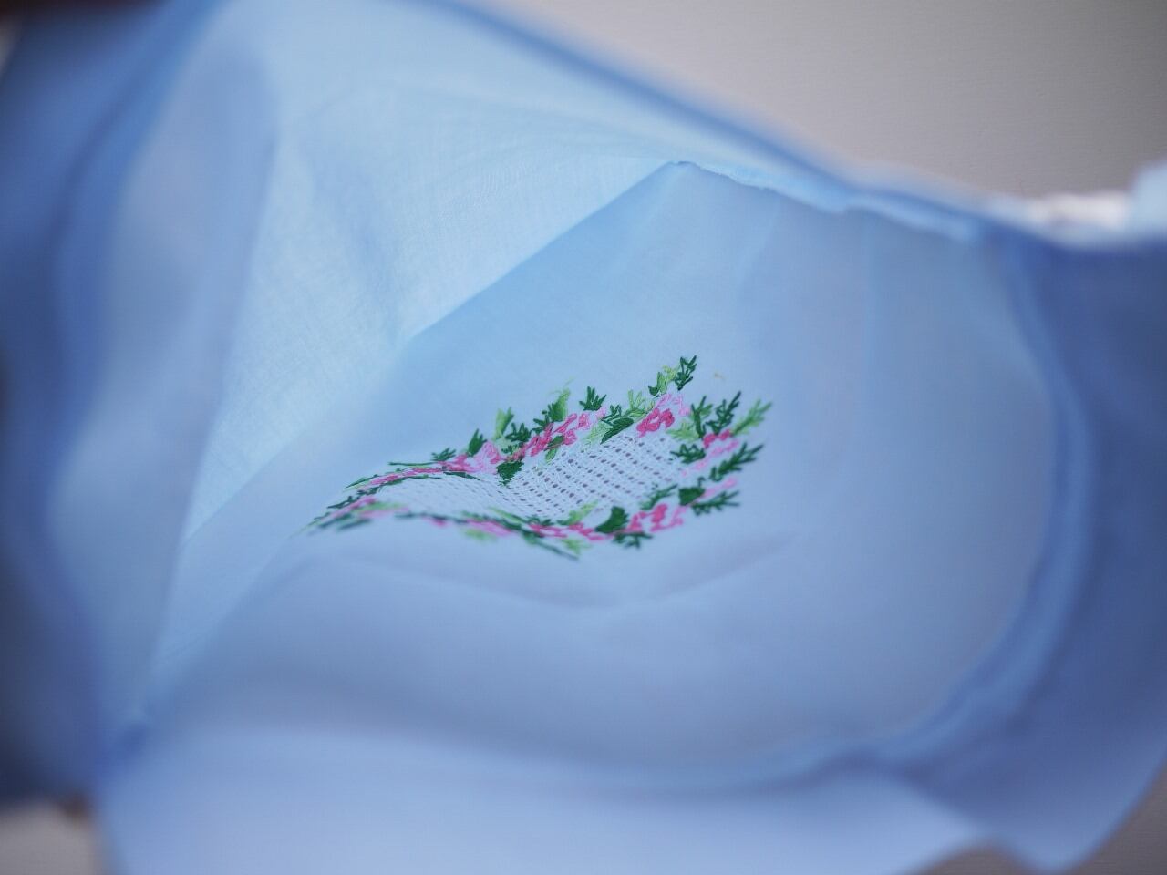 花刺繍の巾着袋 ハートのリース刺繍 水色コットン