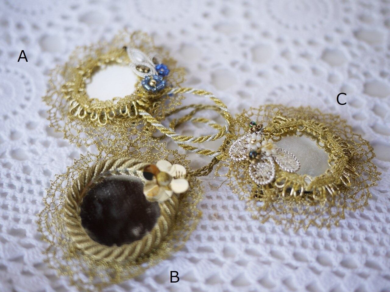 主に解れの修復や、レースの境目かくしに控えめなBouillon細工を添えています。