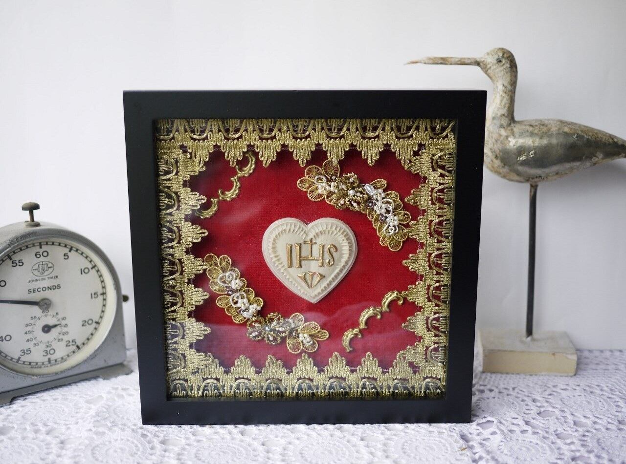 深紅のベルベットに金色の飾りを使った華やかな額装です。