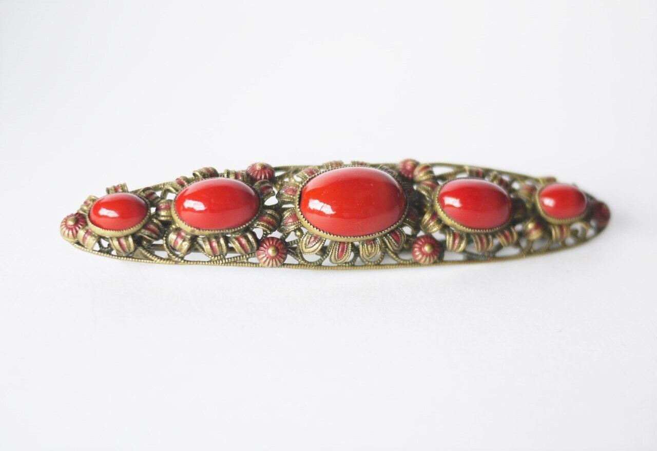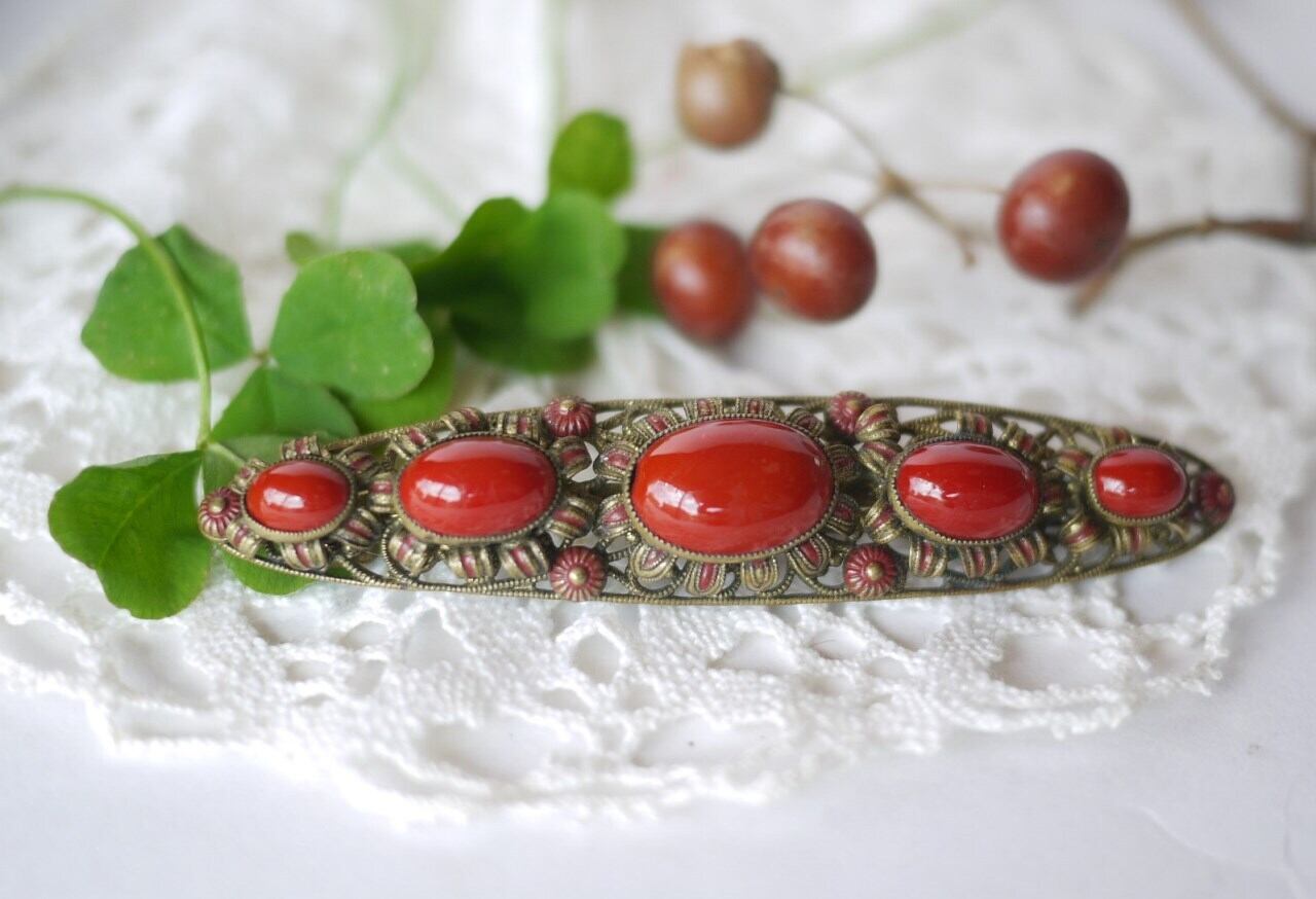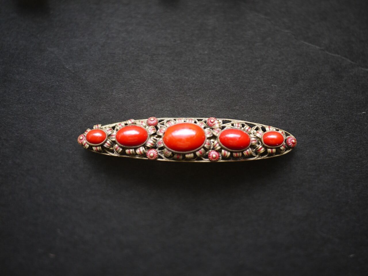 赤いオーバルの石が並んだ一文字型のブローチ。
