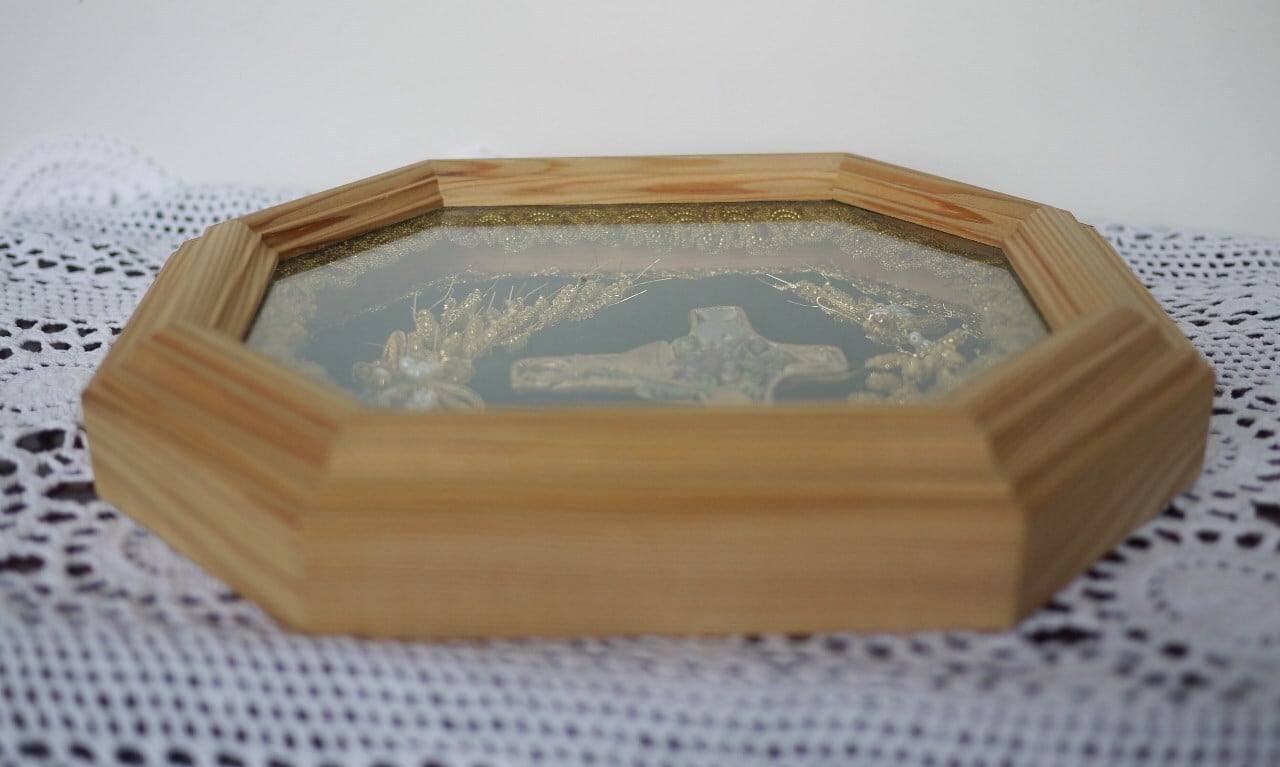 木製の額縁で、伝統的なテーマの作品が出来上がりました。